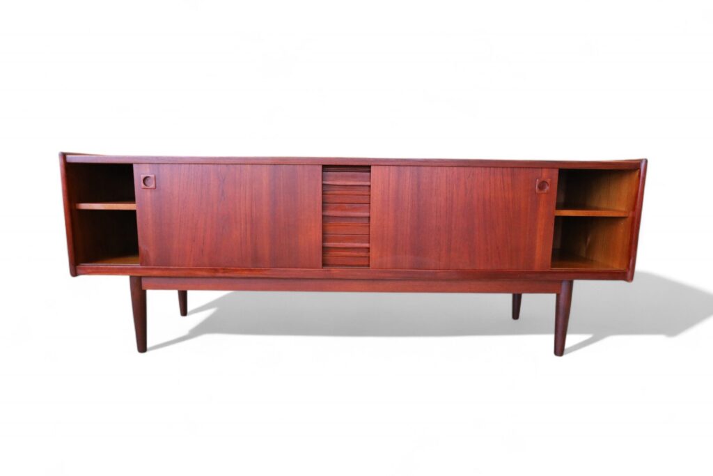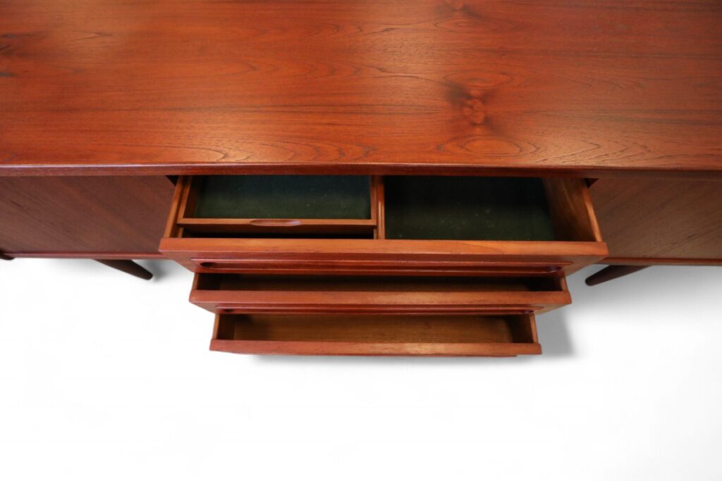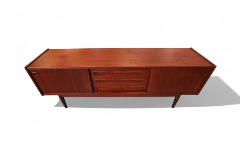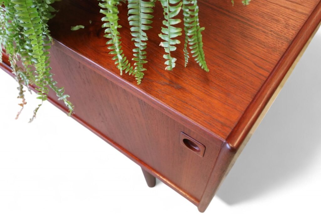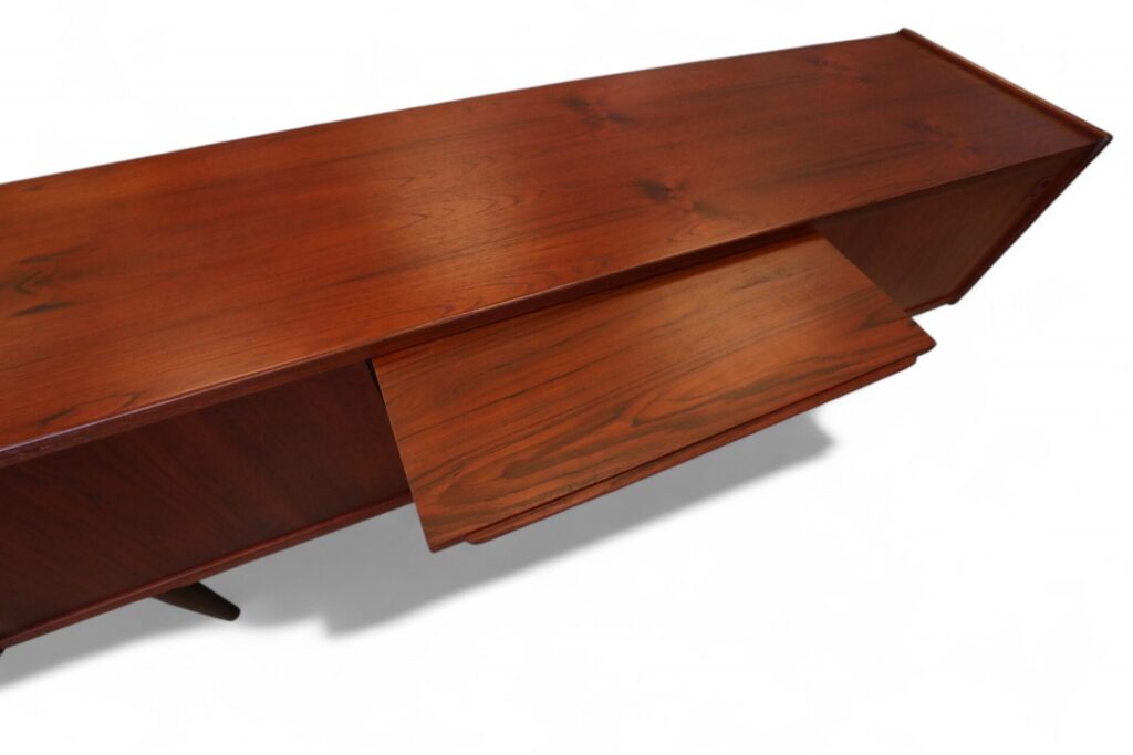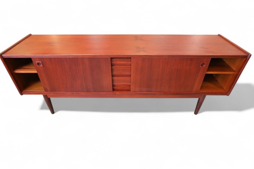 Ett makalöst vackert och smakfullt sidebord av allra högsta kvalité! Sideboardet är formgivet av Johannes Andersen för Uldum Møbler i Danmark och har långa eleganta linjer i en teak i en något mörkare ton. Ådringen på alla ytor är mycket vacker och även inredningen i skåpet är i ädelträ.