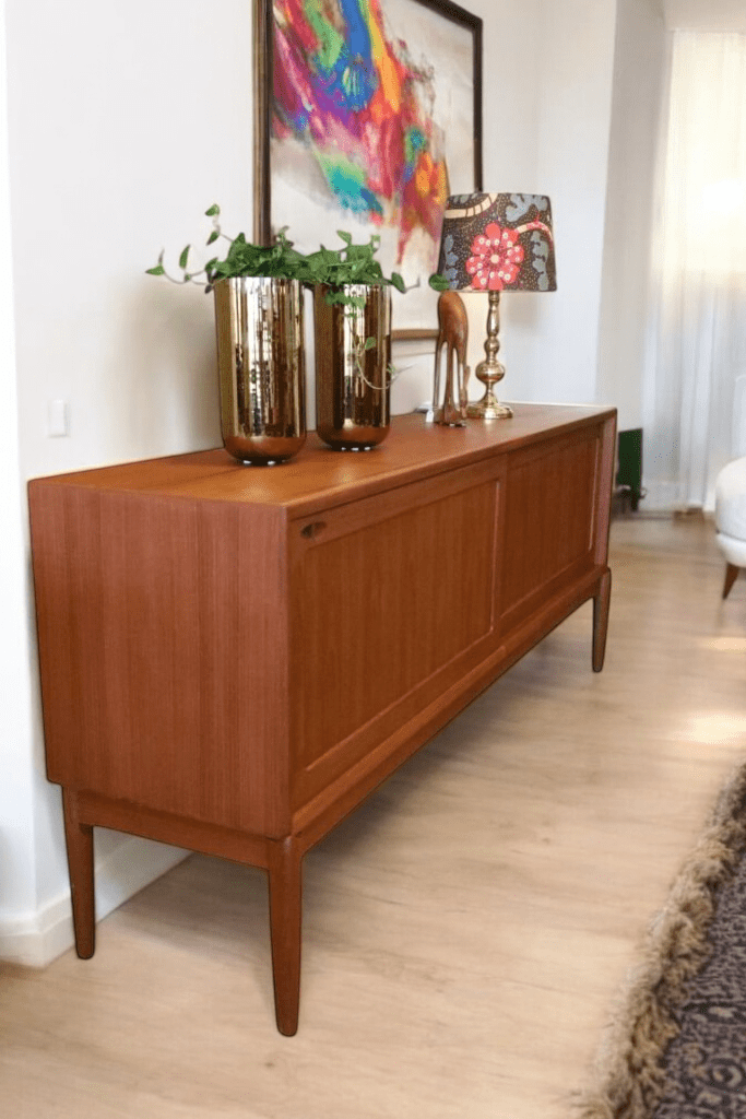 Sideboardet har två skjutluckor med bakomstående hyllplan, vilket ger en praktisk och funktionell förvaringslösning som passar perfekt i alla hem. Hyllplanen är både flytt- och uttagbara, vilket innebär att du kan justera dem helt efter dina egna behov och önskemål. Med denna flexibilitet kan du skapa den perfekta layouten för att passa dina föremål. Dessutom är hyllplanen djupa, vilket skapar gott om förvaring och gör det lättare att organisera och hålla ordning på dina saker. Inreningen är även den i teak.