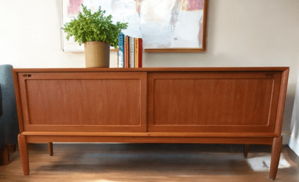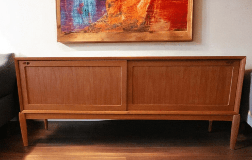 Ett oerhört sällsynt och tidlöst sideboard i teak, designat av formgivaren Henry W. Klein för det välrenommerade företaget Bramin Møbler i Danmark. Detta fantastiska sideboard är inte bara en möbel utan också ett exempel på exceptionell hantverksskicklighet och en perfekt fusion av funktionalitet och tidlös elegans.