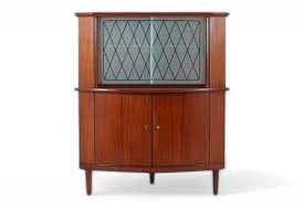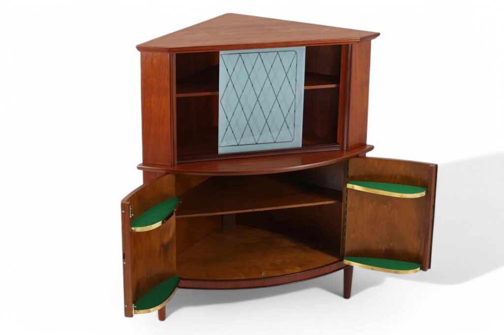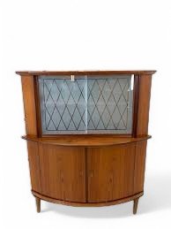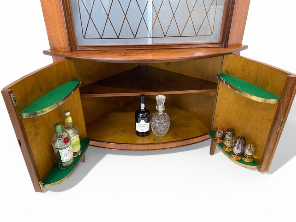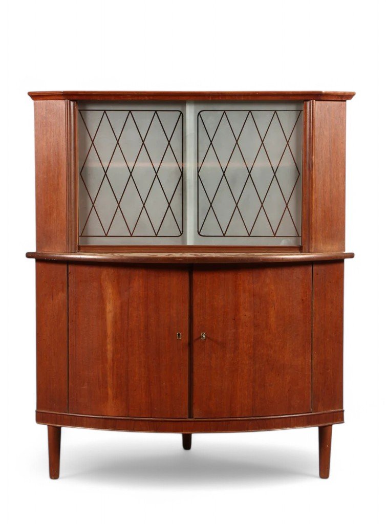 Ett fantastiskt vackert hörnskåp i teak med vitrinluckor i överdelen samt välvda teakdörrar i underdelen.