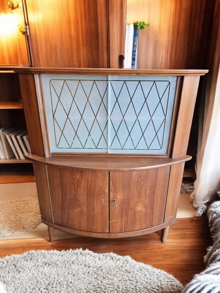 Övre luckorna är skjutluckor i glas med tidstypiskt rutat mönster och i skåpet finns ett hyllplan. Den lite händige kan enkelt sätta in en diodlist för att belysa vitrinskåpet och därmed få en extra dimension av skåpet! Det finns avställningsyta att ställa glas för blandning av drinkar etc framför skjutluckorna,.