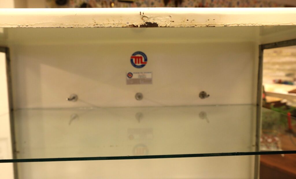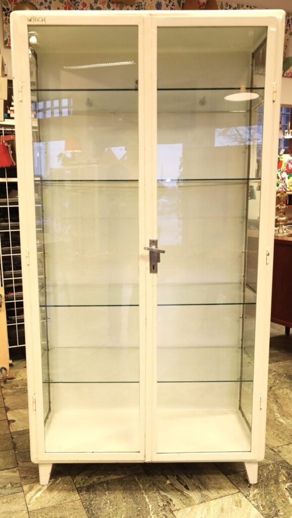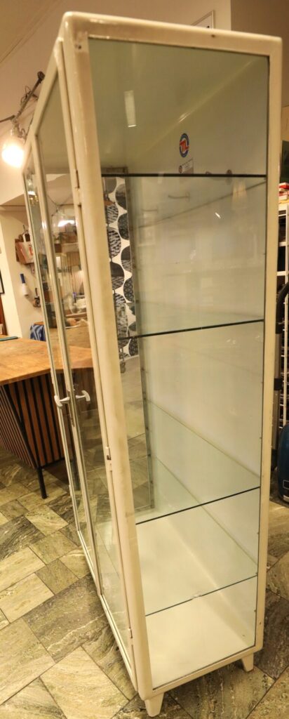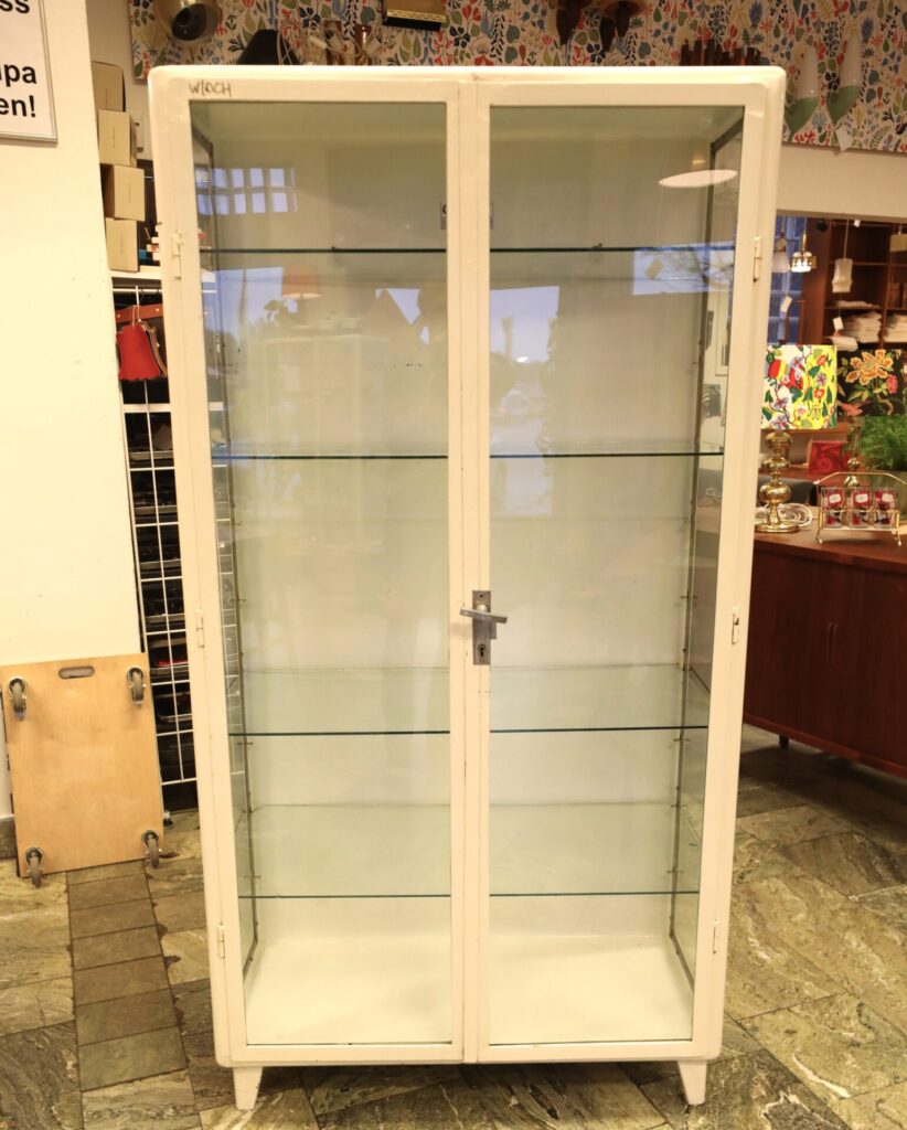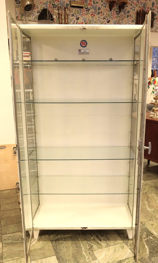 Skåpet är i målad metall och har två glasdörrar. Inuti skåpet finns tre hyllplan i glas som effektivt utnyttjar utrymmet och ger möjlighet till en optimal presentation av dina föremål. Om du vuill ha med så skickar vi med ett extra hyllplan som har lite defekter.