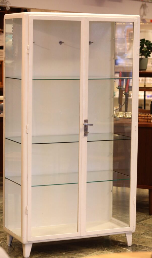 Dubbelt tandläkarskåp/läkarskåp i lackerad plåt samt glas.