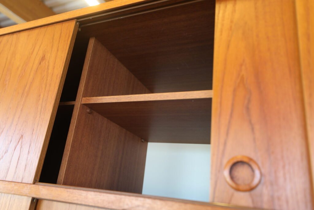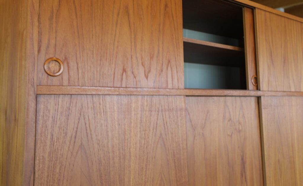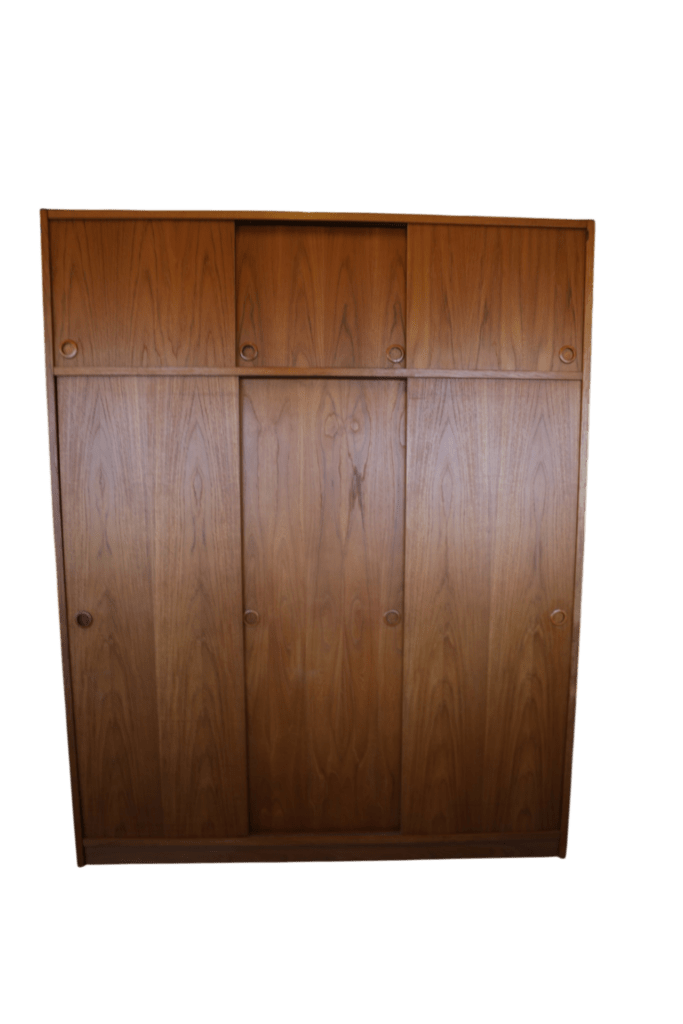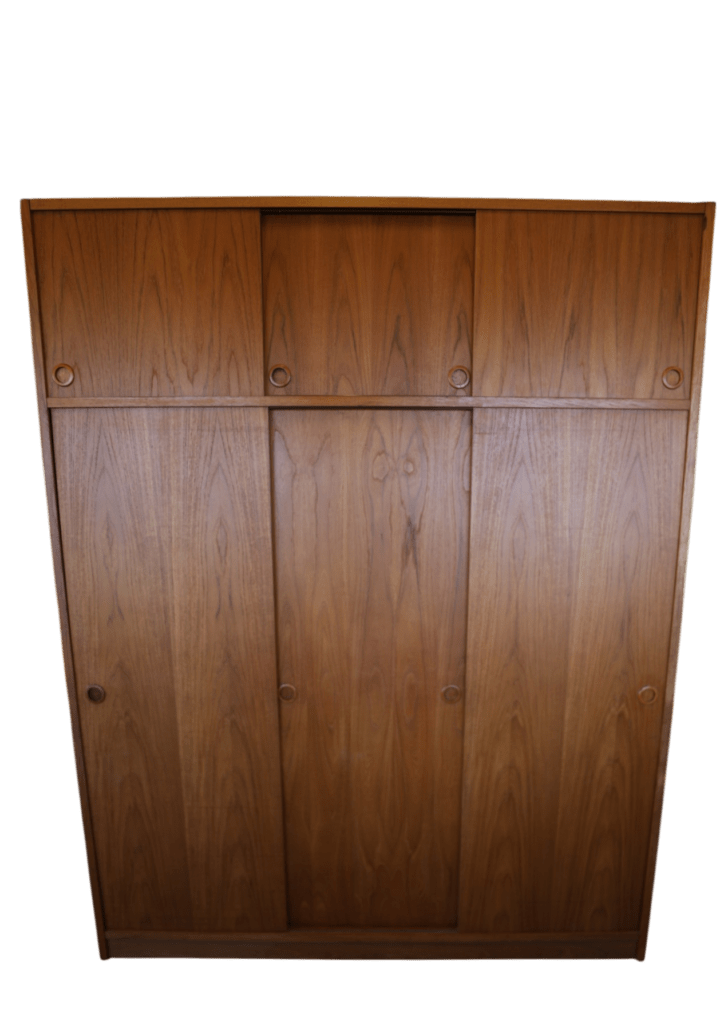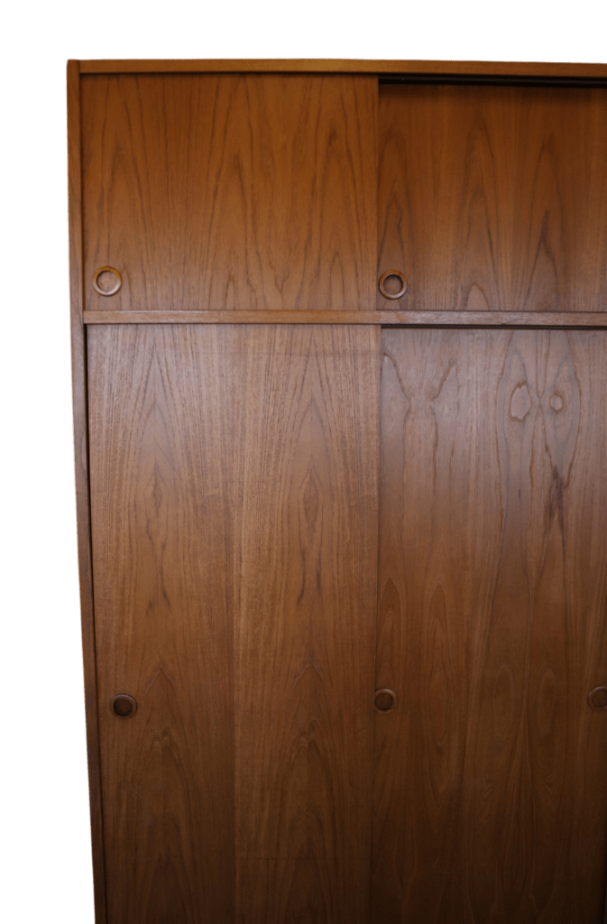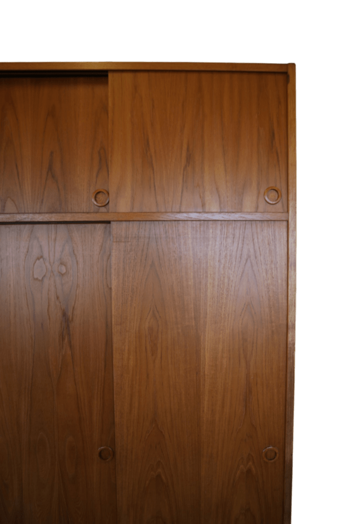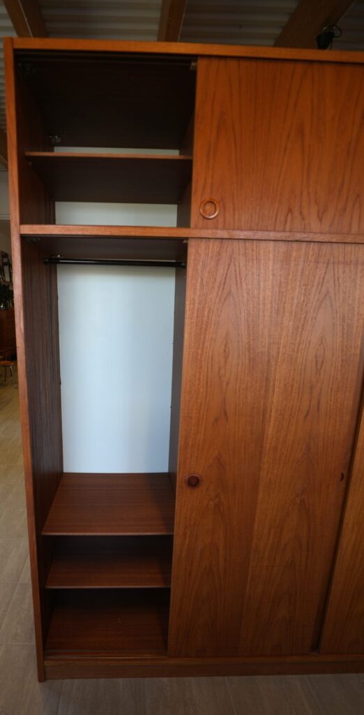 En fantastisk dansk garderob tillverkad av Tage Mogensen Møbelfabrik A/S med praktisk inredning. Garderoben är i gyllene brun teak med mycket fin ådring. Den har skjutluckor i två olika plan varav tre är större och tre är mindre och på samtliga skjutluckor sitter det runda integrerade handtag. Skjutluckorna gör att inga dörrar tar sin plats ut i rummet.