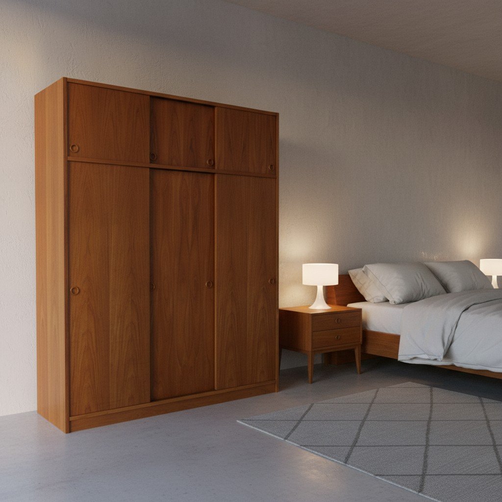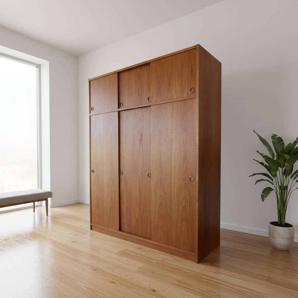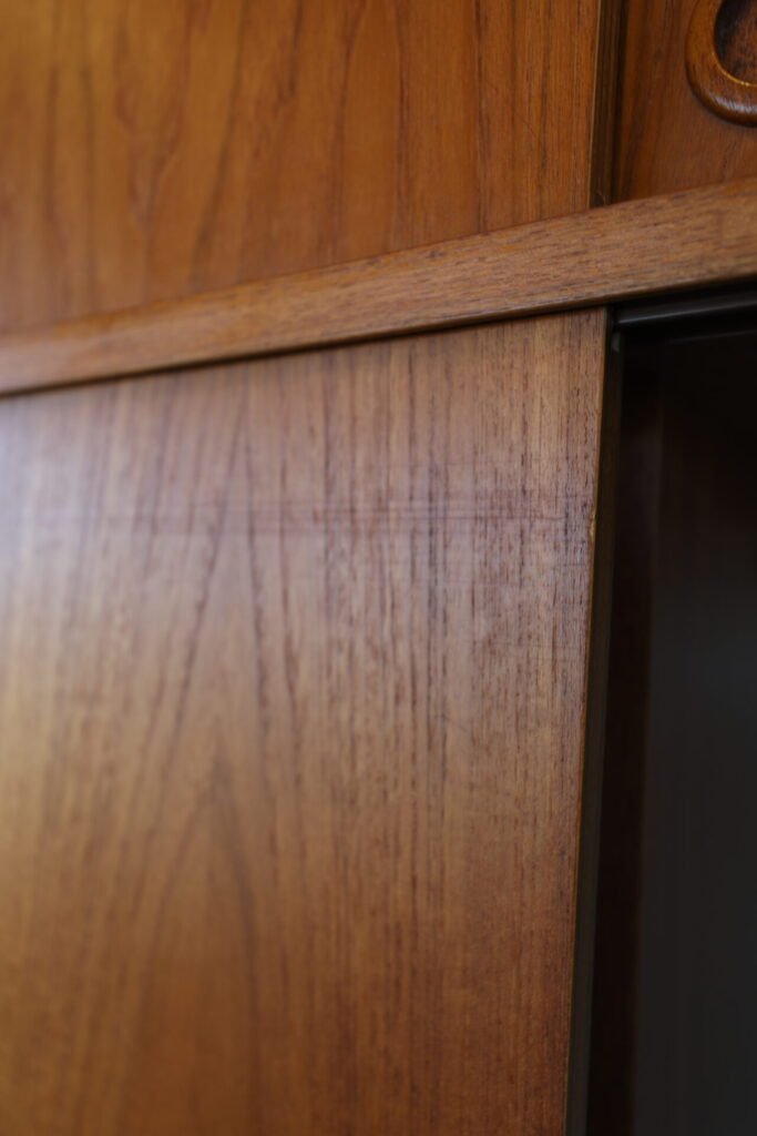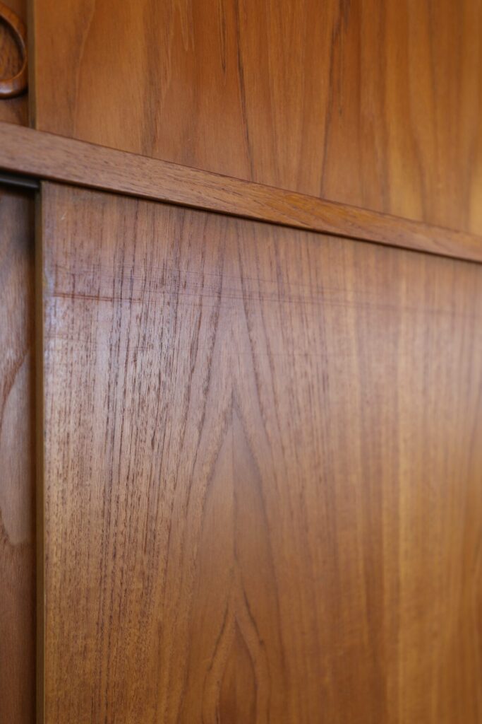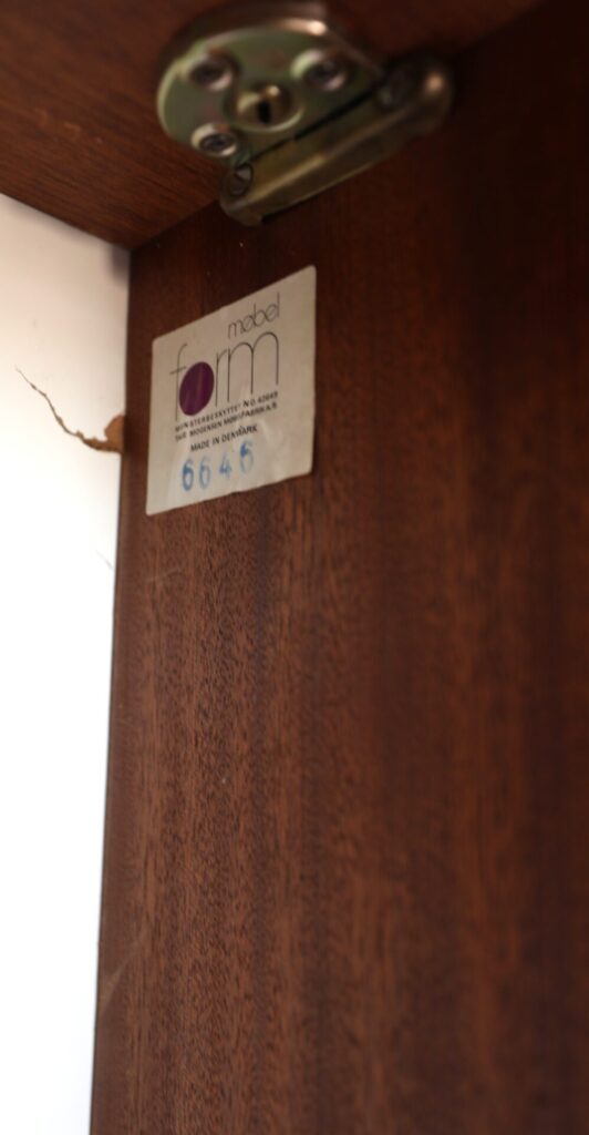 En fantastisk dansk garderob tillverkad av Tage Mogensen Møbelfabrik A/S med praktisk inredning. Garderoben är i gyllene brun teak med mycket fin ådring. Den har skjutluckor i två olika plan varav tre är större och tre är mindre och på samtliga skjutluckor sitter det runda integrerade handtag. Skjutluckorna gör att inga dörrar tar sin plats ut i rummet.