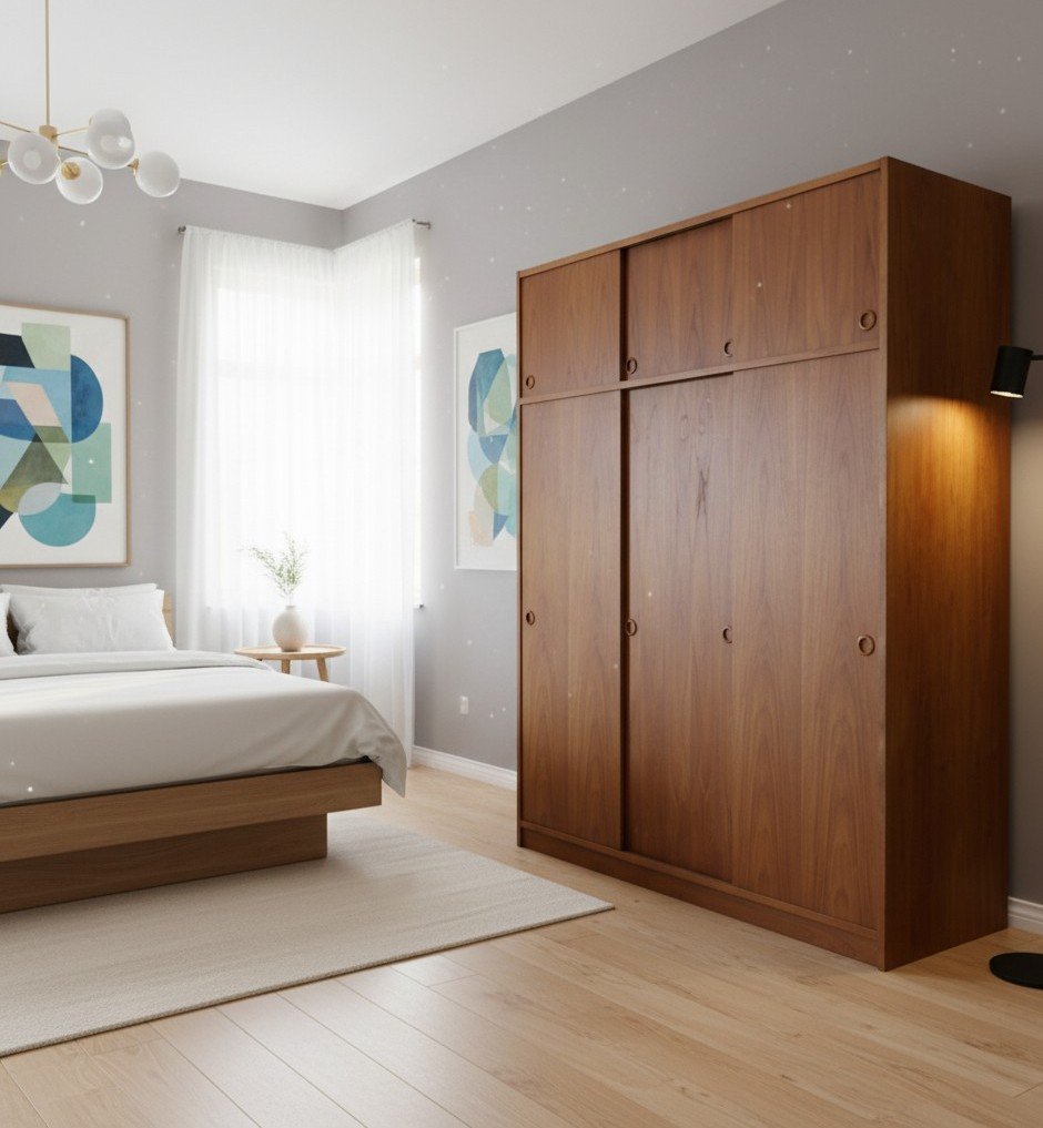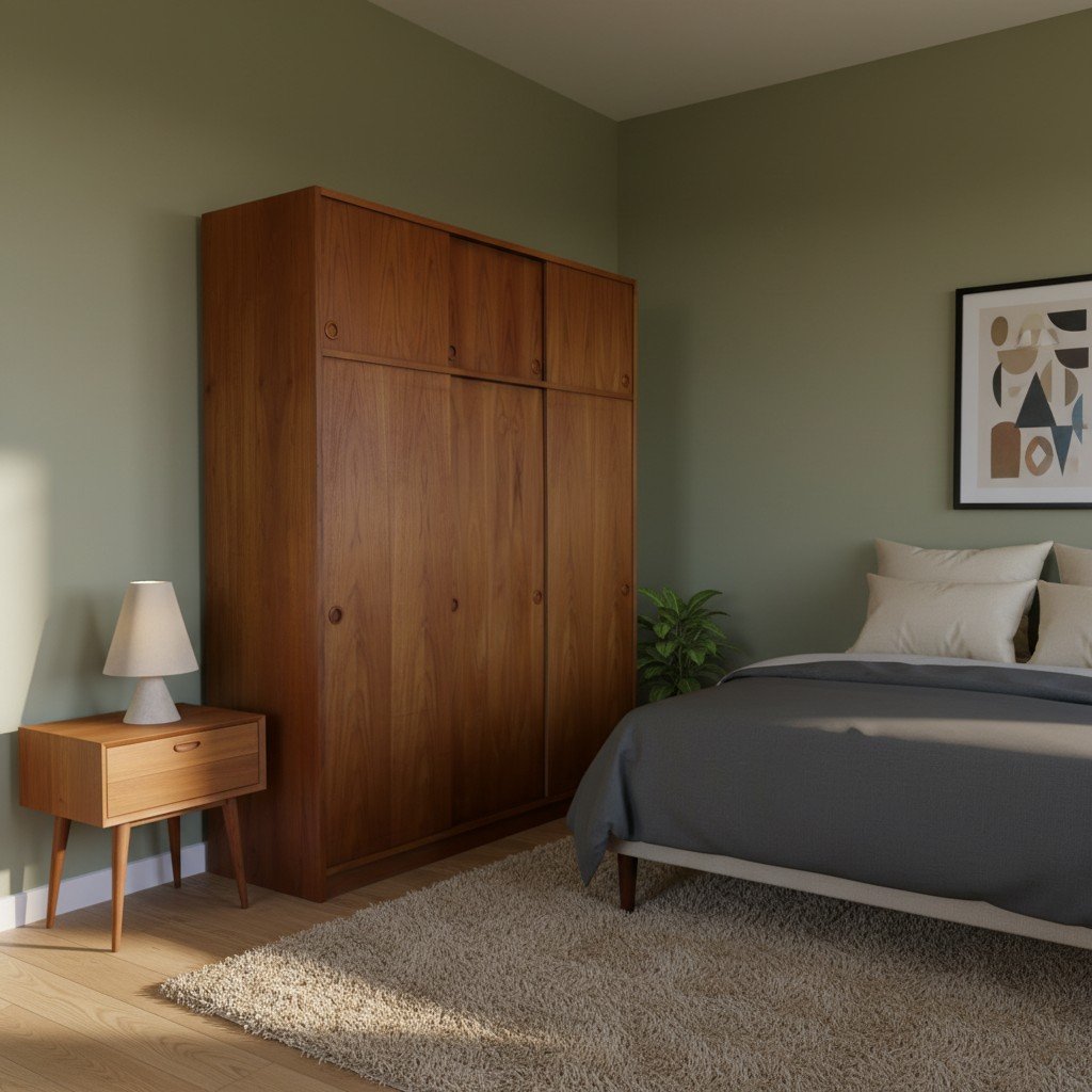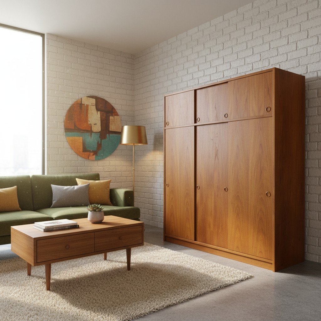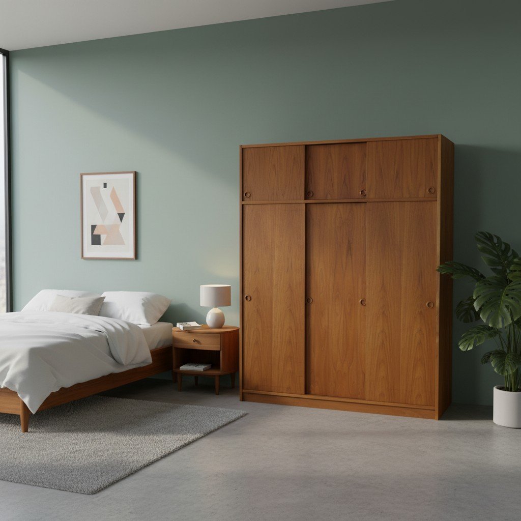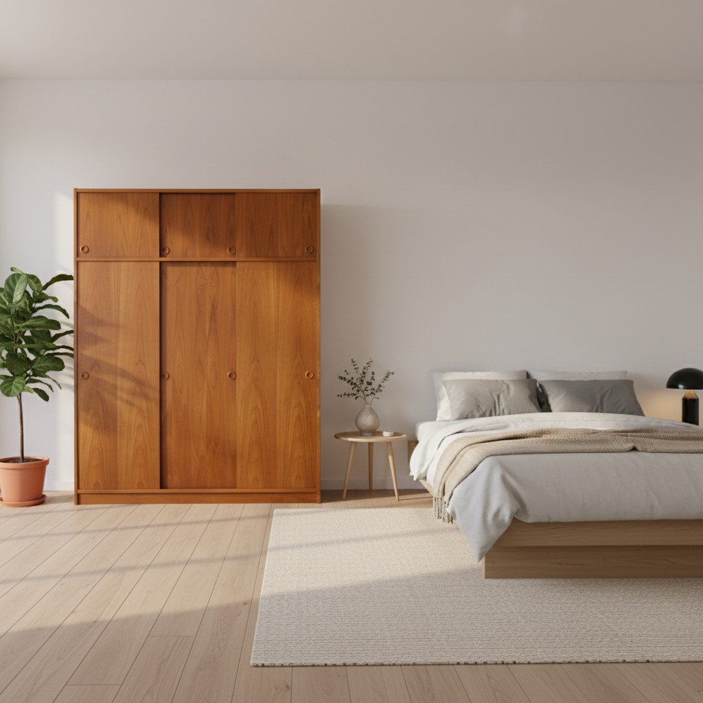 En fantastisk dansk garderob tillverkad av Tage Mogensen Møbelfabrik A/S med praktisk inredning. Garderoben är i gyllene brun teak med mycket fin ådring. Den har skjutluckor i två olika plan varav tre är större och tre är mindre och på samtliga skjutluckor sitter det runda integrerade handtag. Skjutluckorna gör att inga dörrar tar sin plats ut i rummet.