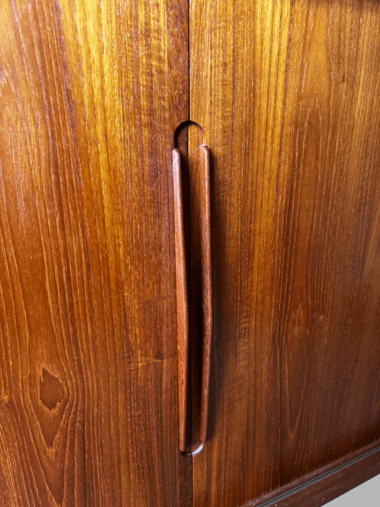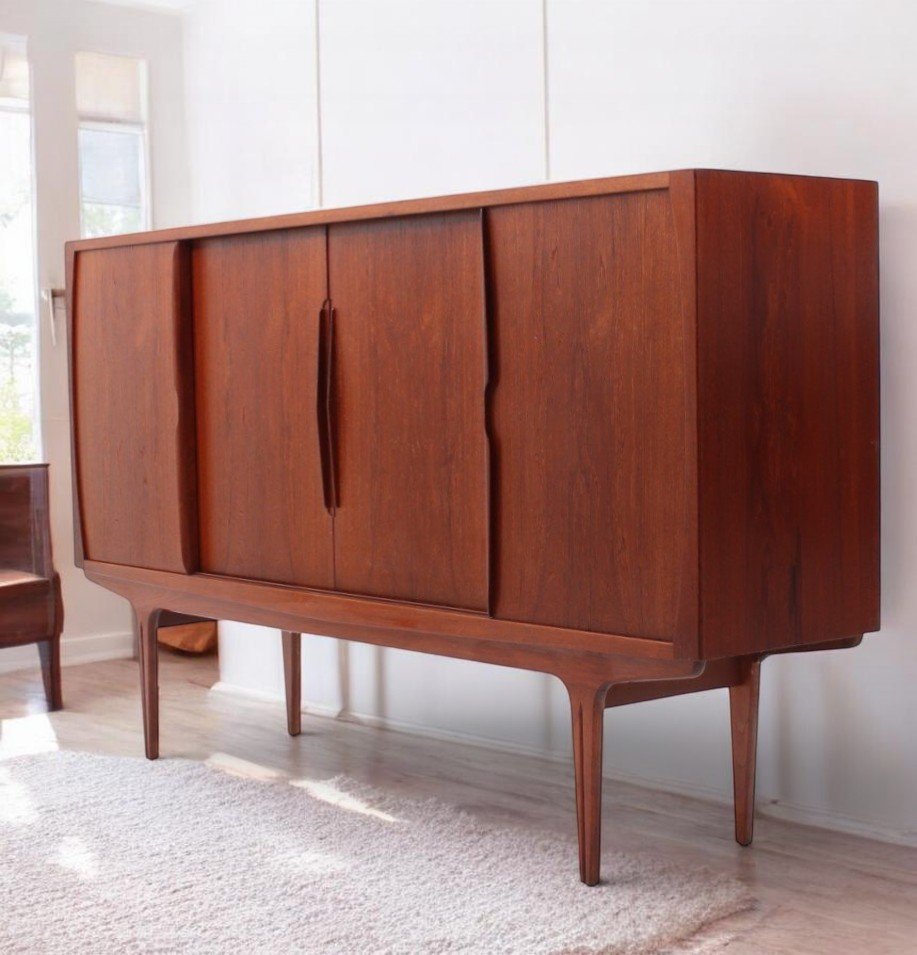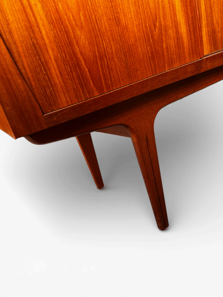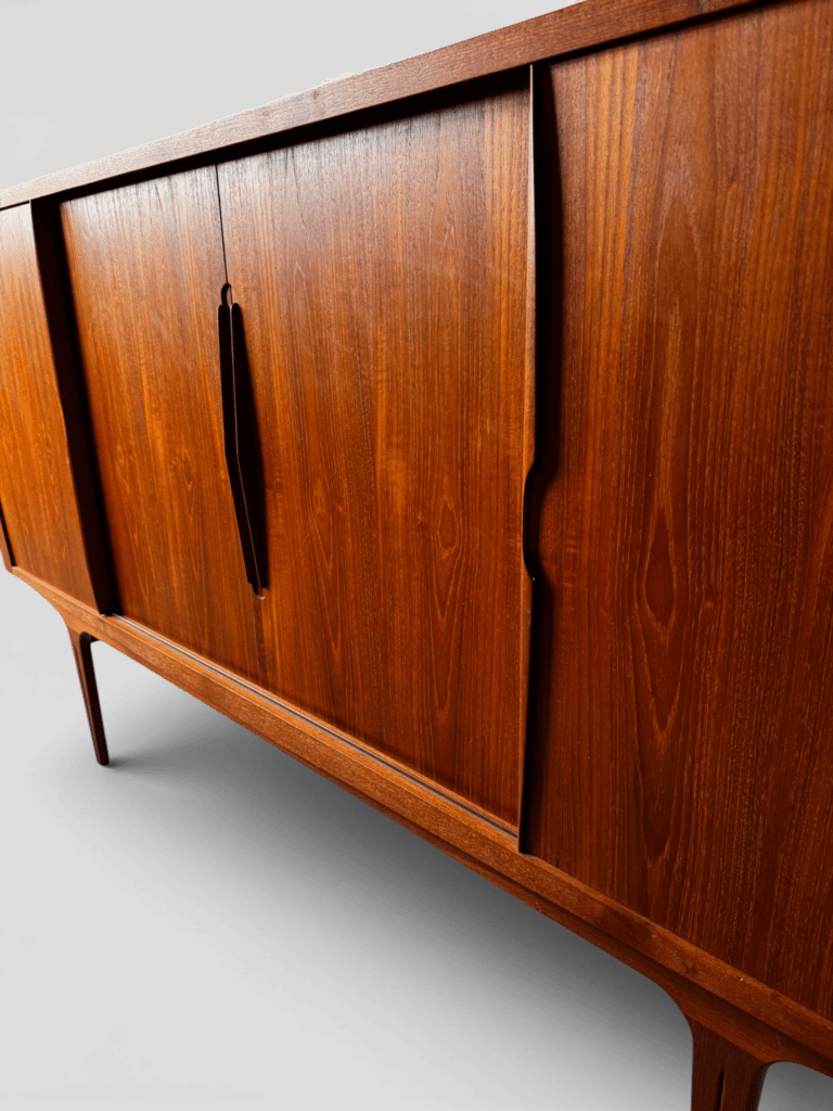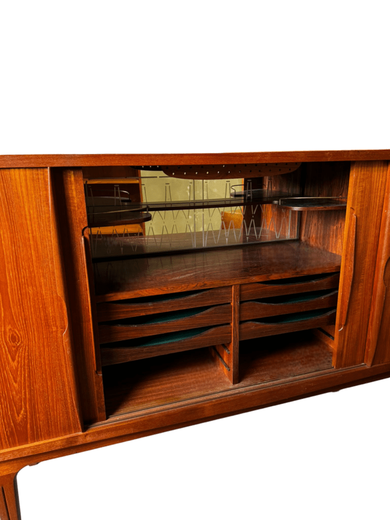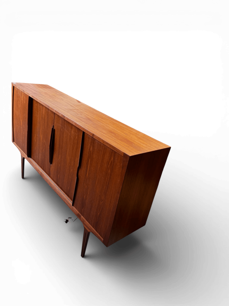 Ett riktigt elegant och tidstypiskt danskt skåp från 1960‑talet, en möbel som bär på den där fantastiska kombinationen av värme, hantverk och skandinavisk lätthet.