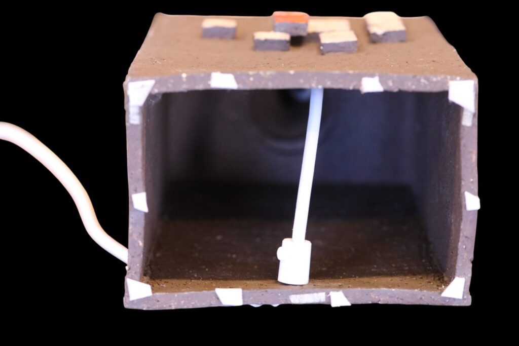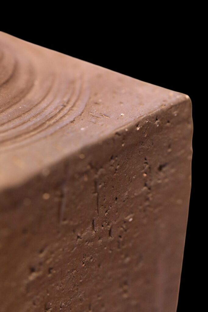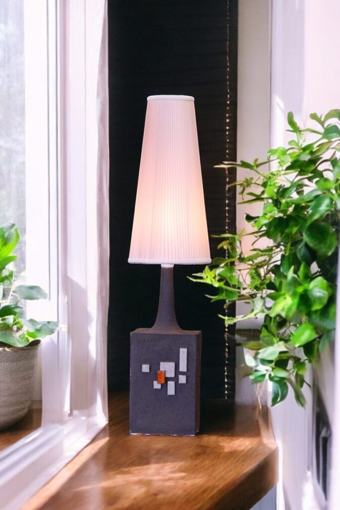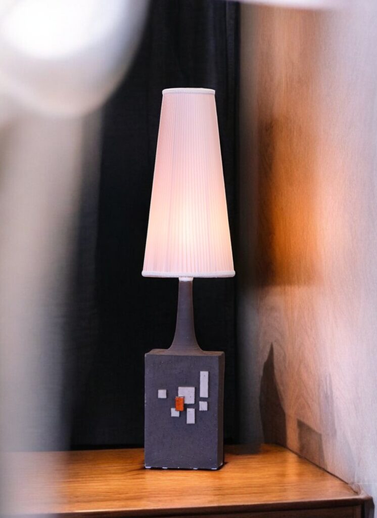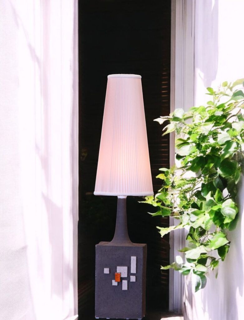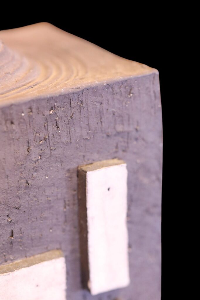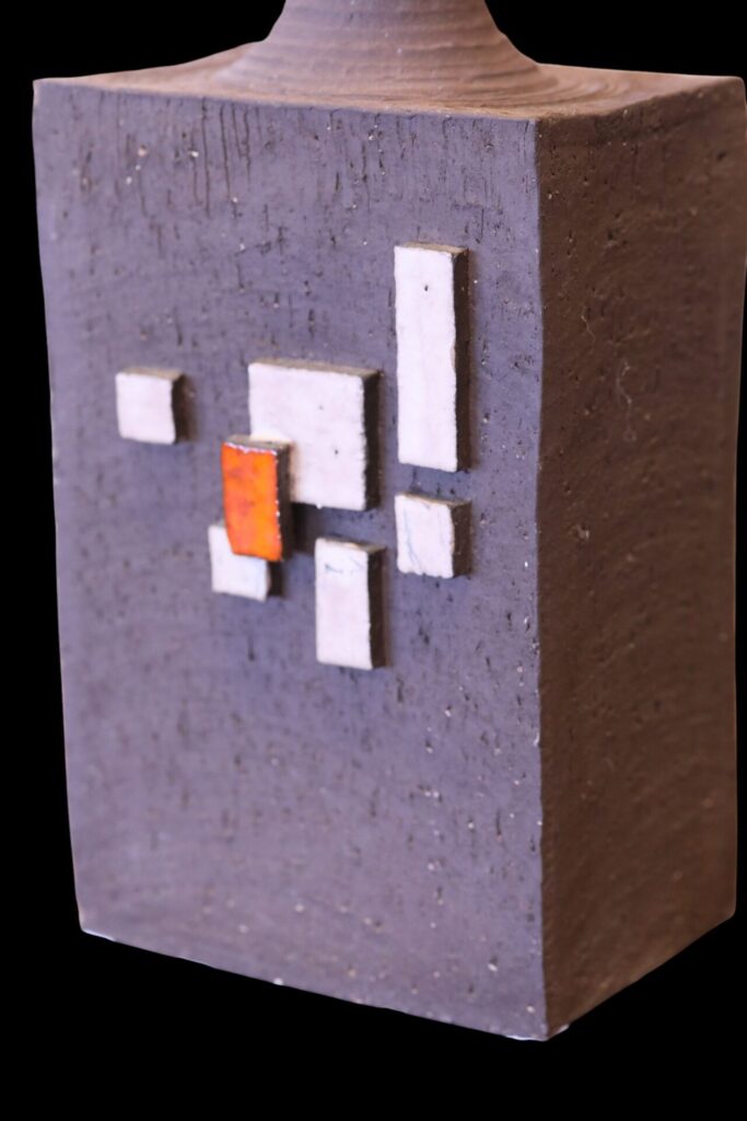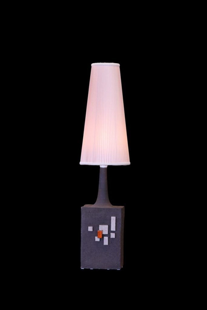 Keramiken har en struktur i ytorna, med undantag för de kubformade dekorationerna som är släta och glaserade. Kontrasten skapar en härlig dynamik på ytan och ger lampan karaktär.