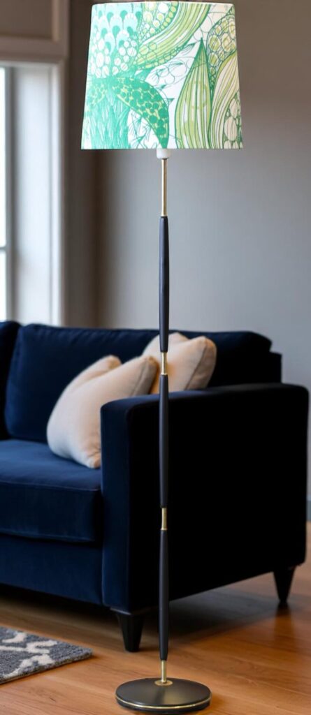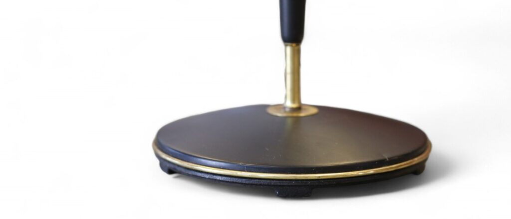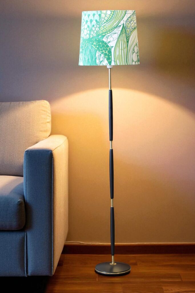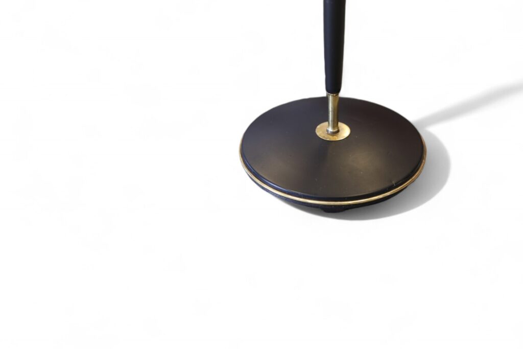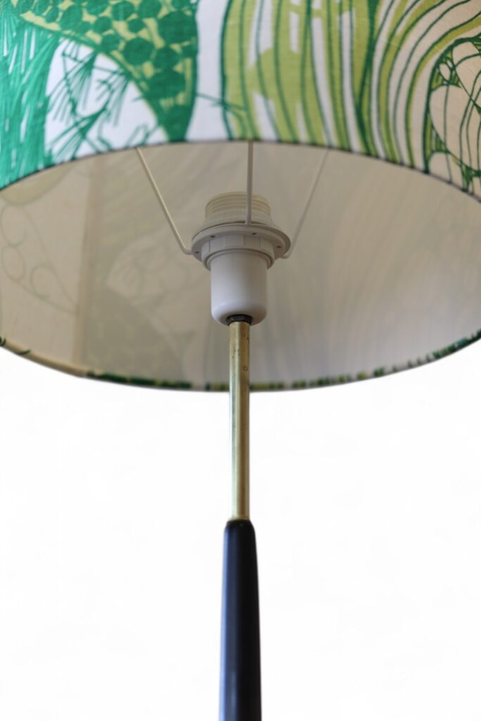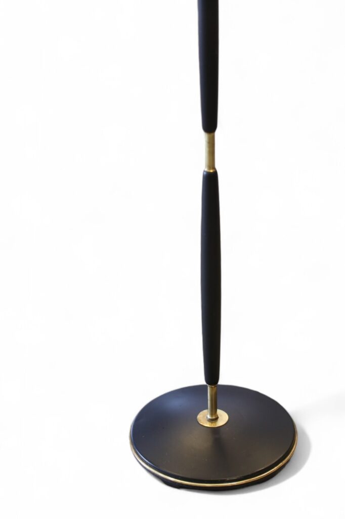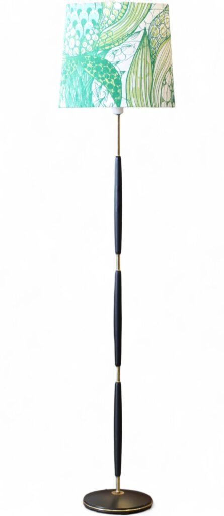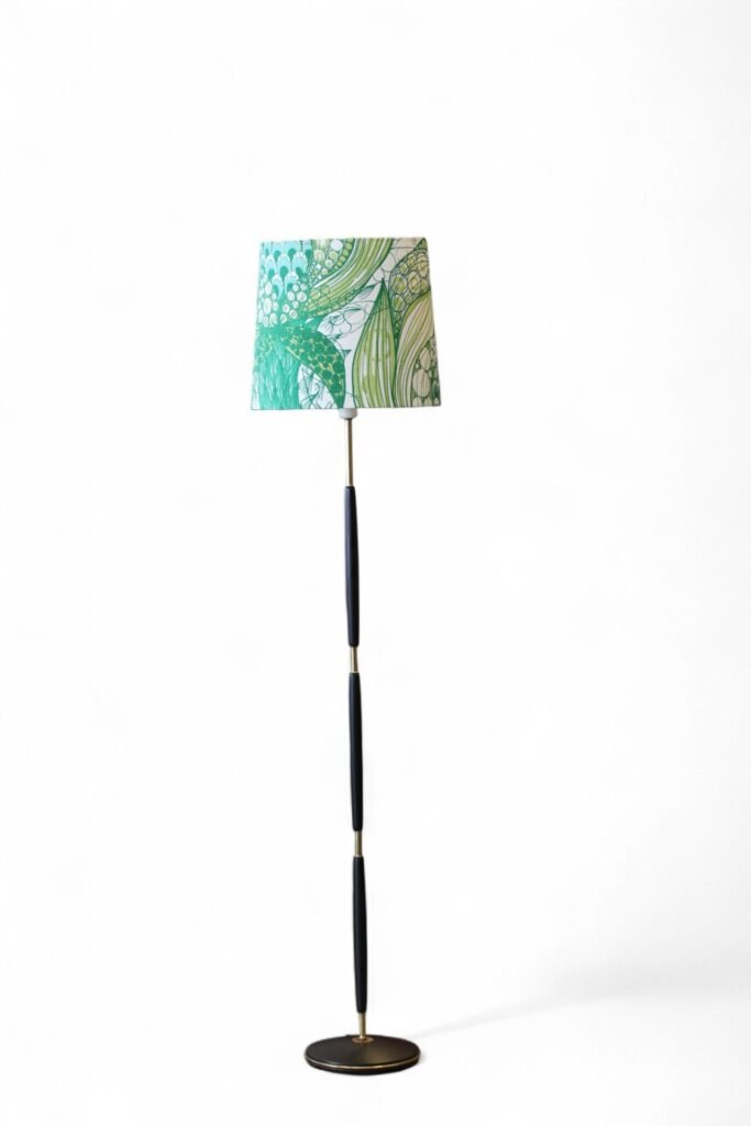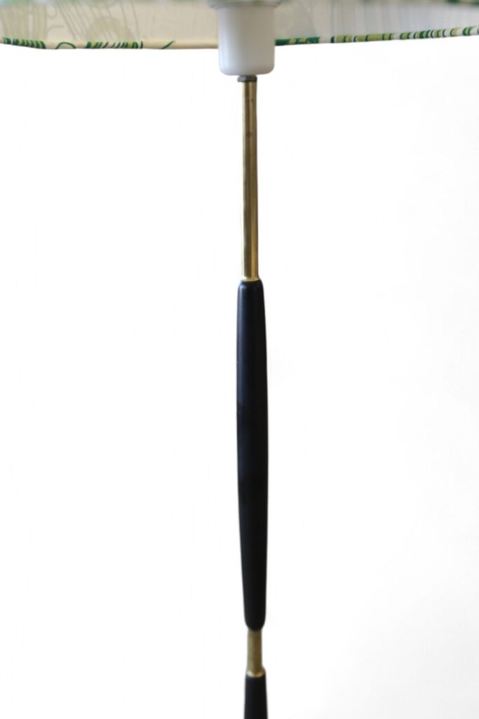 Stilren golvlampa från 1950-talet som är tillverkad i svärtat trä av samt elegant mässing, vilket ger den en tidlös charm och en perfekt känsla av vintage.