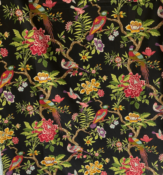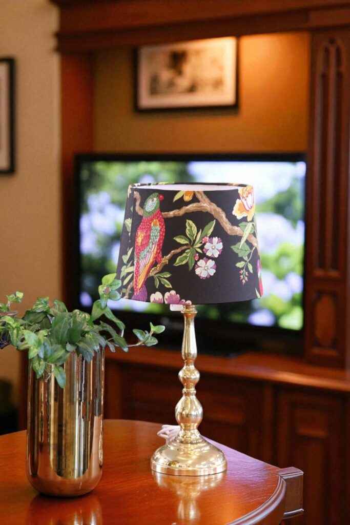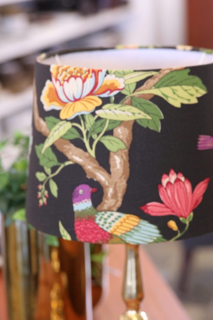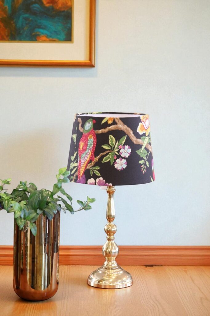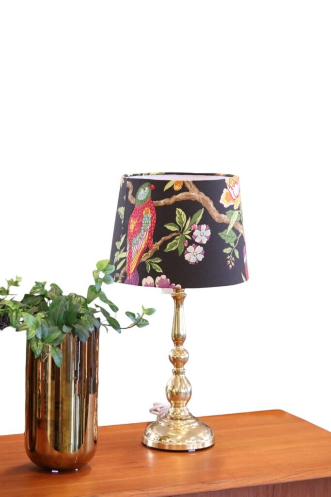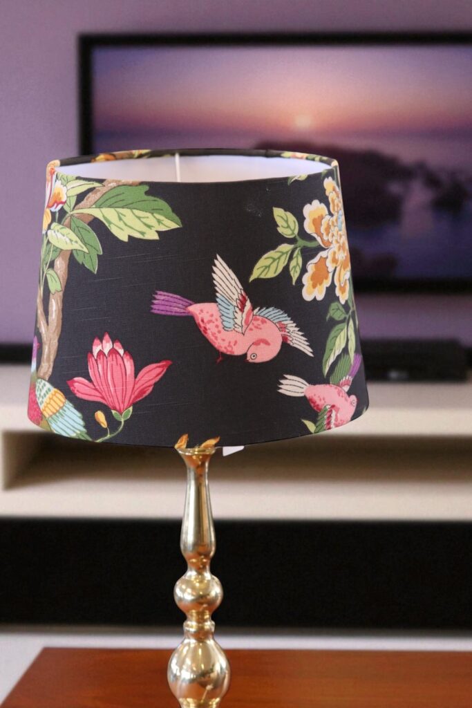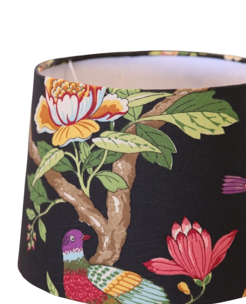 Lampskärm i traditionell konisk modell i halvlinnetyg formgivet av GP&J Baker på svart botten.