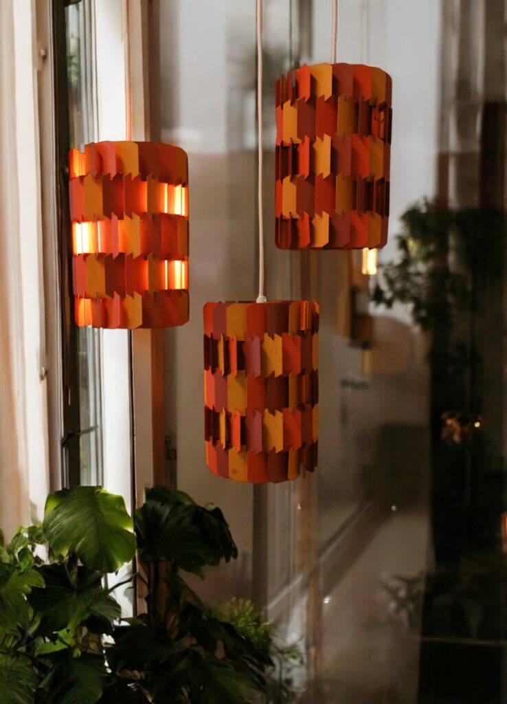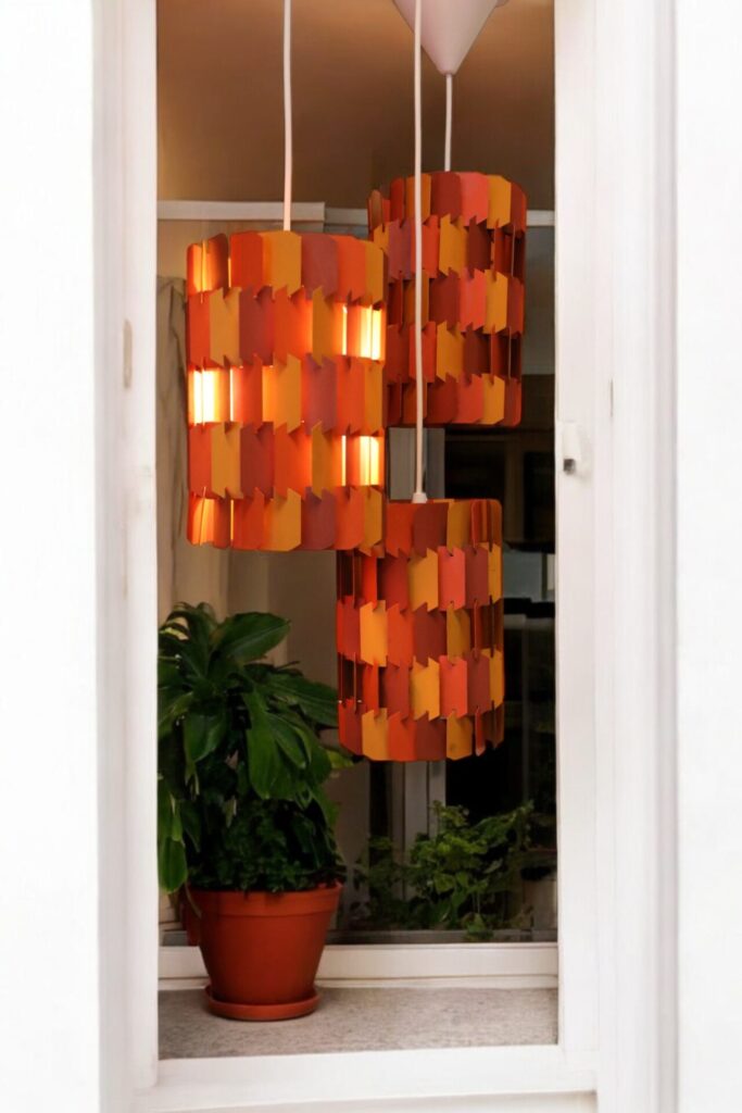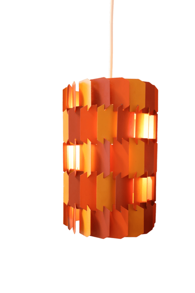 Lampan är som ett 3D-pussel med arton identiska metallelement, var och en en stansad samt böjd bit som passar in i nästa, och i nästa, tills en cylinder bildas. Ljus kommer fram genom små mellanrum mellan bitarna, avslöjar insidans toner samtidigt som det silar ljuset.