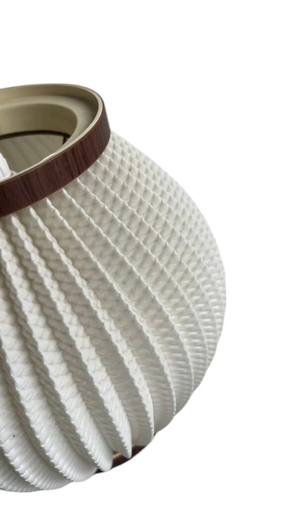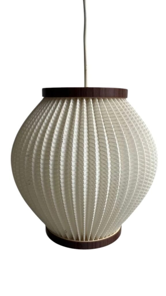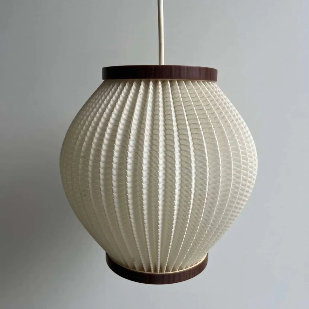 Lampan är i vit akryl samt ringar som är teakmönstrade upp- och nertill.