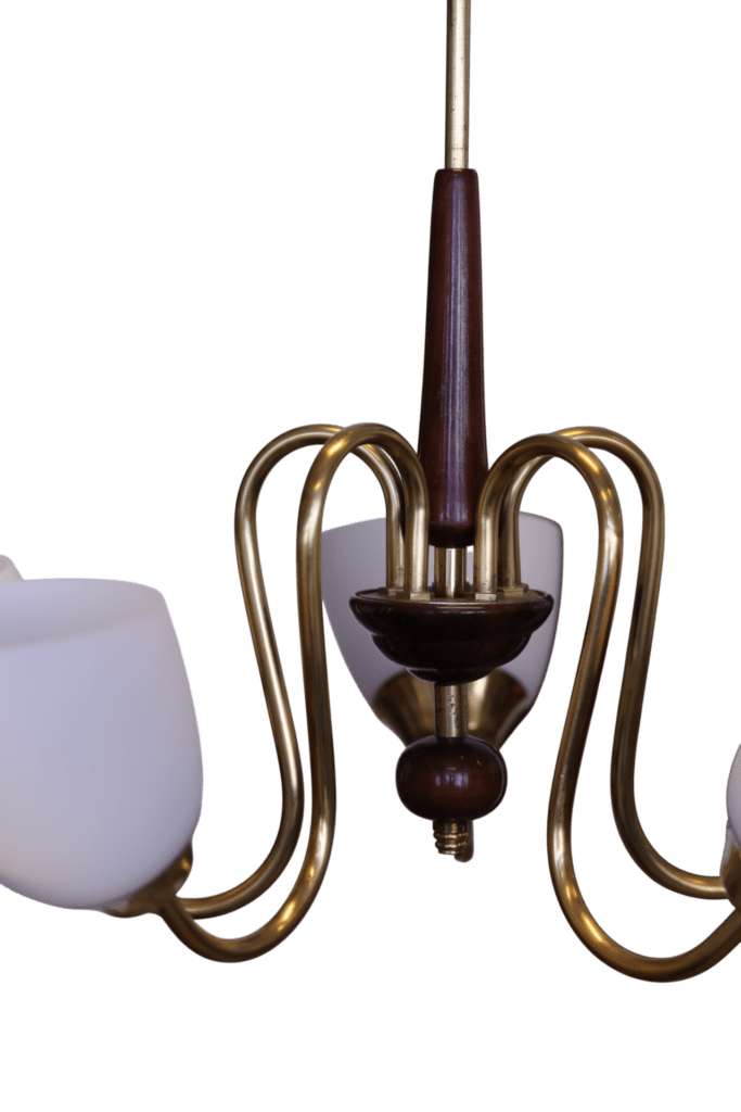 Taklampan är femarmad med stomme och skira detaljer i mässing. Utvalda delar på stommen är i mörkt trä och ger fin kontrast mot både färg och material på stomme och kupor.