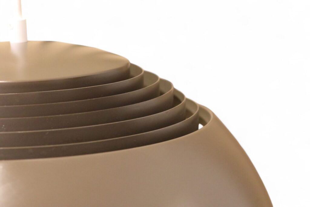 Lampan skapades ursprungligen som en del av ett unikt designkoncept för SAS Royal Hotel i Köpenhamn, där den berömde designern Arne Jacobsen på ett genomgående och innovativt sätt stod för helhetskonceptet av inredningen och möbleringen. Denna ikoniska lampa har en enkel men ändå elegant skandinavisk design, präglad av en halvklotformad skärm som utstrålar en ren och stilren geometrisk form. Den stilrena kupolskärmen är dessutom utrustad med lameller på toppen, vilket ger ett mjukt och subtilt uppåtriktat ljus som skapar en harmonisk atmosfär. Lampans design kombinerar funktion och estetik, vilket gör den till ett tidlöst inslag i moderna hem samt offentliga miljöer.