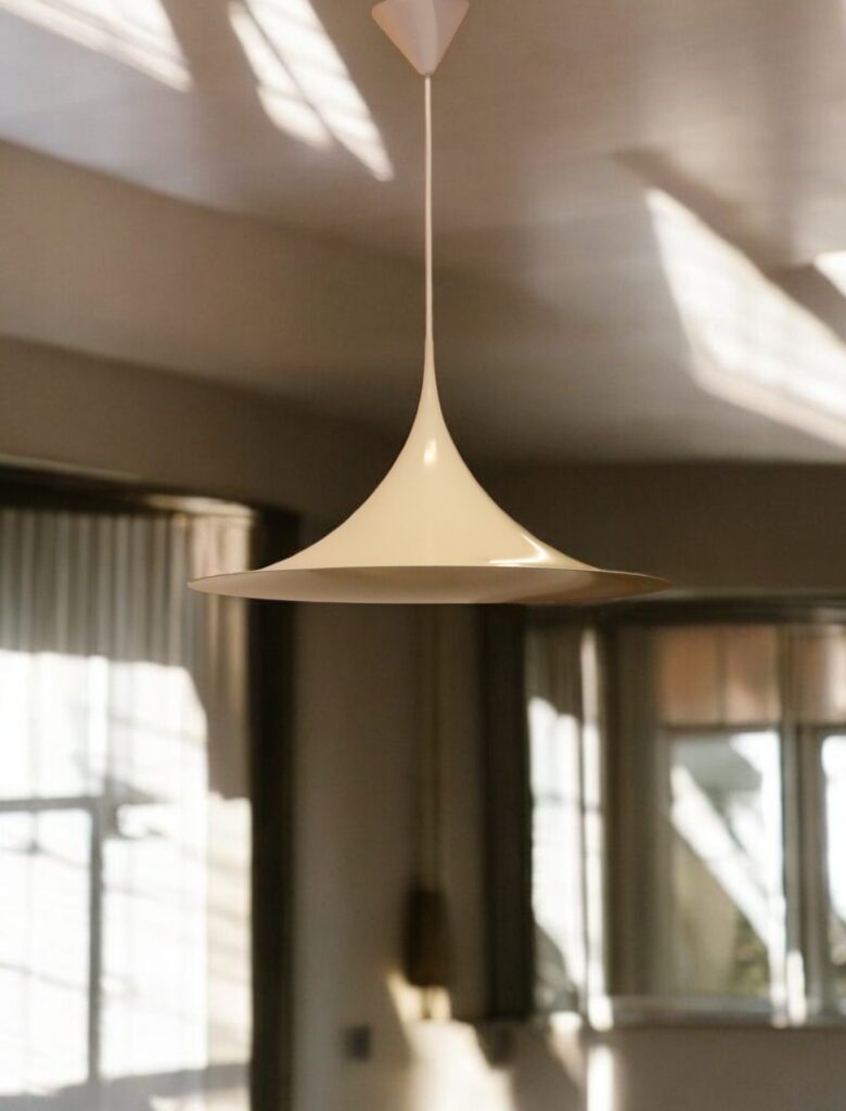 Klassisk pendel, skapad 1968, med rena linjer och en tidlös, geometrisk form som verkligen fångar blicken. En fantastisk lampa som passar perfekt i alla tänkbara miljöer, oavsett om det är ett modernt hem eller en mer traditionell inredning. Tänk dig den här lampan, med sina modiga 60 cm i diameter, hängande över ett runt bord, där den verkligen kan lyfta hela rummet och skapa en varm och inbjudande atmosfär 💛