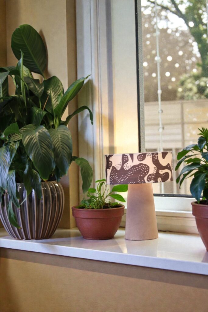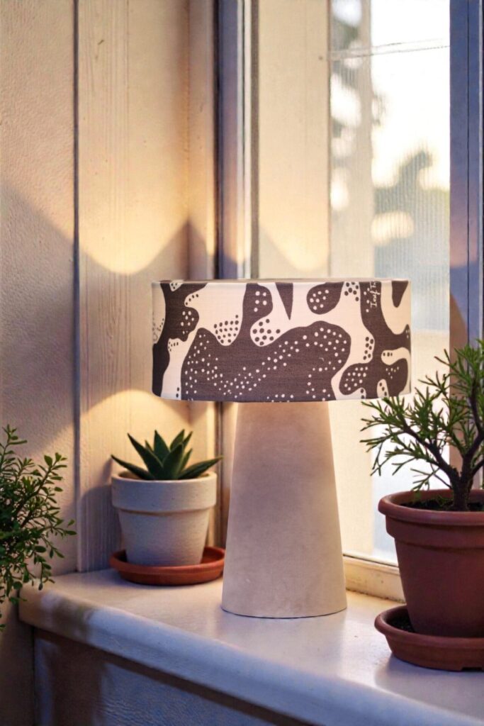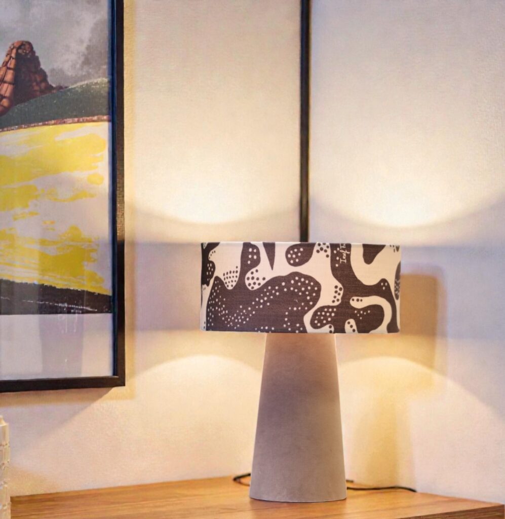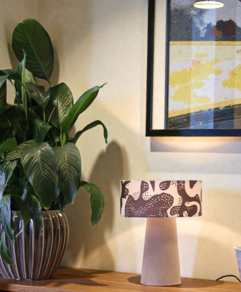 Lampan sprider ett varmt och behagligt ljus och blir en stilfull detalj i fönstret, på ett sidobord eller i sovrummet. Kombinationen av sammetens mjuka struktur och linnetygets lekfulla mönster ger lampan en unik balans mellan elegans och personlighet.