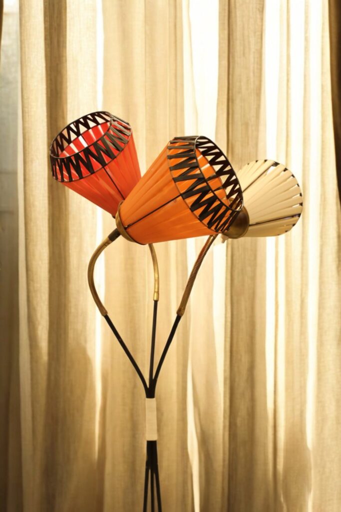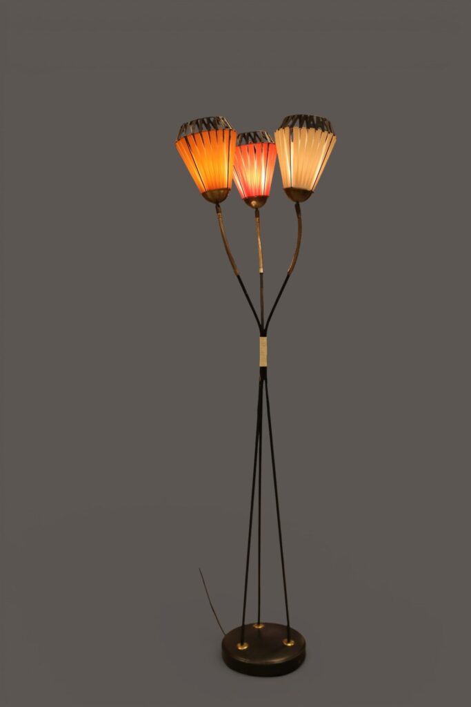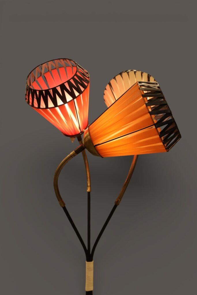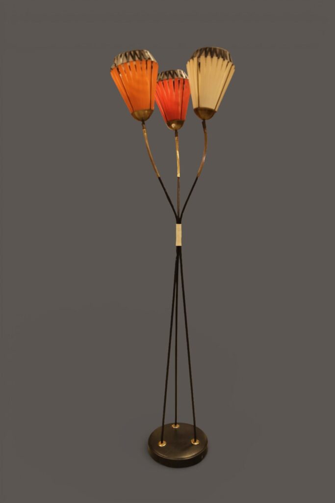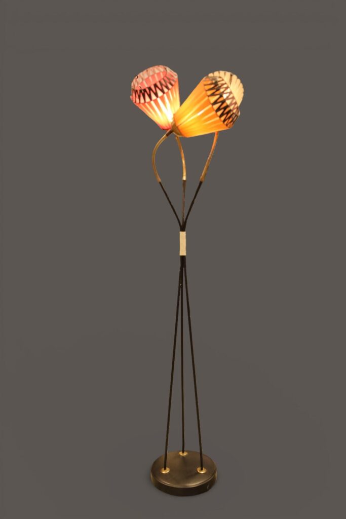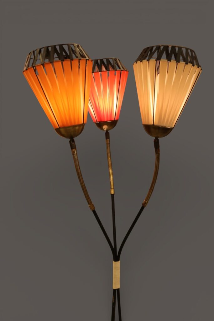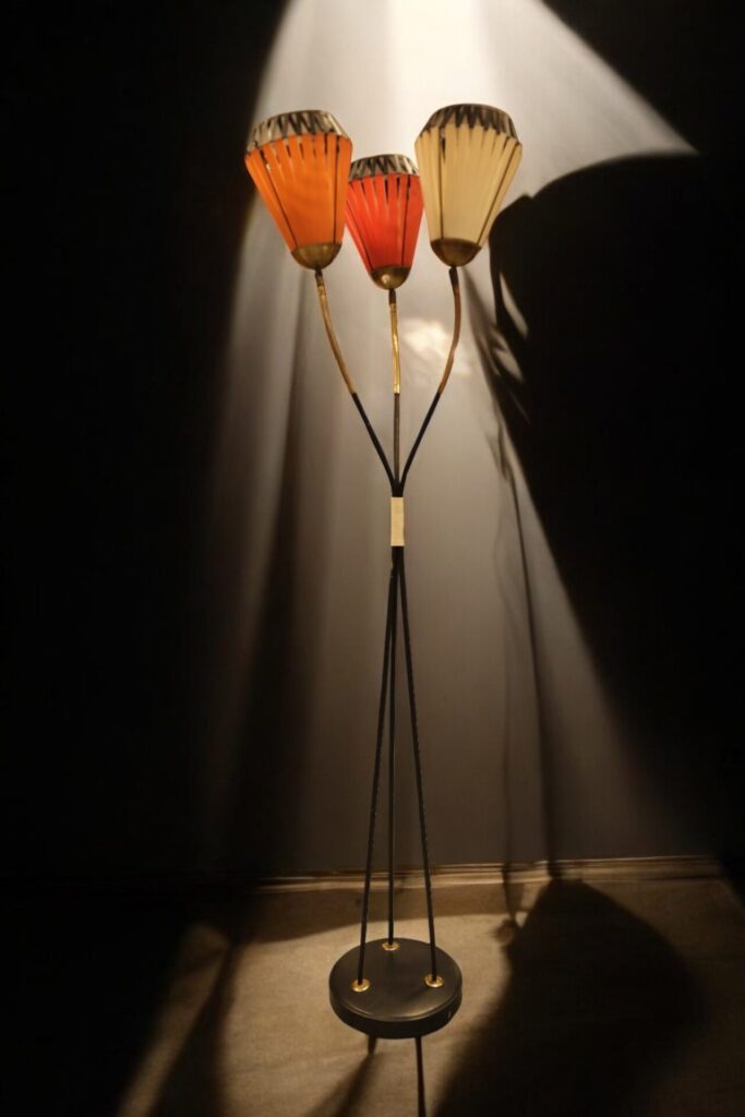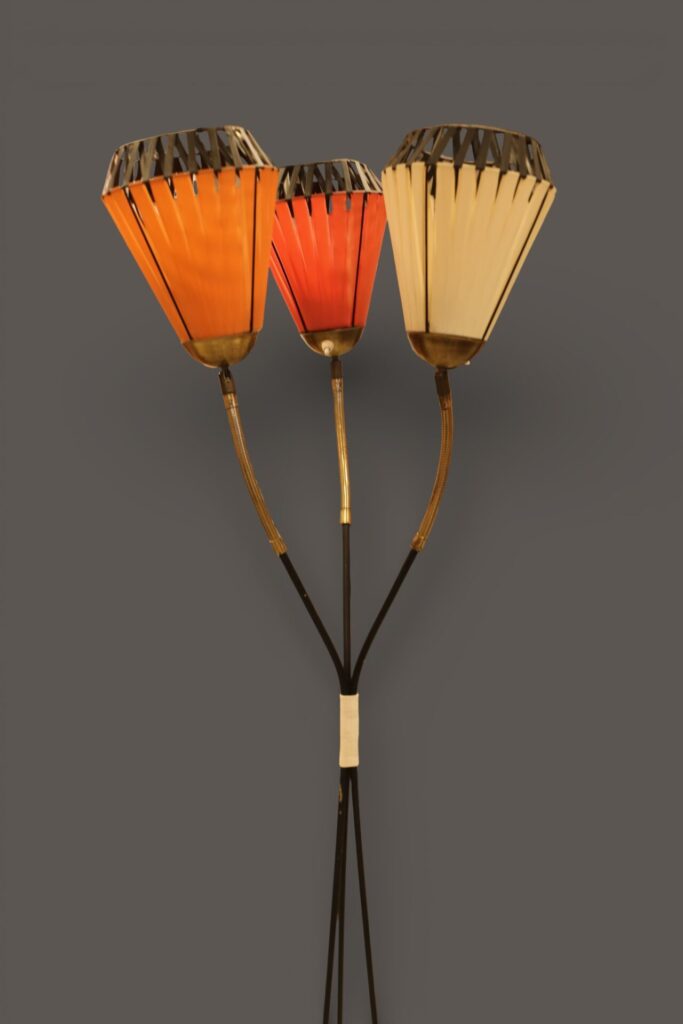 Golvlampan har tre tidstypiska lampskärmar som är lindade med plastband i svart samt orange, rött och beige som tillsammans skapar en harmonisk och nostalgisk atmosfär. Allt är och original från det fantastiska 1950-talet, vilket ger lampan en tidlös charm och en unik karaktär som verkligen kan lysa upp vilket rum som helst och dra blickarna till sig.