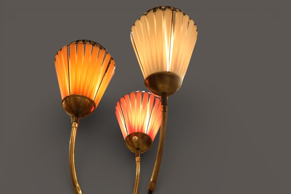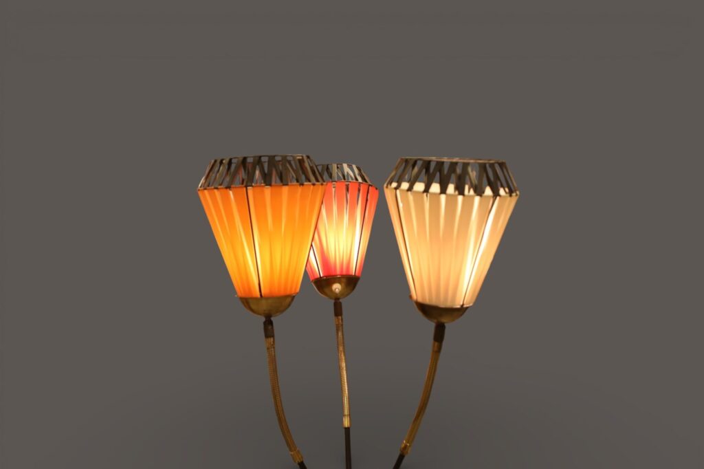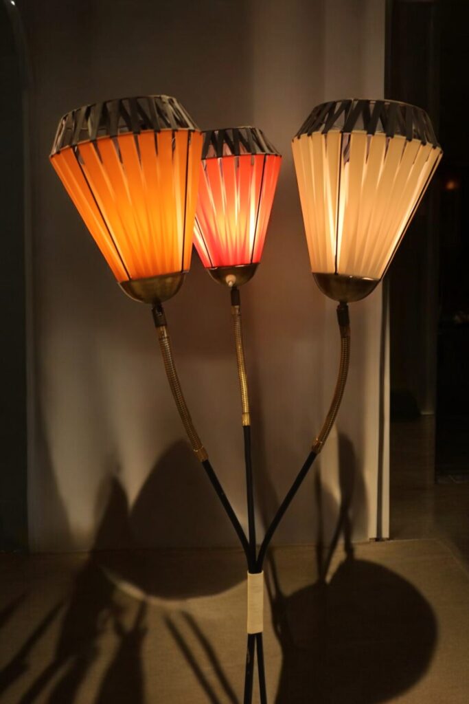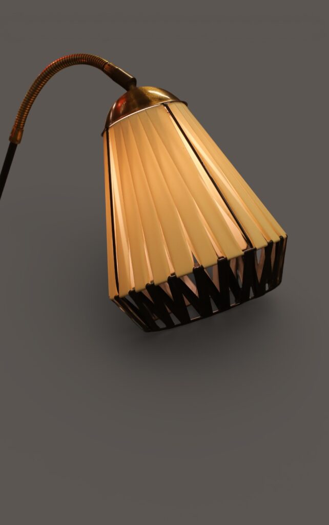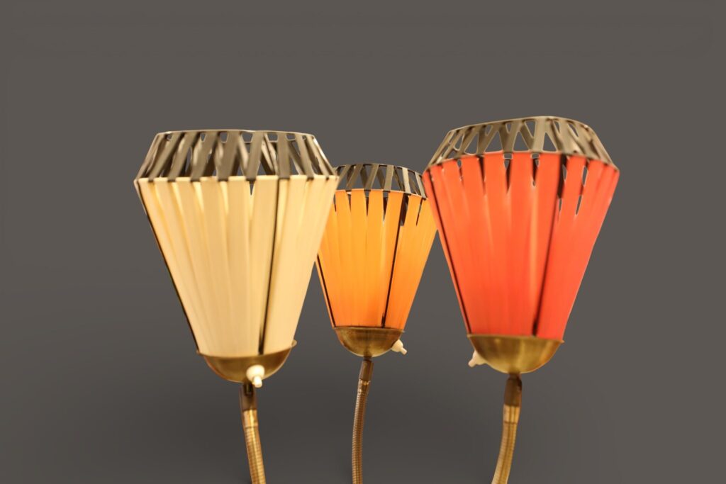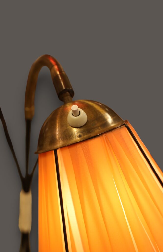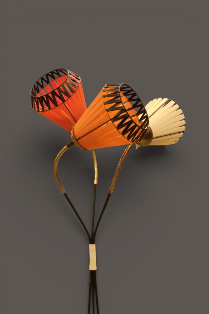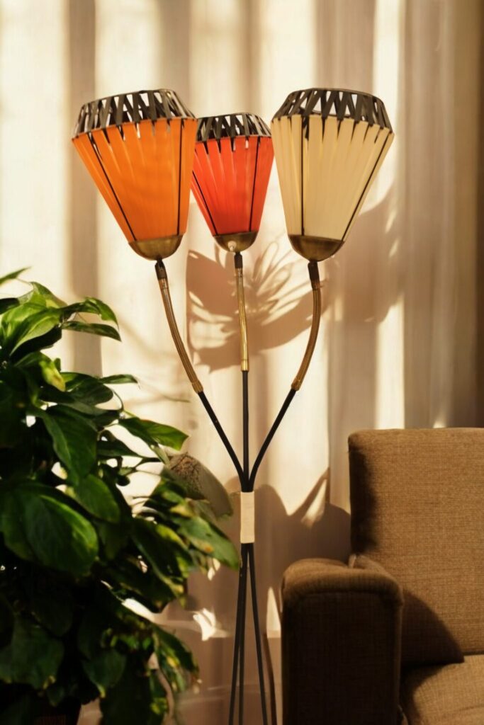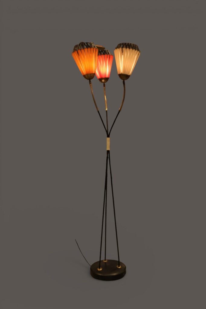 Golvlampan har tre tidstypiska lampskärmar som är lindade med plastband i svart samt orange, rött och beige som tillsammans skapar en harmonisk och nostalgisk atmosfär. Allt är och original från det fantastiska 1950-talet, vilket ger lampan en tidlös charm och en unik karaktär som verkligen kan lysa upp vilket rum som helst och dra blickarna till sig.