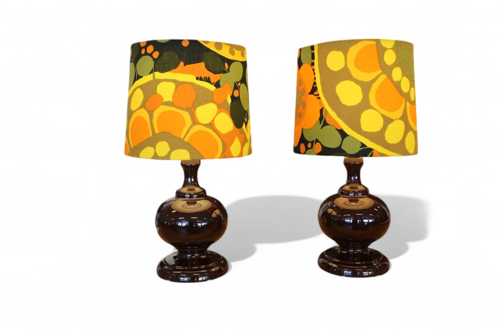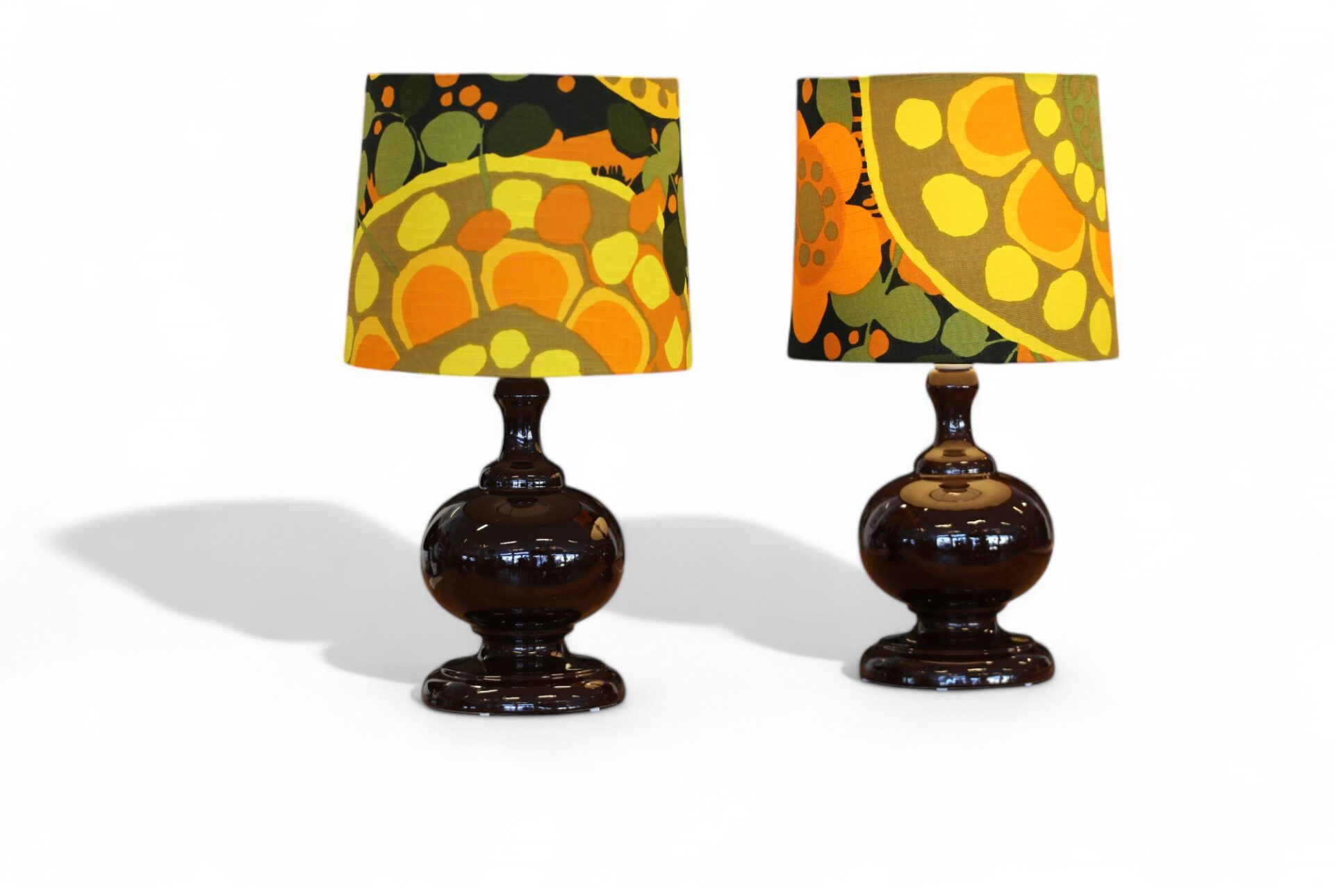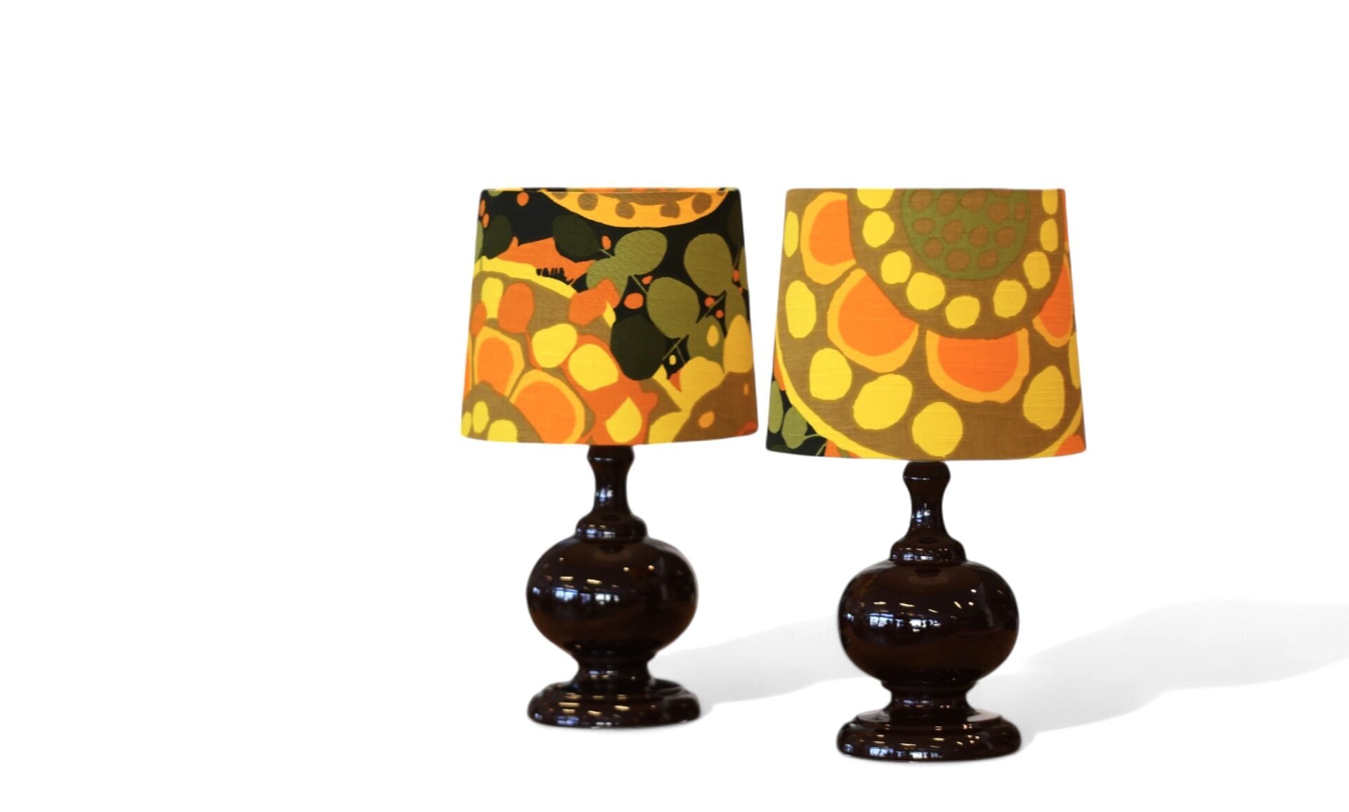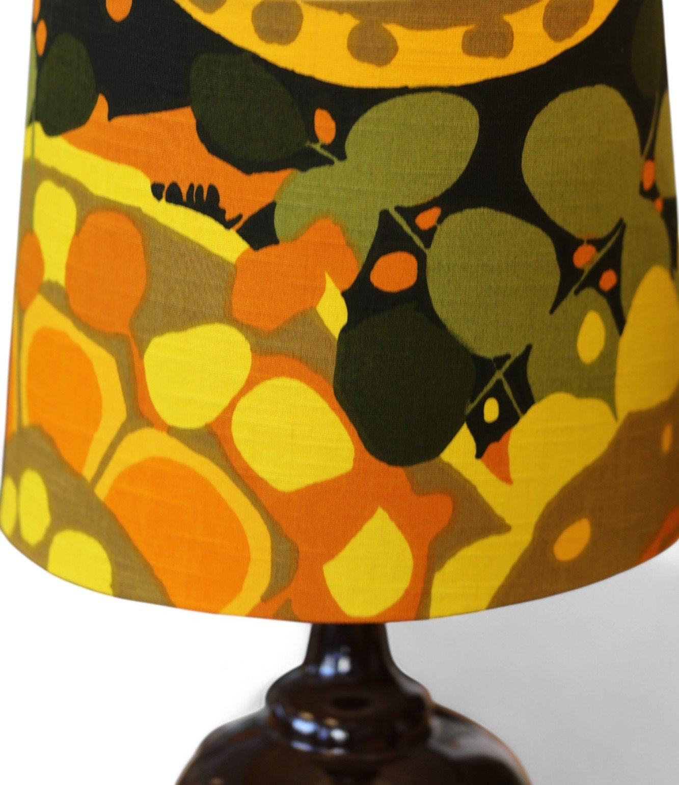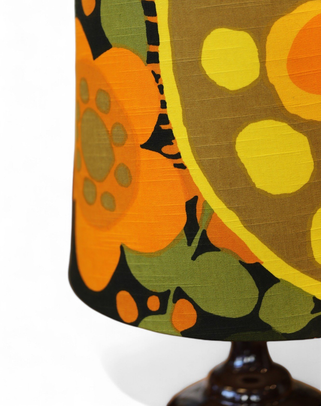 Tyget är från 1960-talet och vi har lyckan att ha en hel rulle med helt obrukat tyg! Tyget är med tryckt mönster i starka härliga färger med stora fantasiblommor i orange och gult på svart botten. Skärmen är i den tidsenliga modellen med en något bredare bas och passar många olika lampfötter.