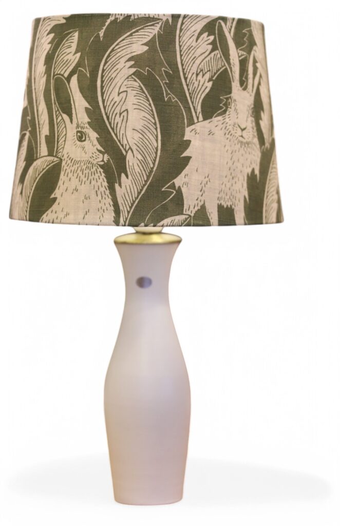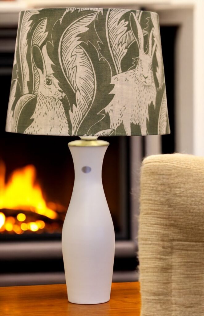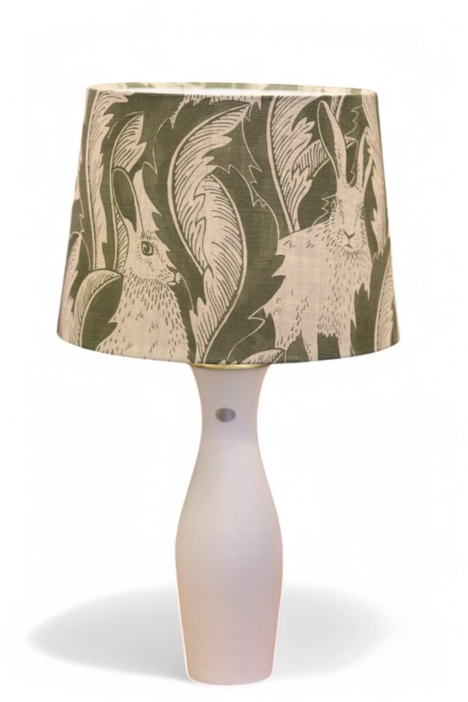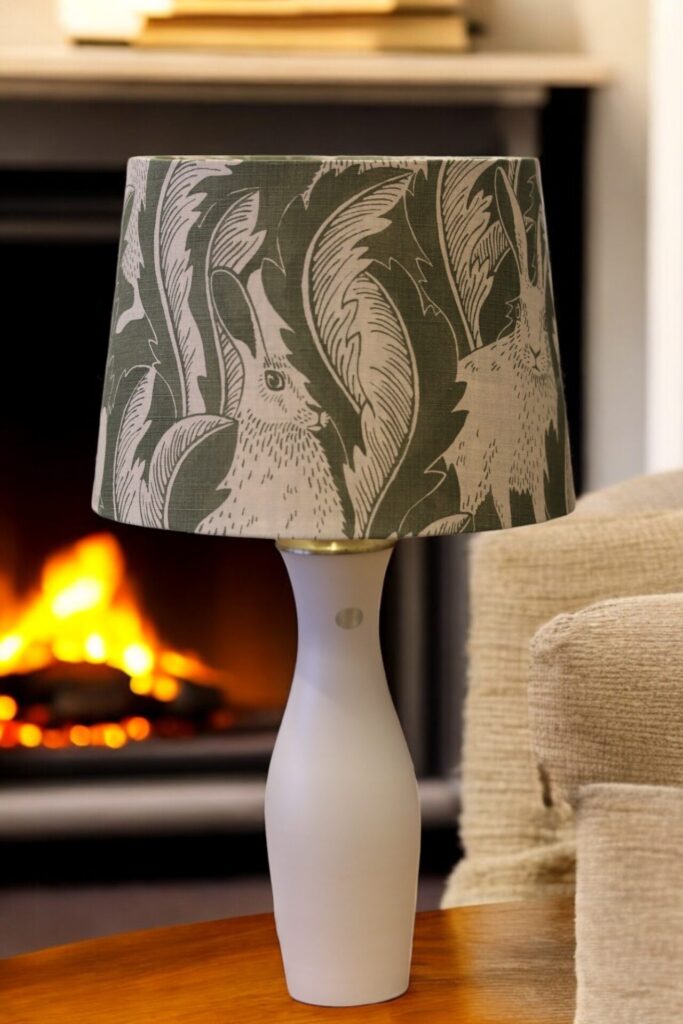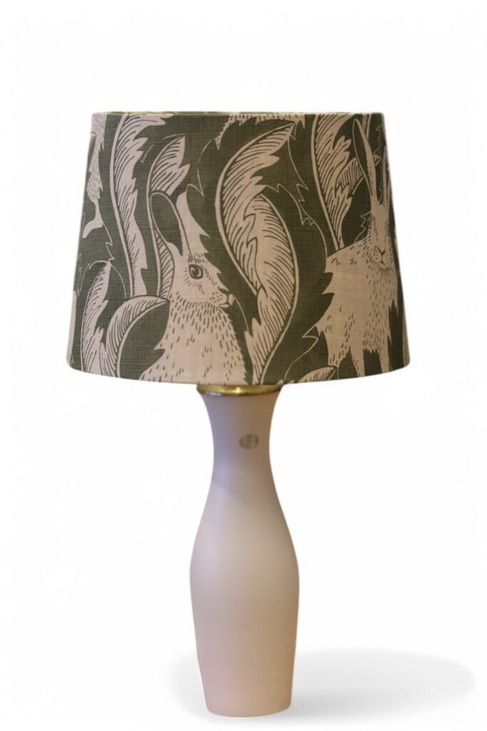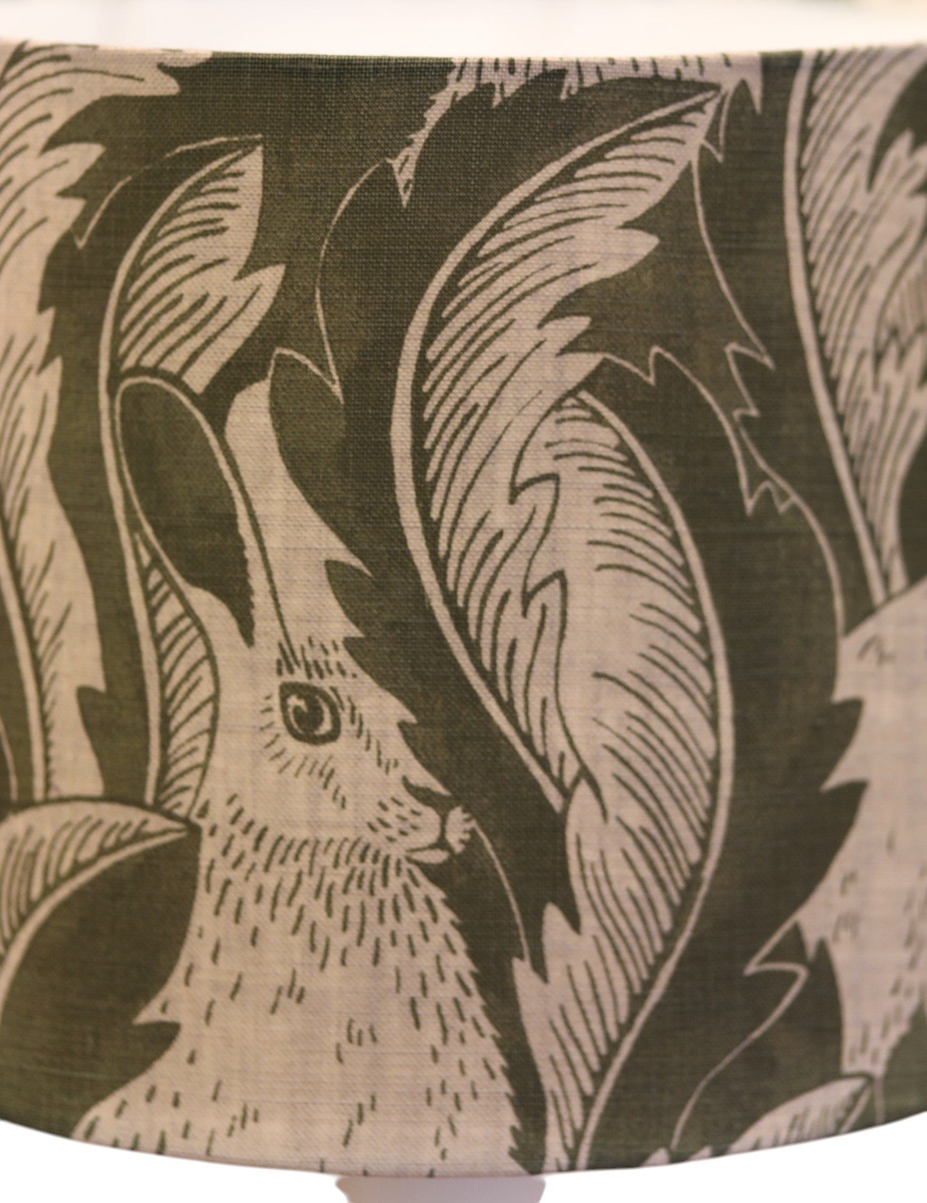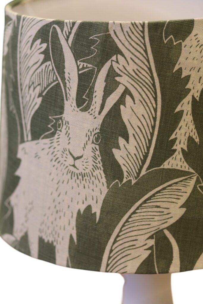 Handgjord lampskärm i linnetyget Hares Is Hidding Emma von Brömssen för Frösö Handtryck.  Skärmen är i den tidsenliga modellen med en något bredare bas och passar många olika lampfötter.