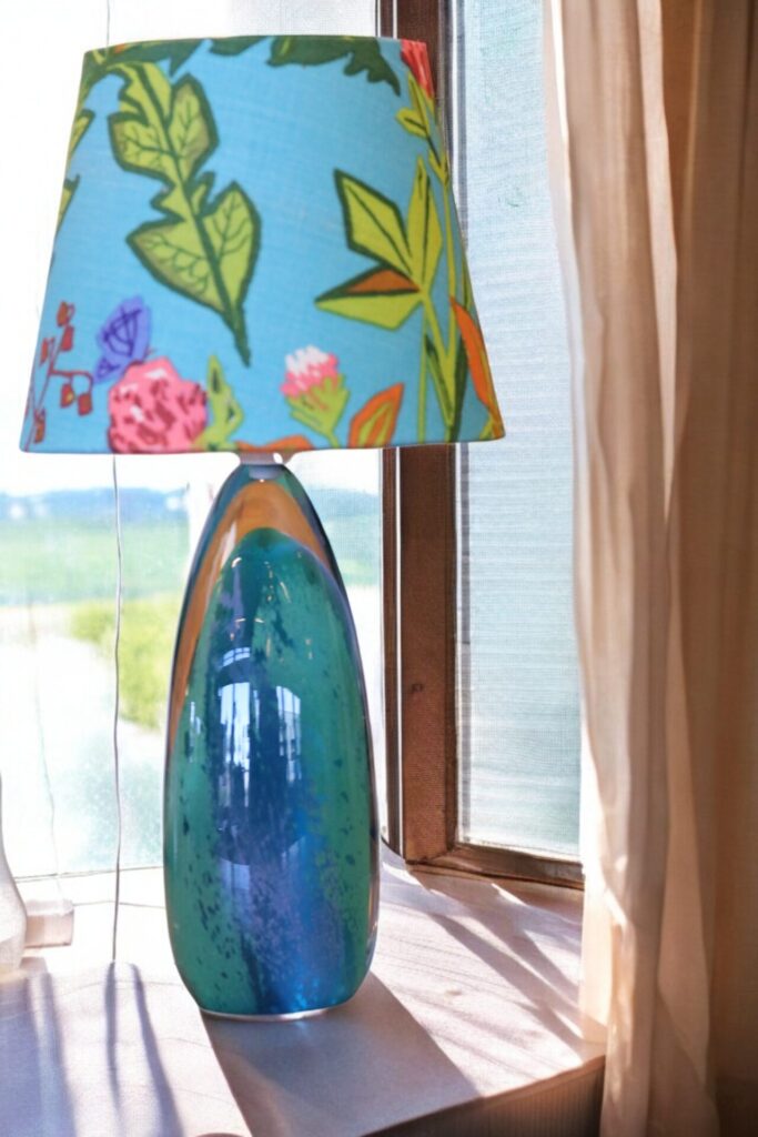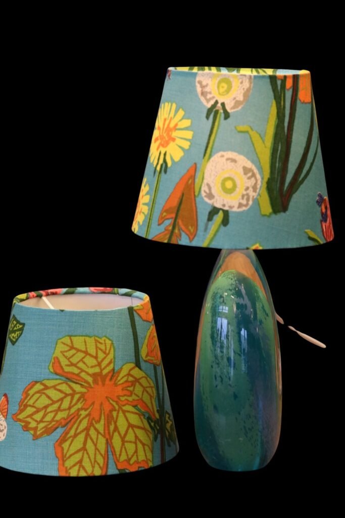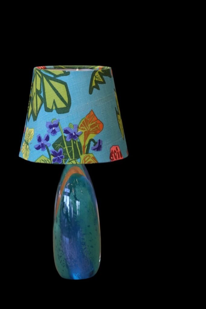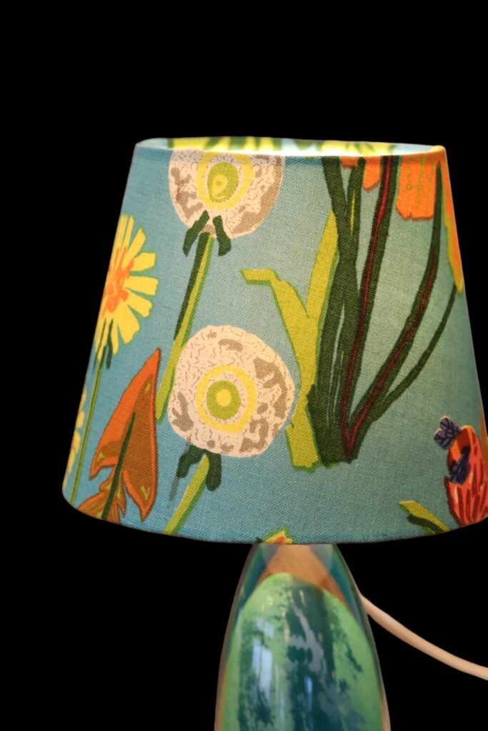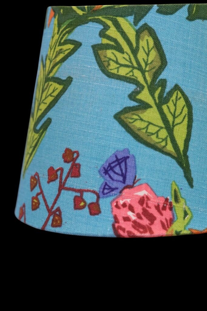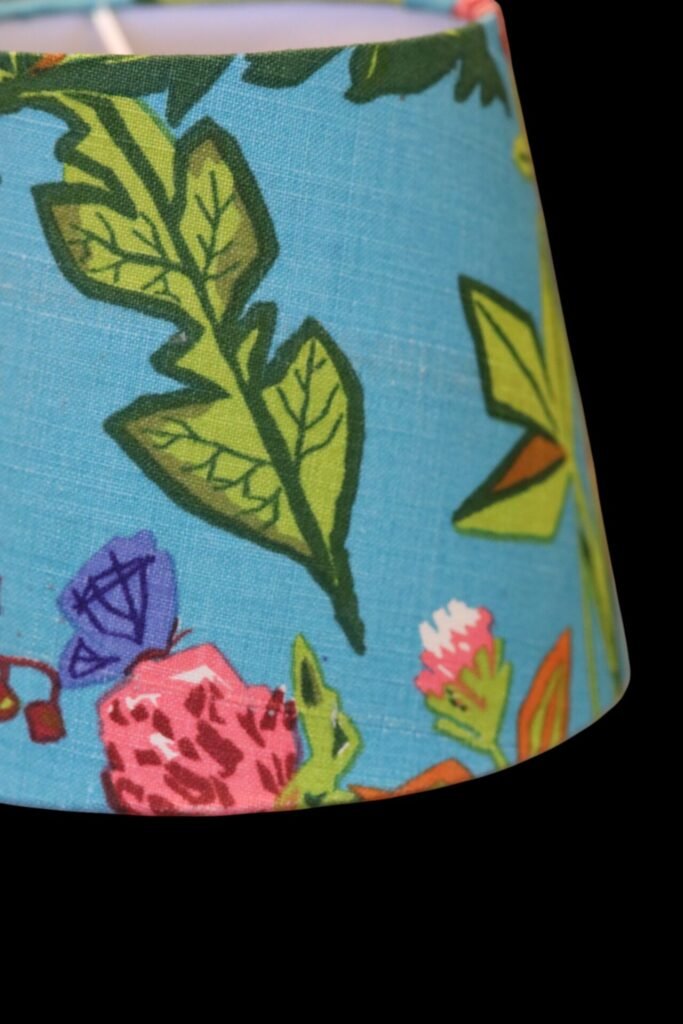 Lampskärm klädd i linnetyget Aurora formgivet Lisbet Jobs och modellen är i den tidsenliga modellen med en något bredare bas och passar många olika lampfötter.