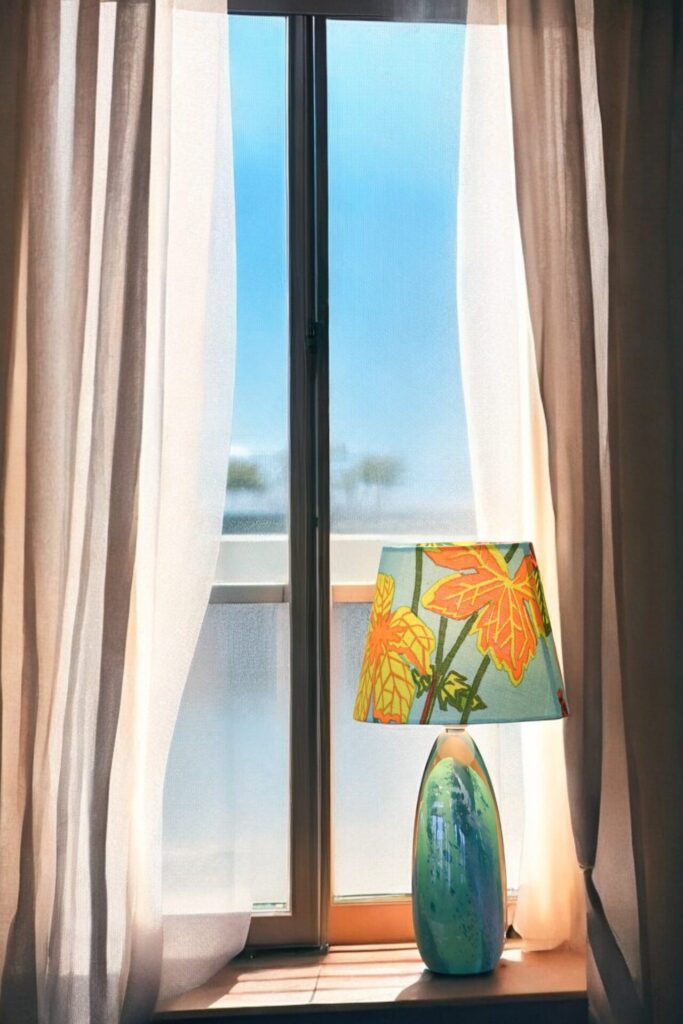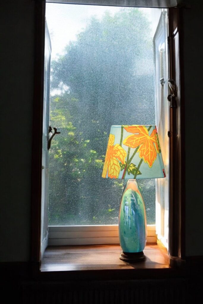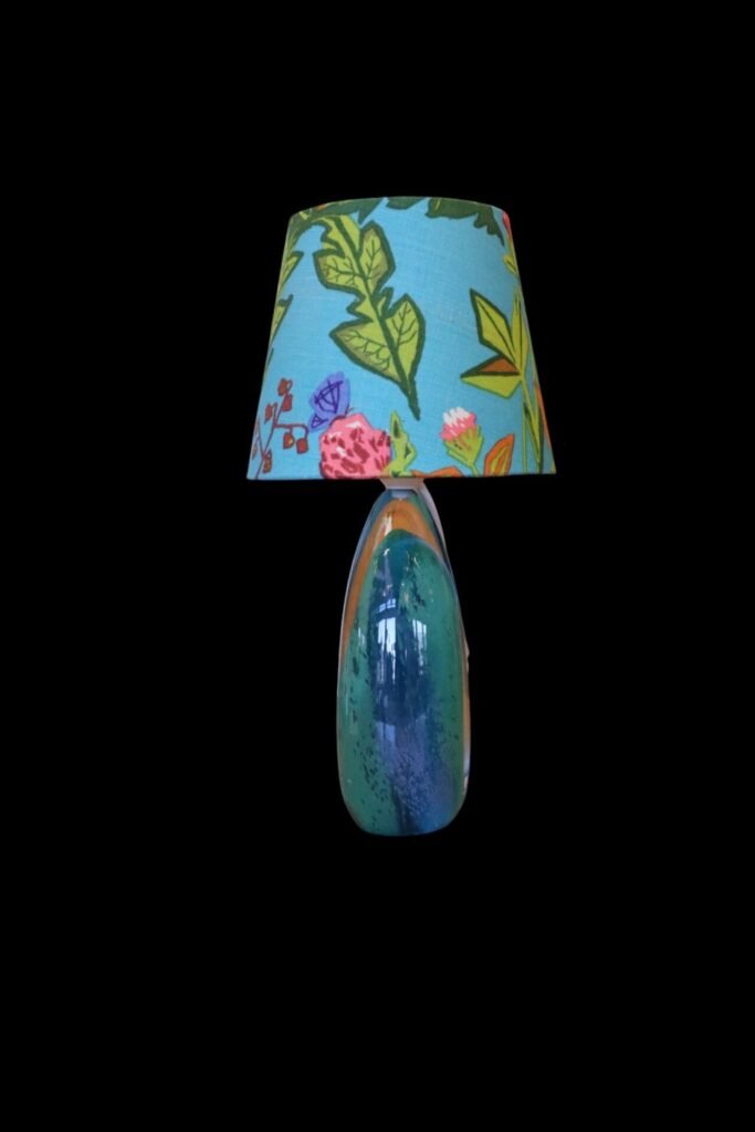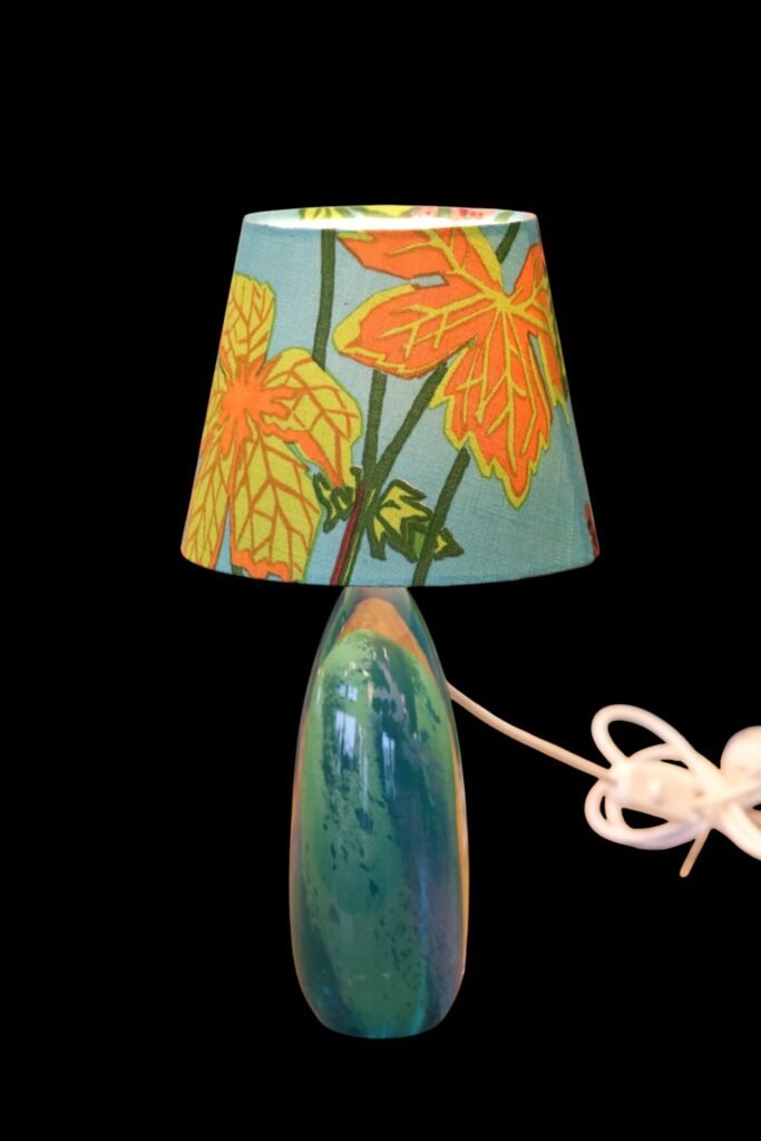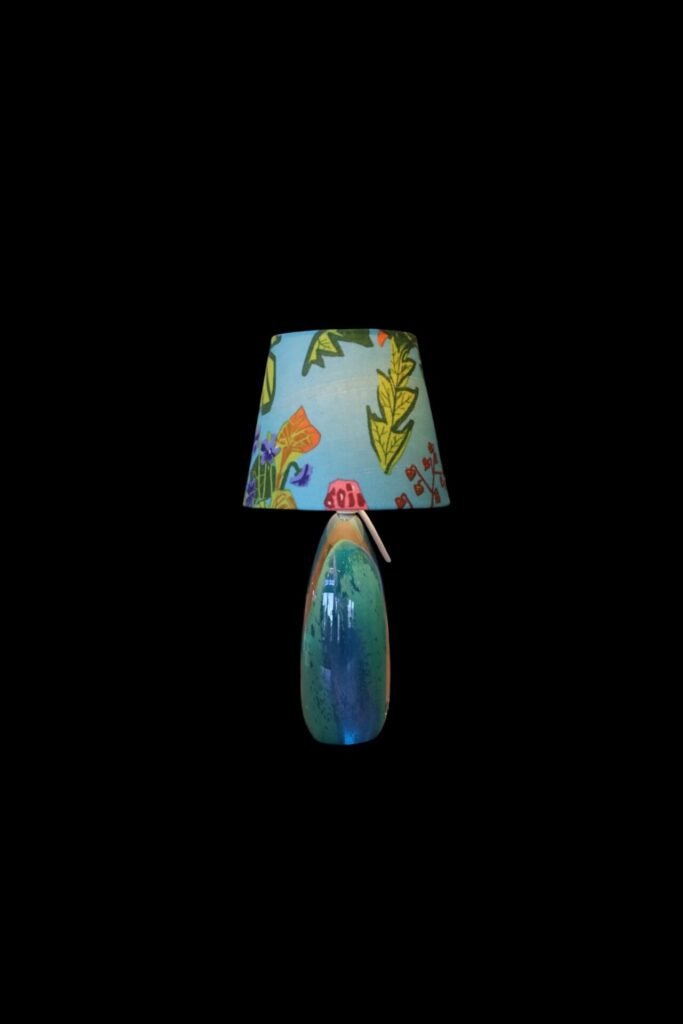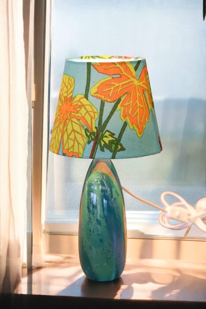 Lampskärm klädd i linnetyget Aurora formgivet Lisbet Jobs och modellen är i den tidsenliga modellen med en något bredare bas och passar många olika lampfötter.