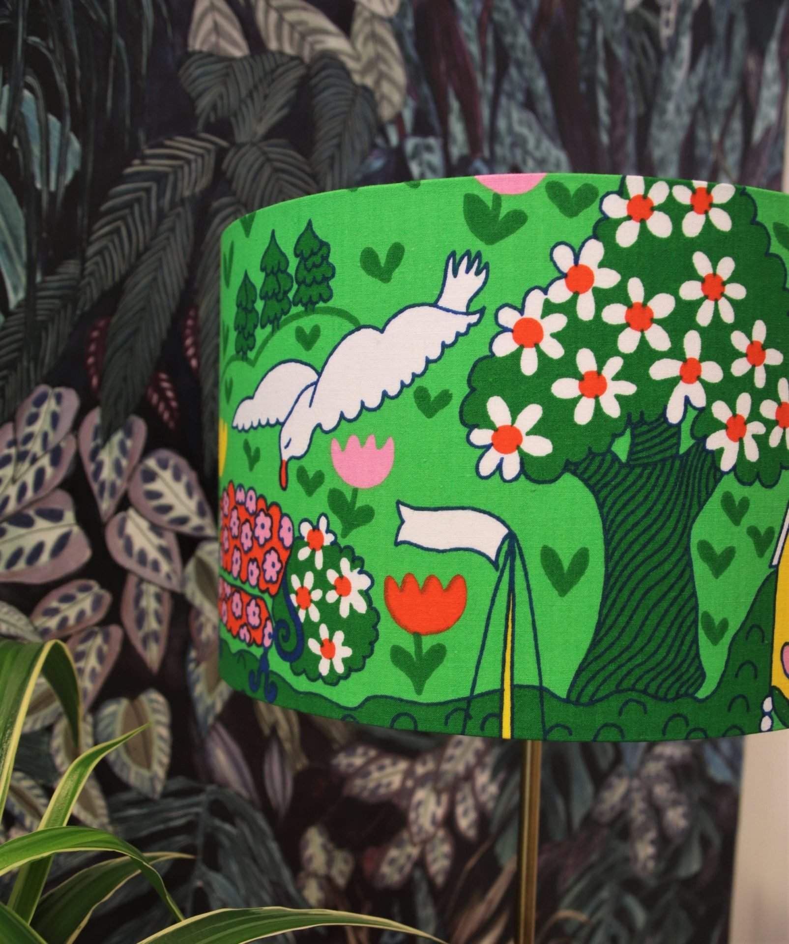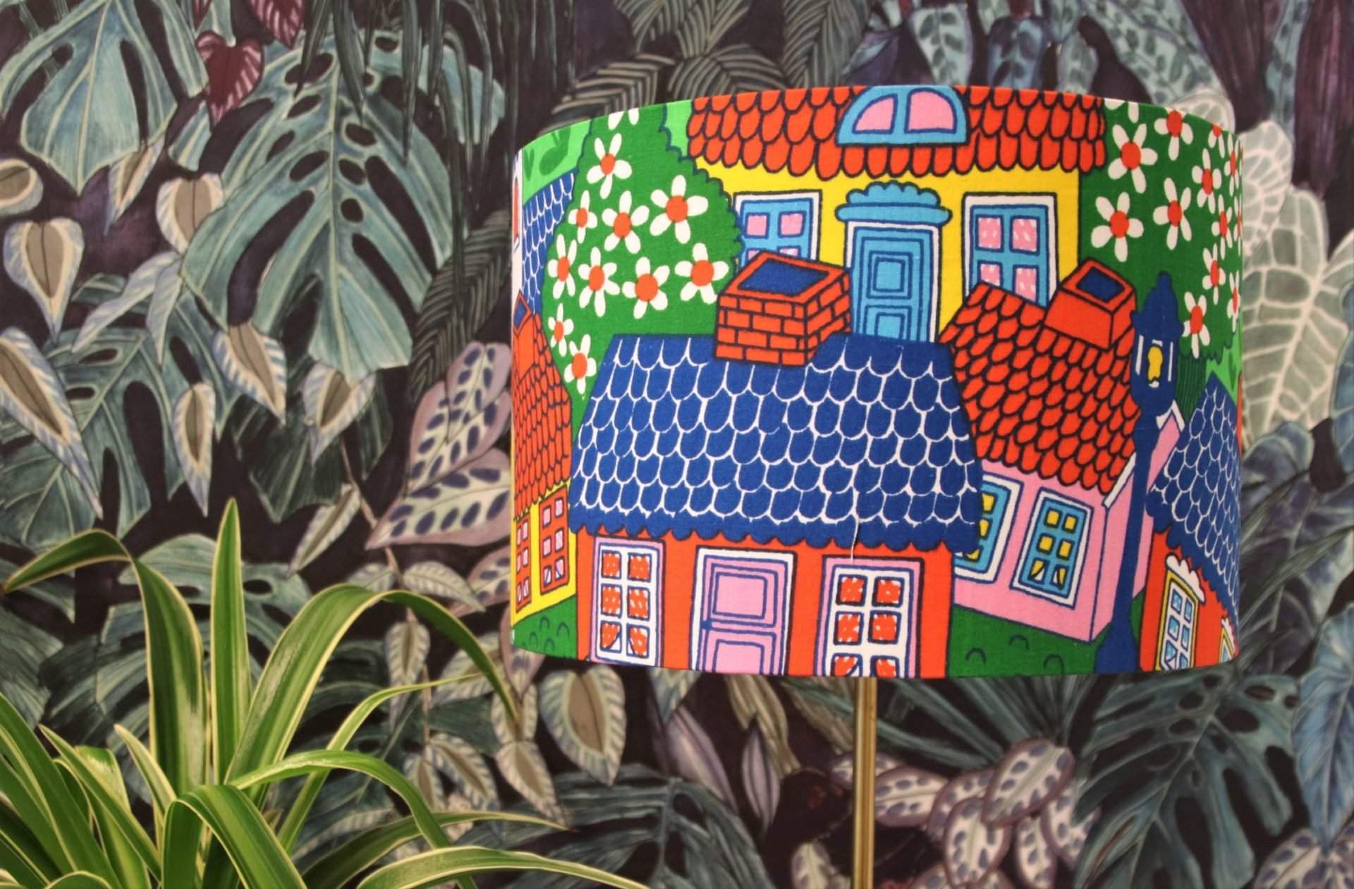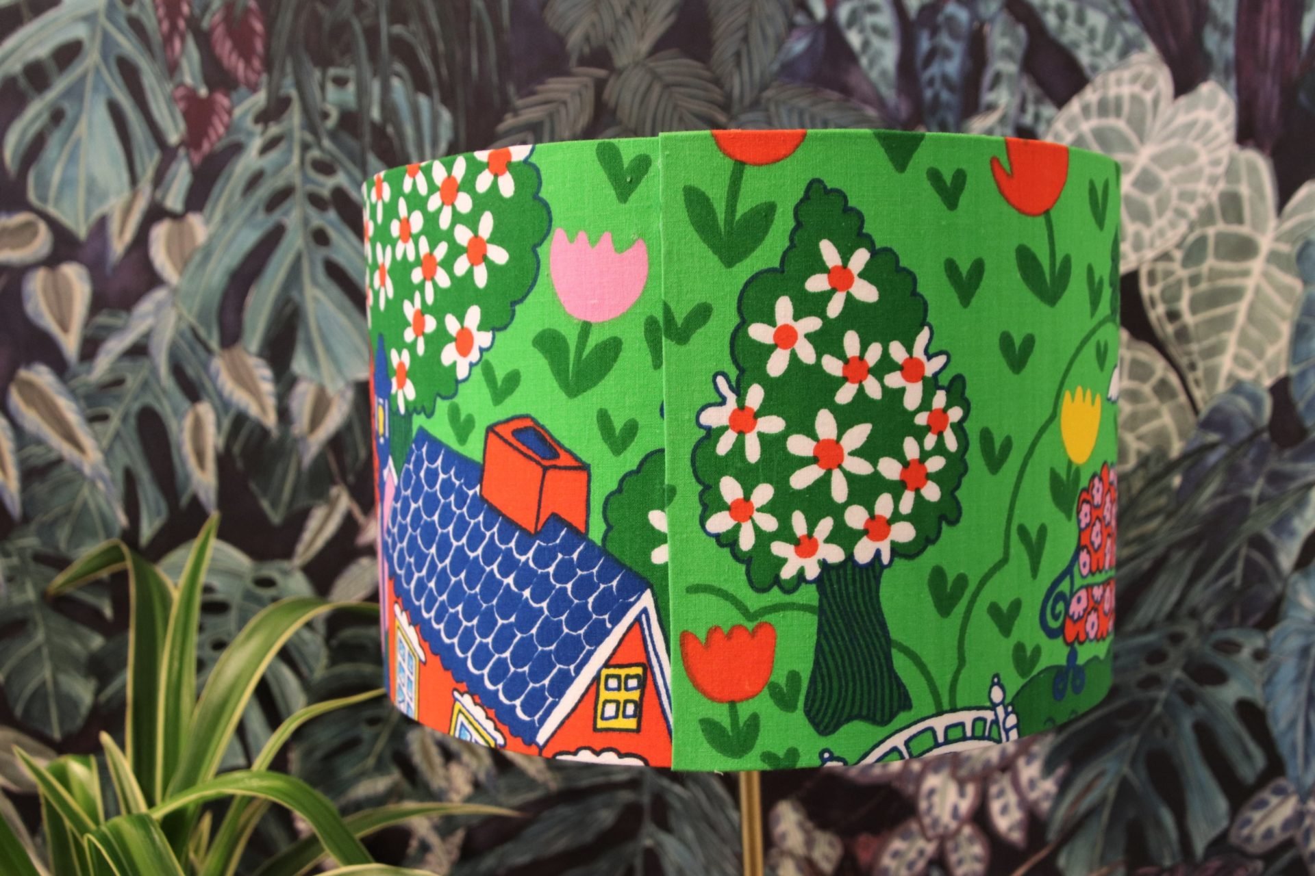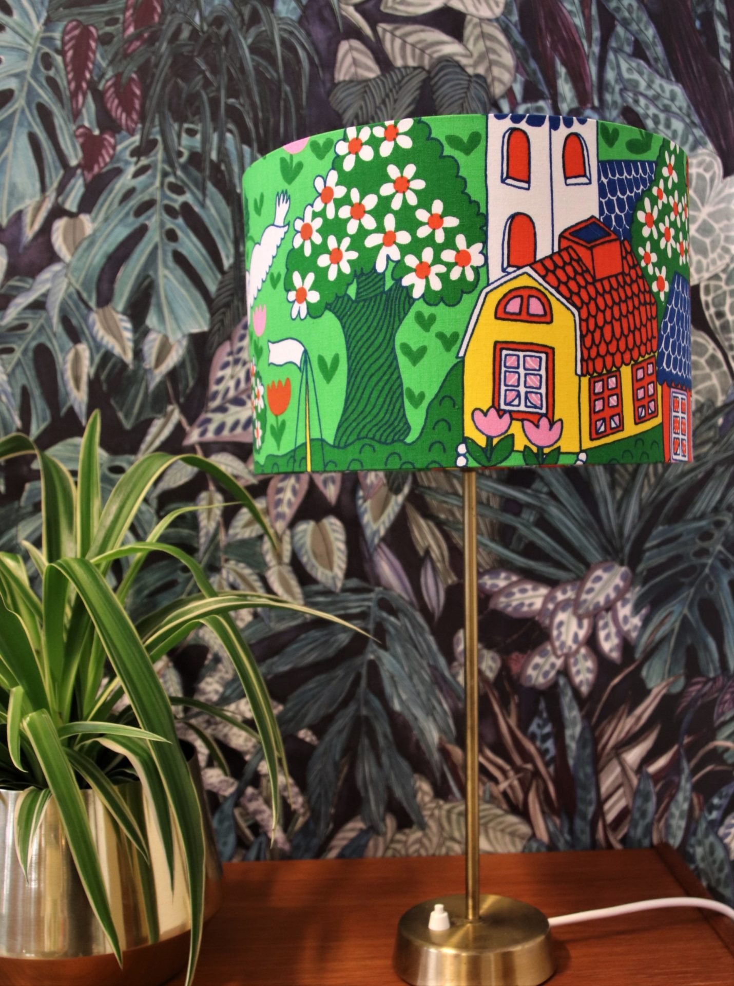 Lampskärm klädd i ett tyg med ett så kallat berättande mönster. I mönstret finns det hus, kyrktorn, träd, blommor, fåglar… allt i klara fina färger.