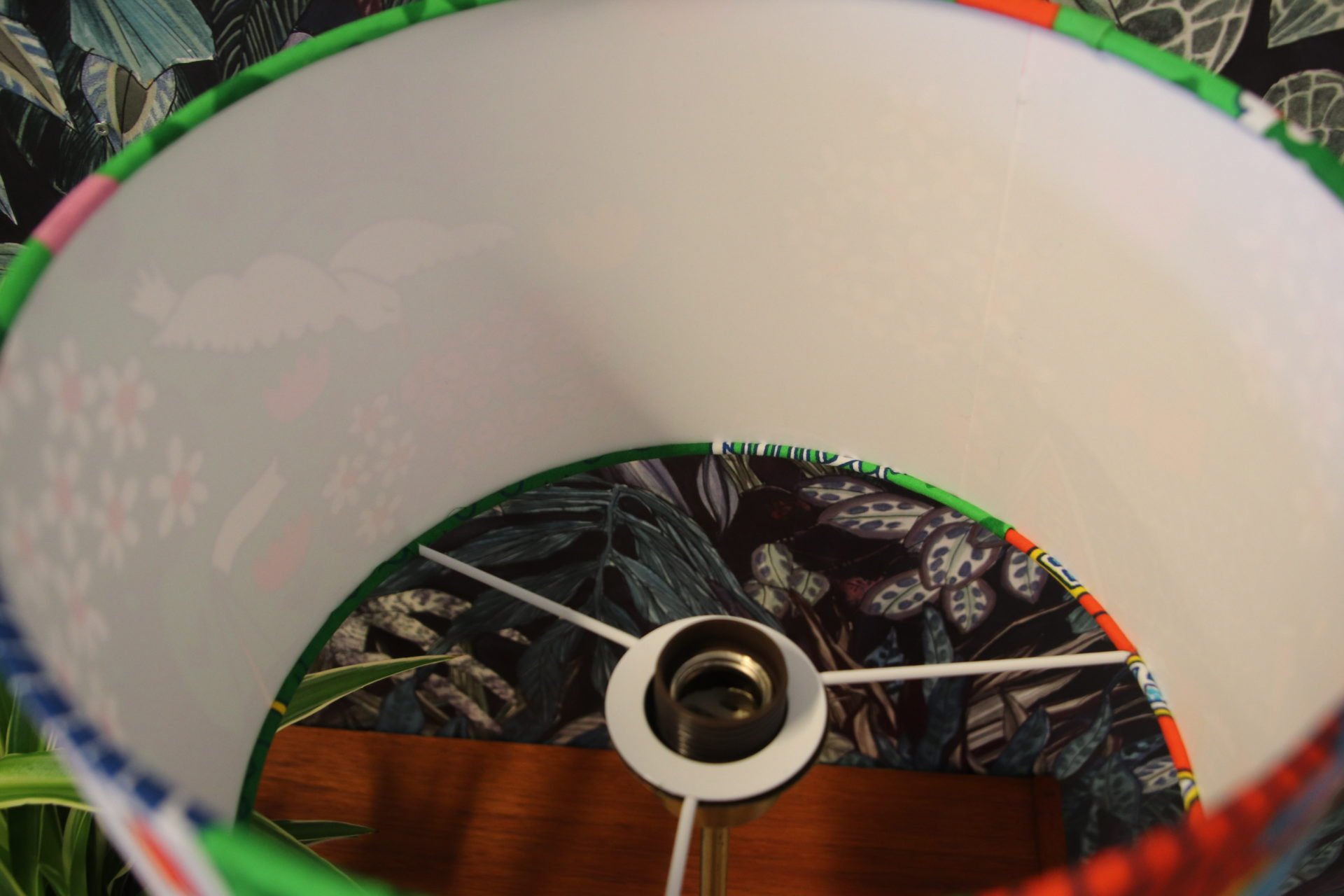 Lampskärm klädd i barntyg från 1960-talet. 30 cm ø