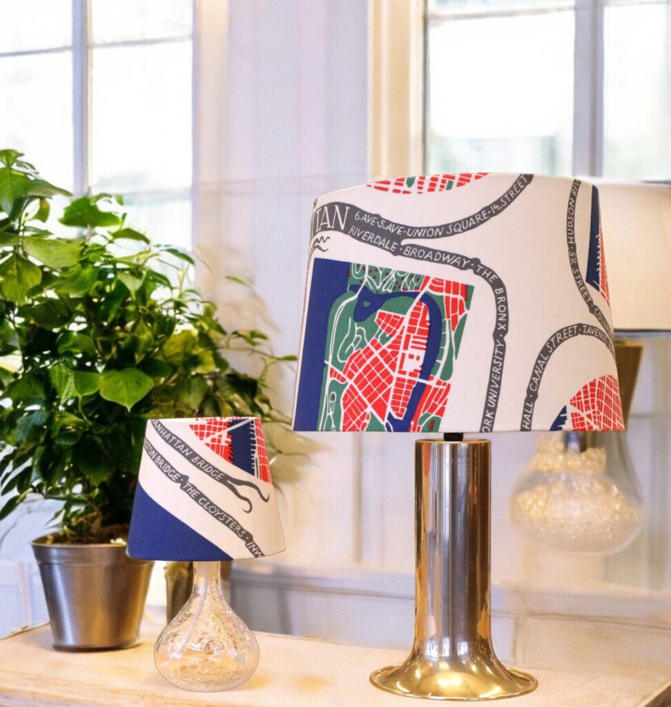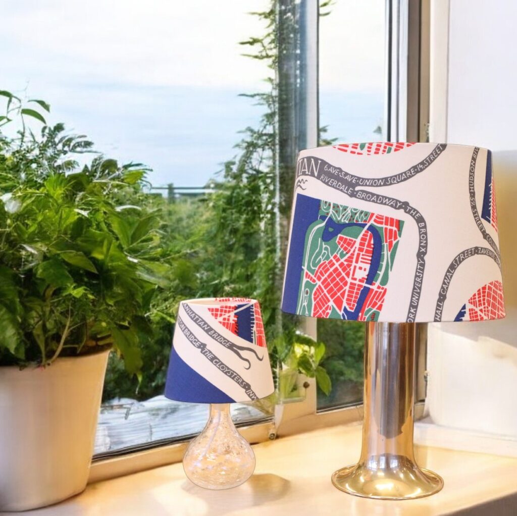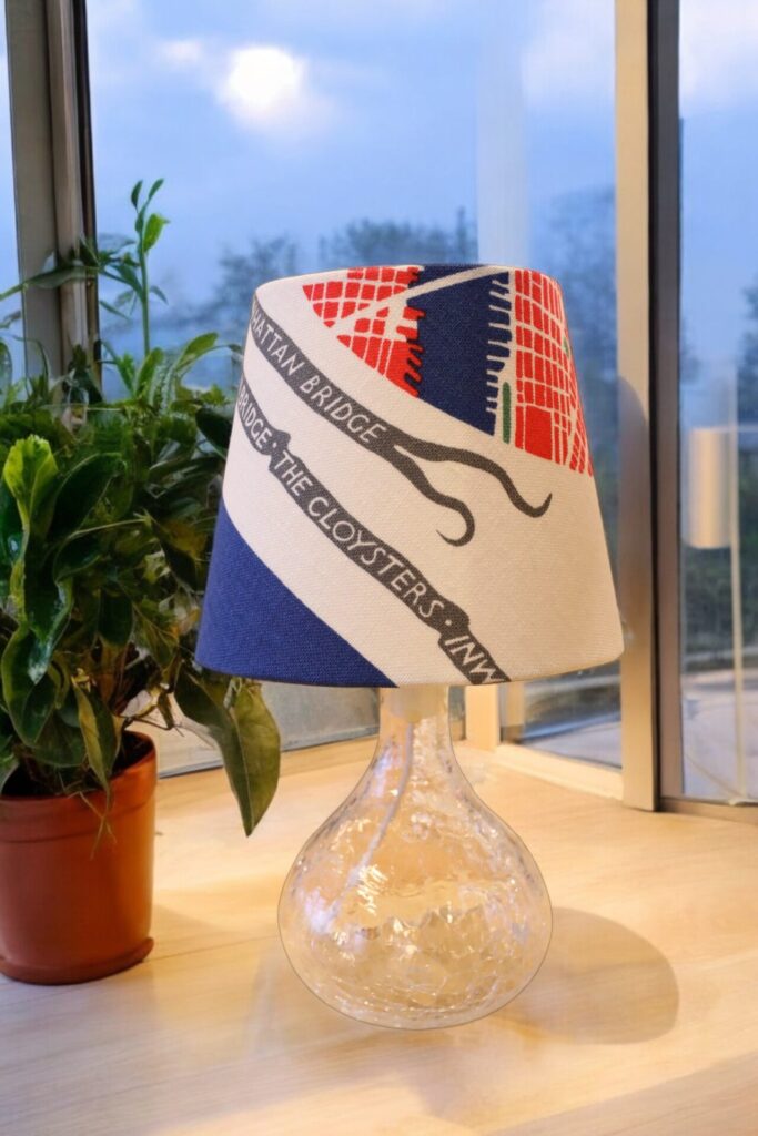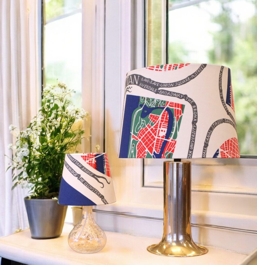 Lampskärm i traditionell konisk modell i linnetyget Manhattan med vit botten. Skärmen är i en storlek som gör att den passar både till golvlampa och till bordslampa.