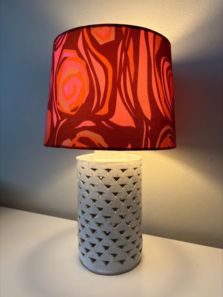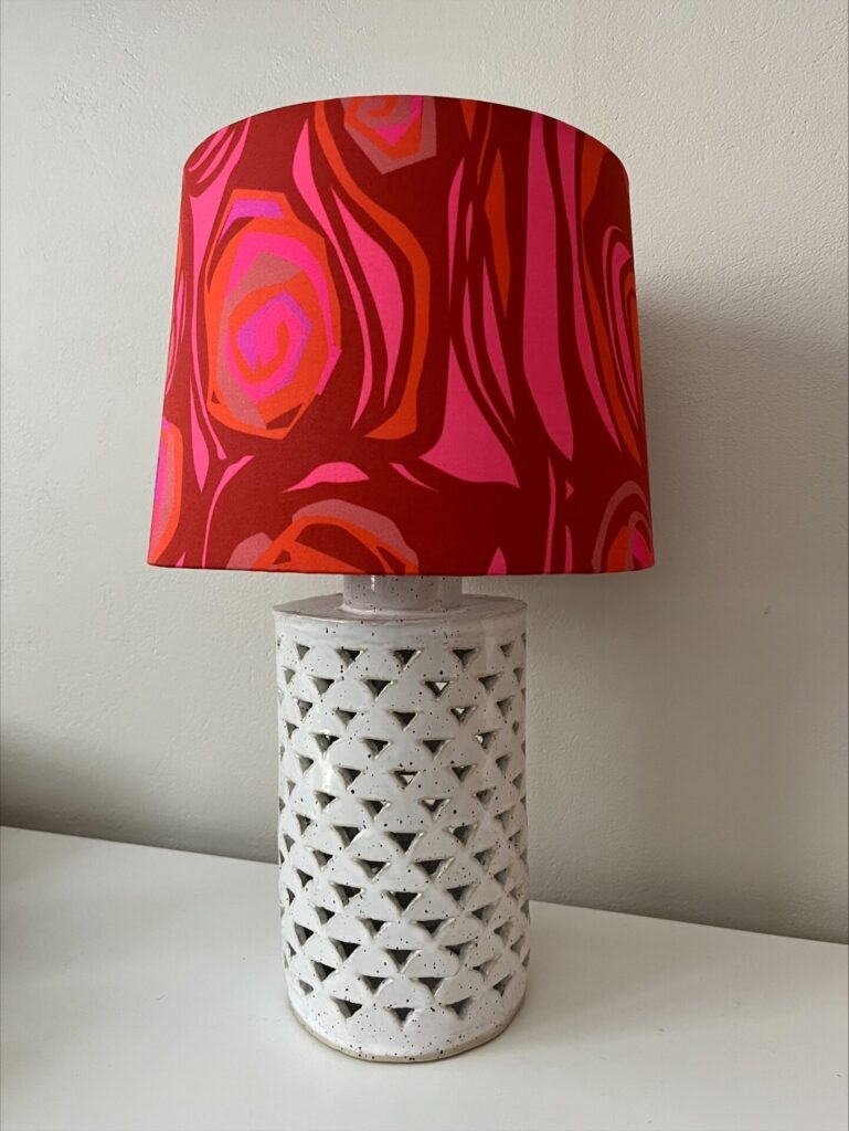 Lampskärm i klädd i tyget Ruusu formgivet av Marjatta Metsovaara. Skärmen är i den tidsenliga modellen med en något bredare bas och passar många olika lampfötter.
