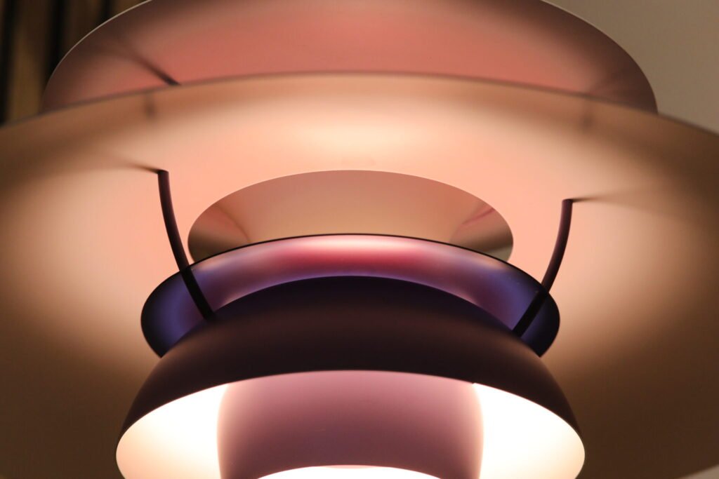 Lampan har skärmar i flera lager som är gjorda i trycksvarvat aluminium. Utformningen ger en bländfri belysning och är designad utifrån principen om ett reflekterande flerskärmssystem baserat på en logaritmisk spiral med ljuskällans mittpunkt i spiralens centrum. Detta innebär att PH 5 sprider ett varmt, behagligt ljus.