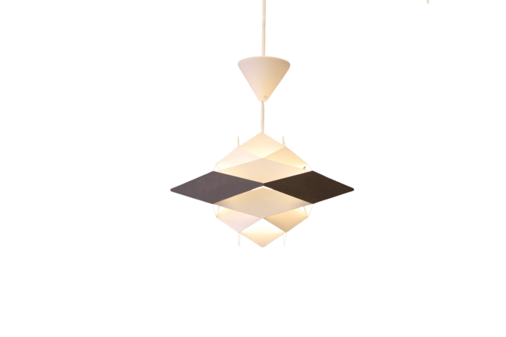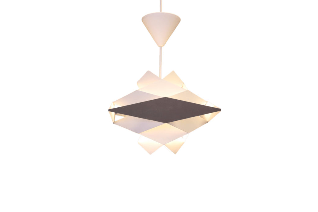 Den här vackra lampan är formgiven av Preben Dahl för Hans Følsgaard A/S i Danmark. Modellen heter Symfoni och är tillverkad i mörkgrå och vit metall.