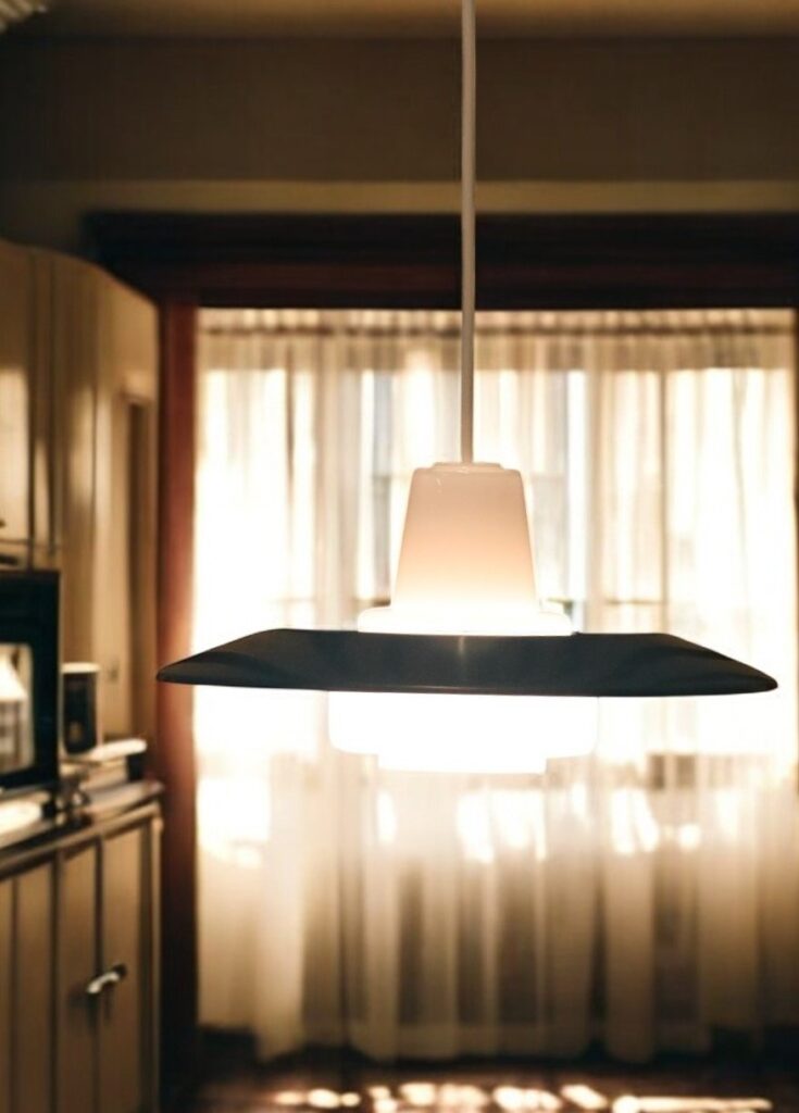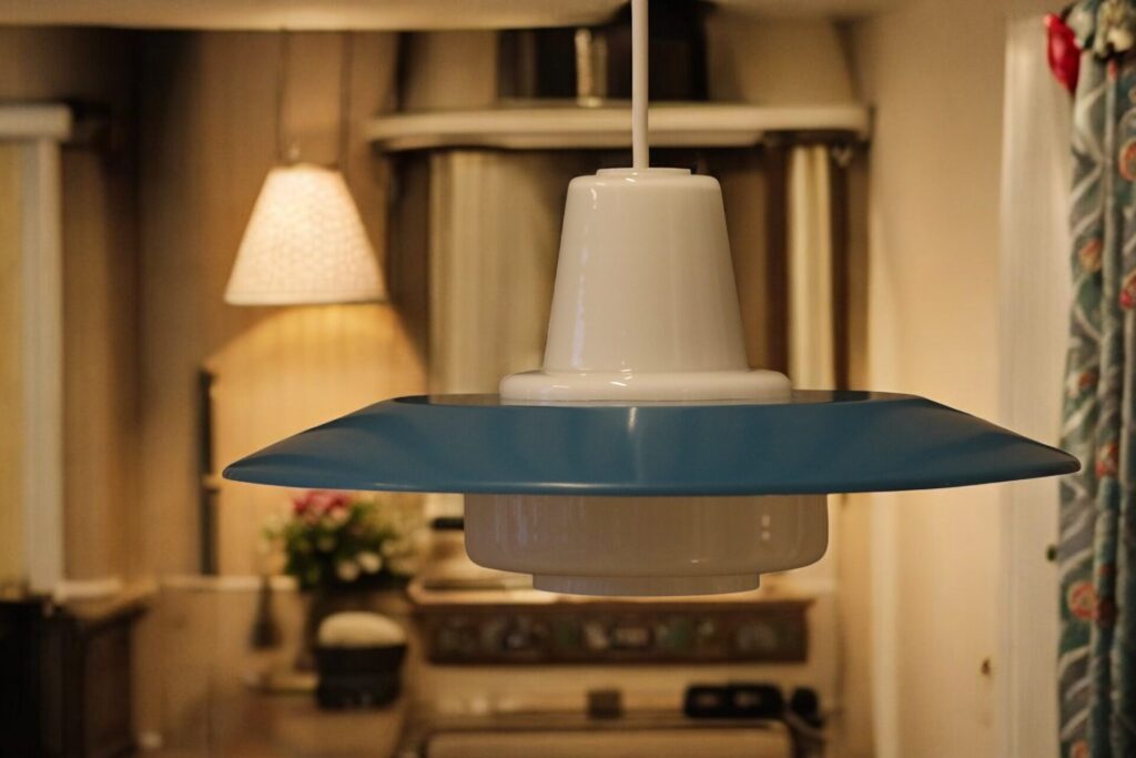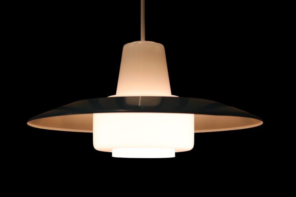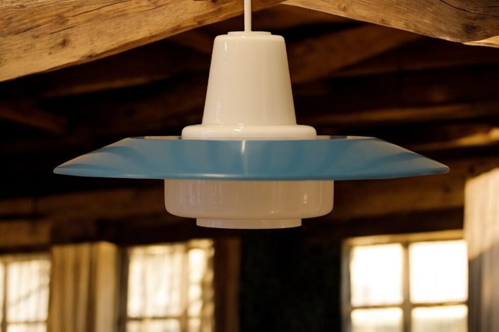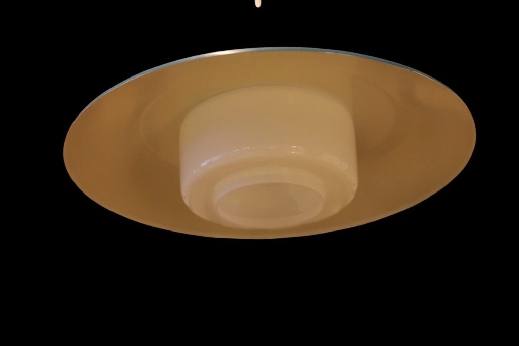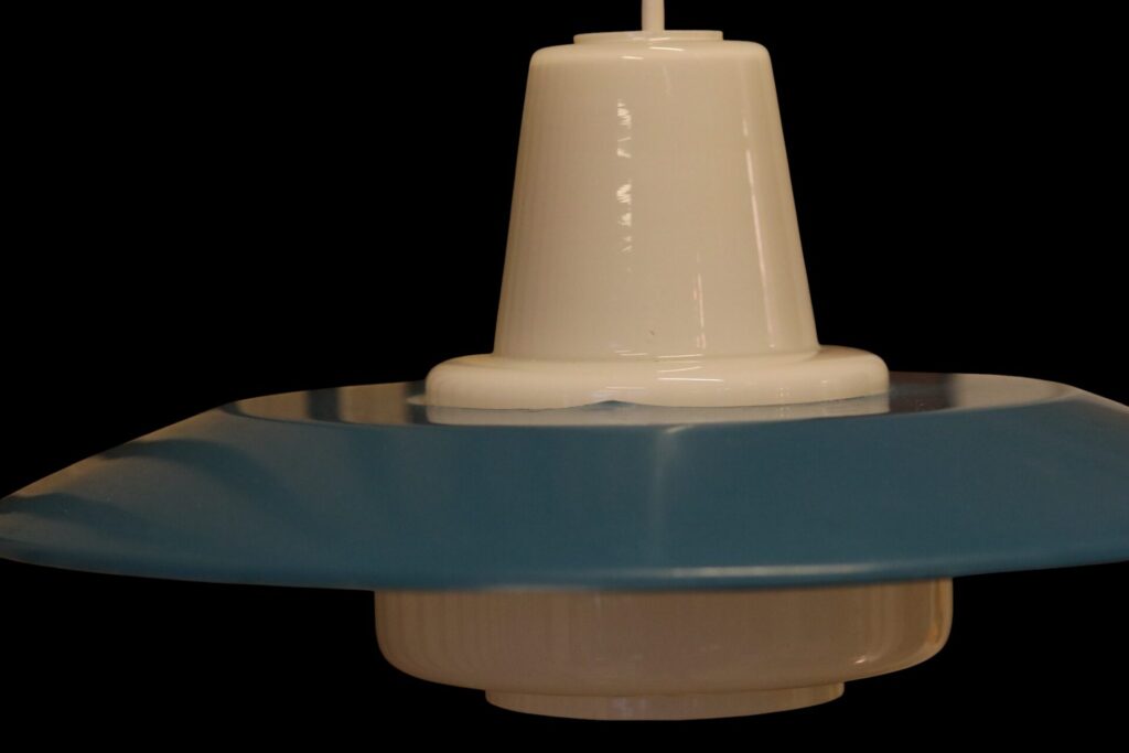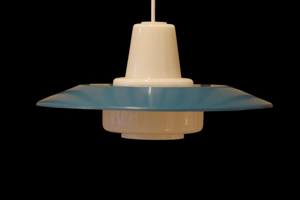 Nätt taklampa från 21950-talet i opalglas och blå metall.