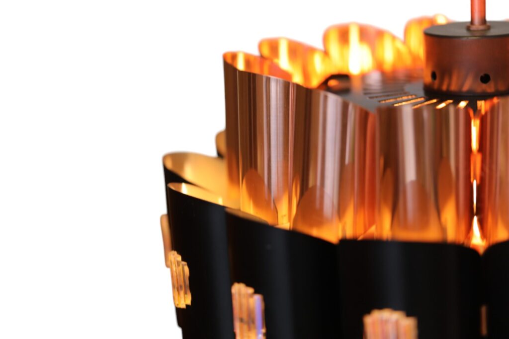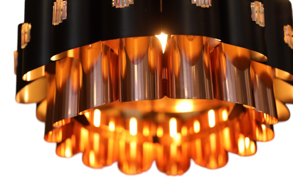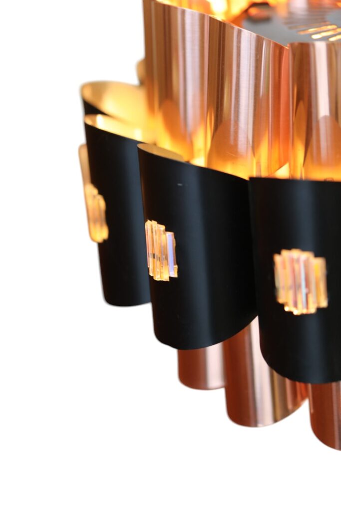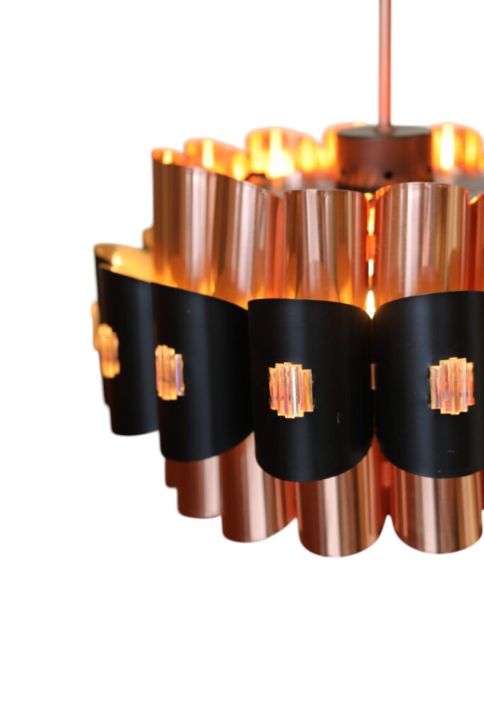 Taklampa i koppar samt svartlackerad plåt med inlagda prismor, formgiven av den välrenommerade designern Werner Schou för det danska företaget Coronell Elektro. Elegant belysning som verkligen kombinerar både tidlös stil och funktionalitet och gör den till en utmärkt detalj i alla moderna hem.