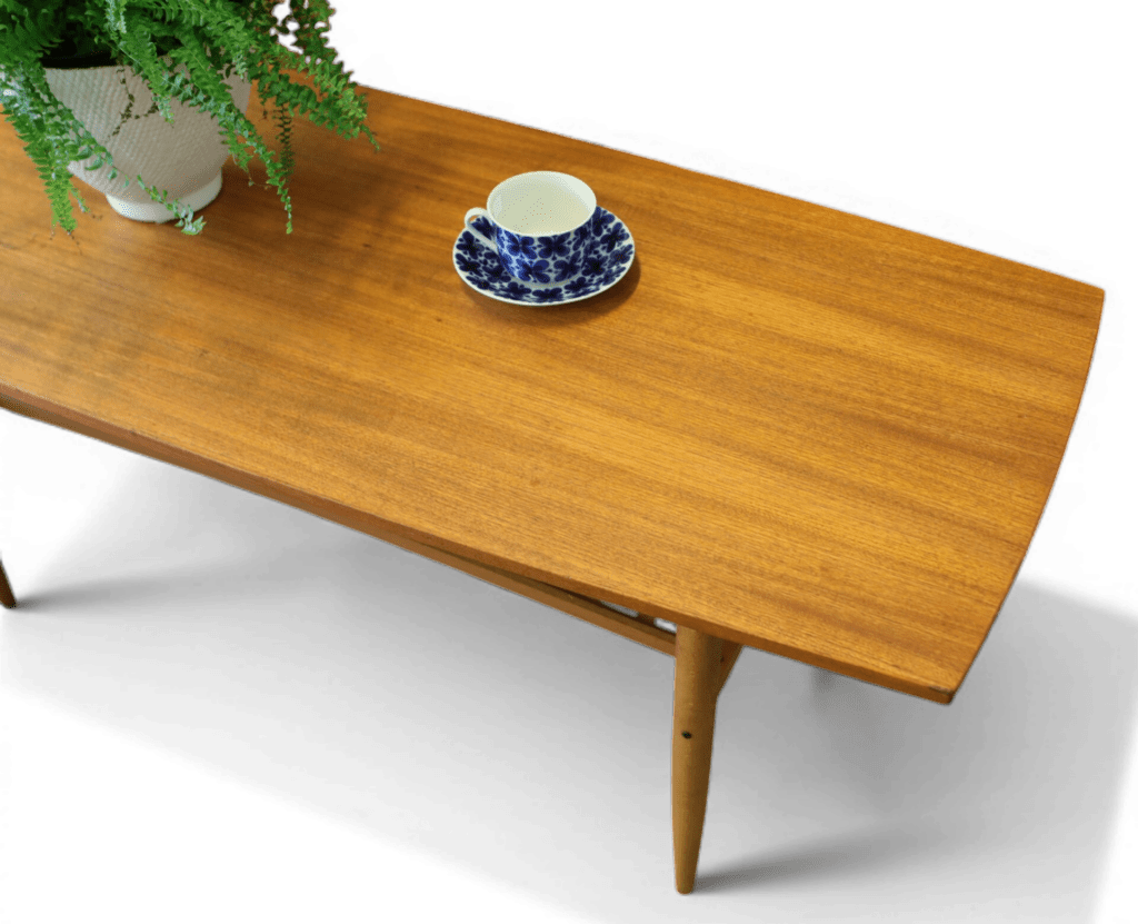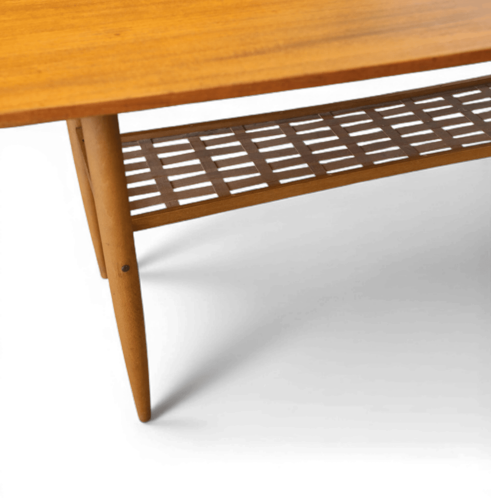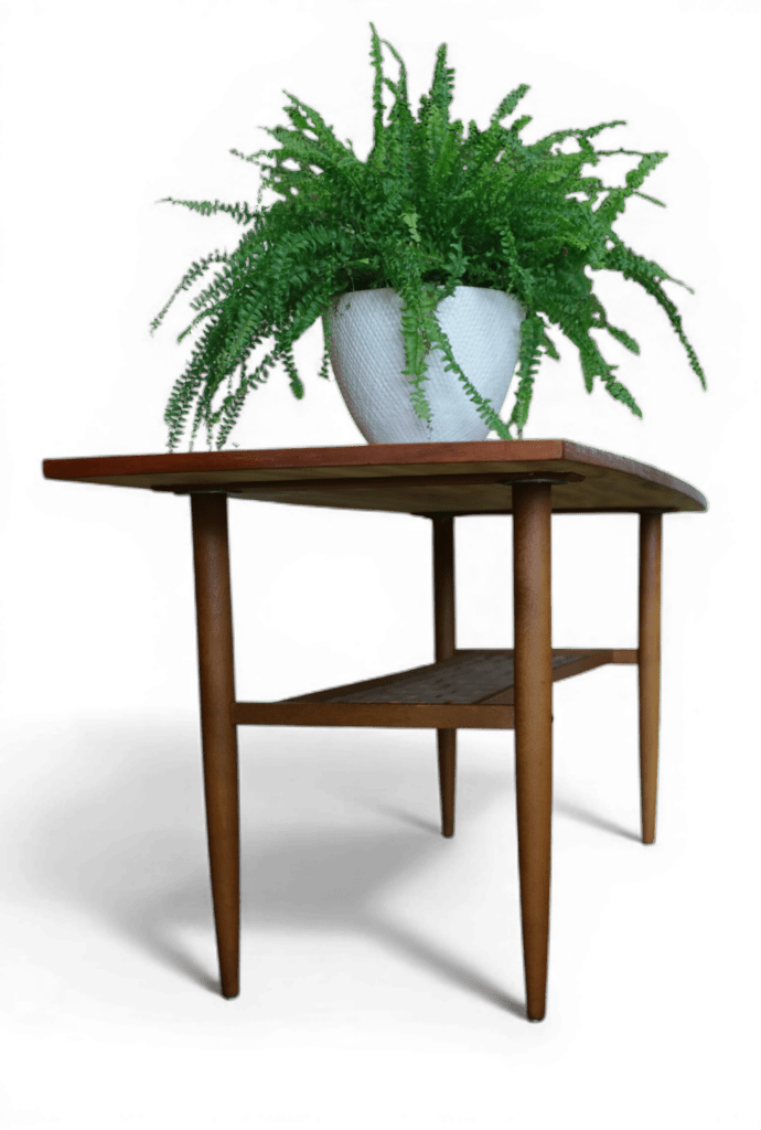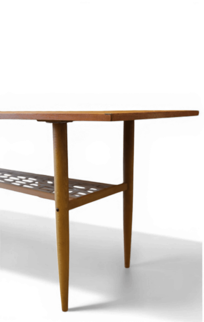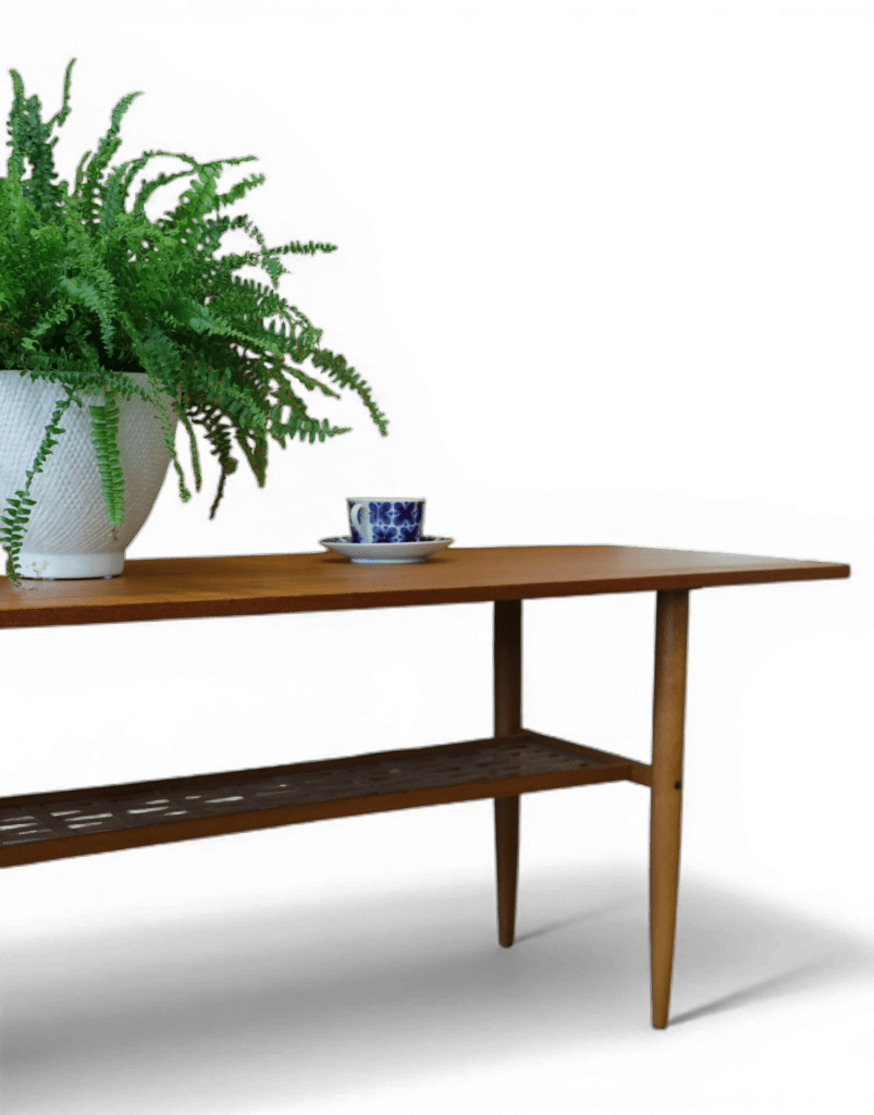 Soffbord i teak med praktisk tidningshylla, tillverkat av Alberts i Tibro. Ett gediget hantverk med härlig kvalitet och tidlös form som passar lika fint i det moderna hemmet som i den mer klassiska miljön.