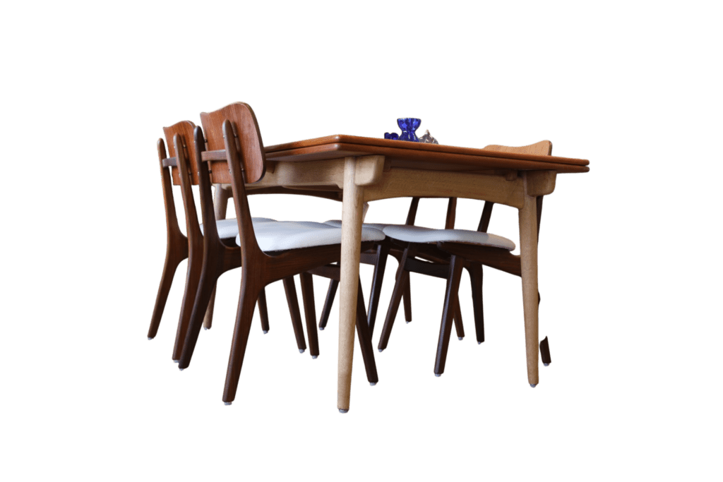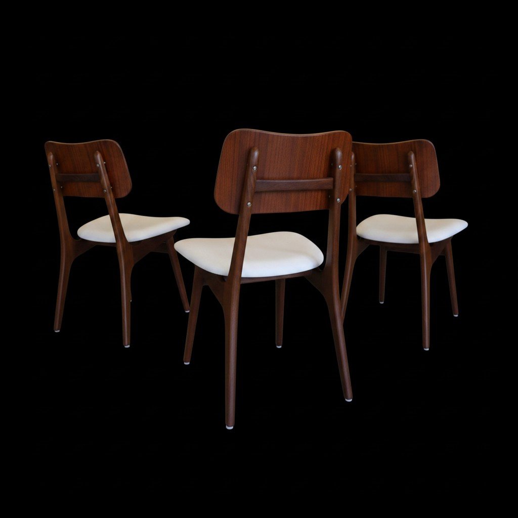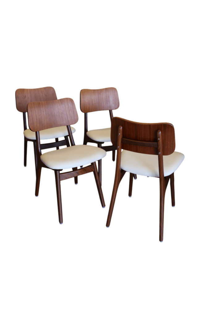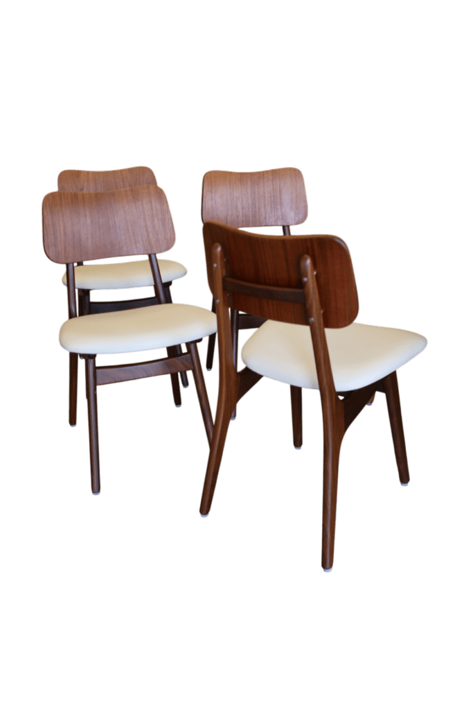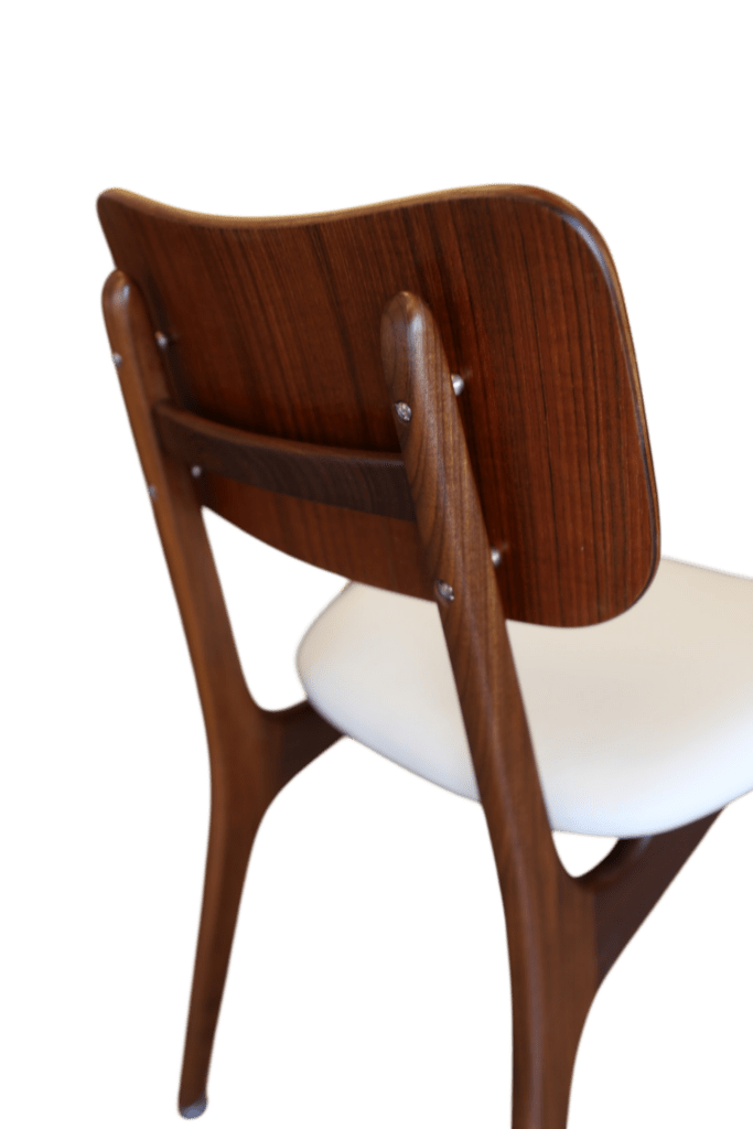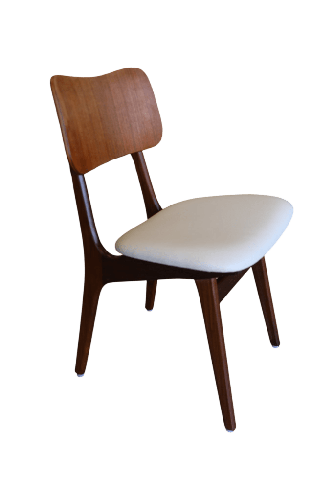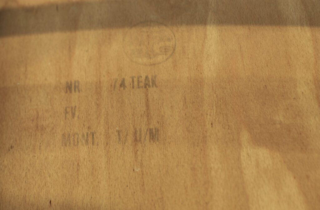 Detta är modell No 75, tillverkad i teak med vackert mörka toner i stommen och en mjukt rundad sits. De kaxigt snedställda benen ger stolen ett modernt och elegant uttryck, samtidigt som den mörkare tonen i teaken skapar fin tyngd och karaktär. Den rundade ryggplattan är utförd i en något ljusare teak, vilket ger en mycket fin kontrast till de mörkare benen och framhäver stolens vackra form på ett harmoniskt sätt.