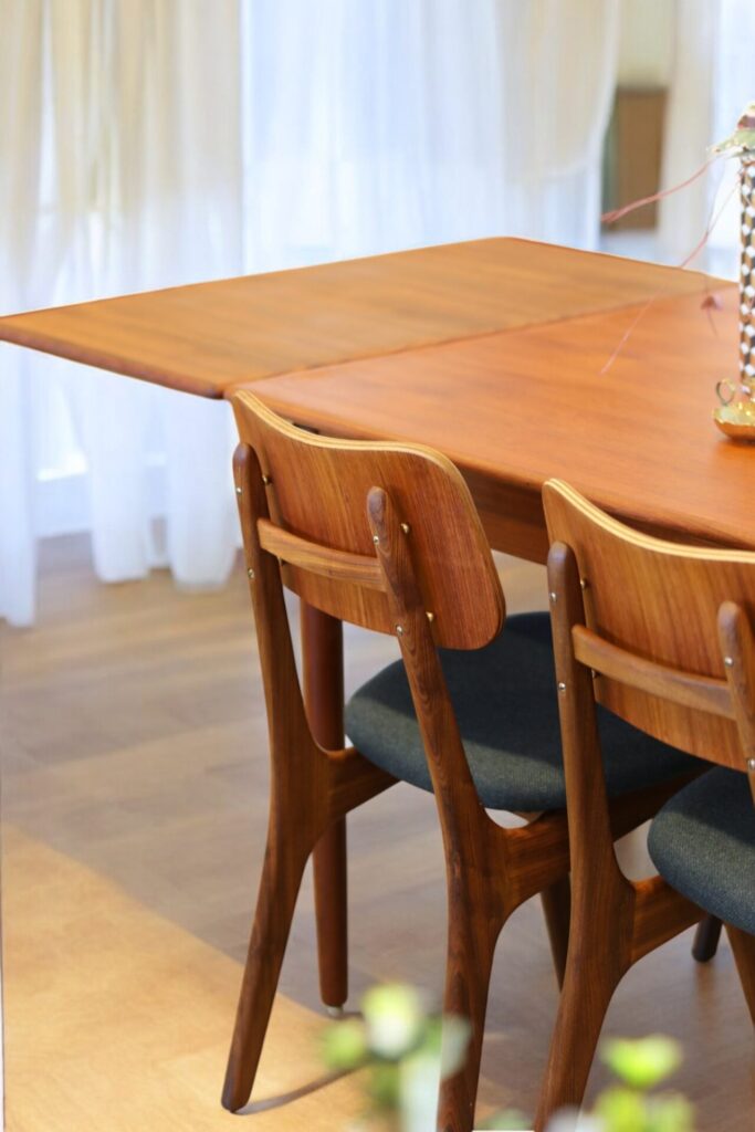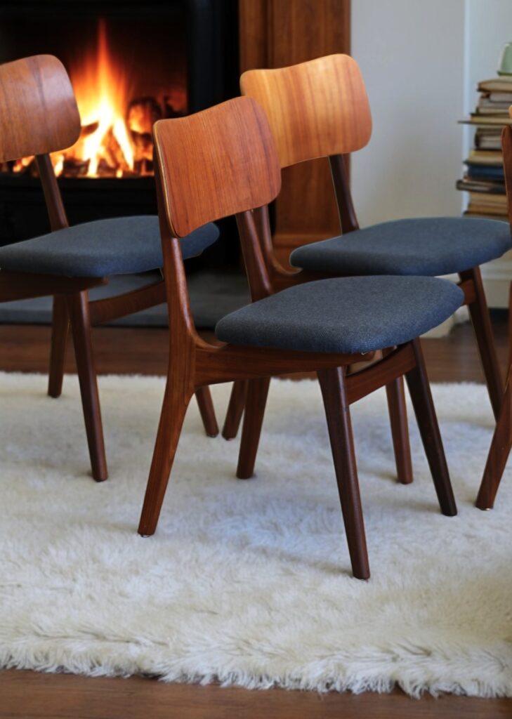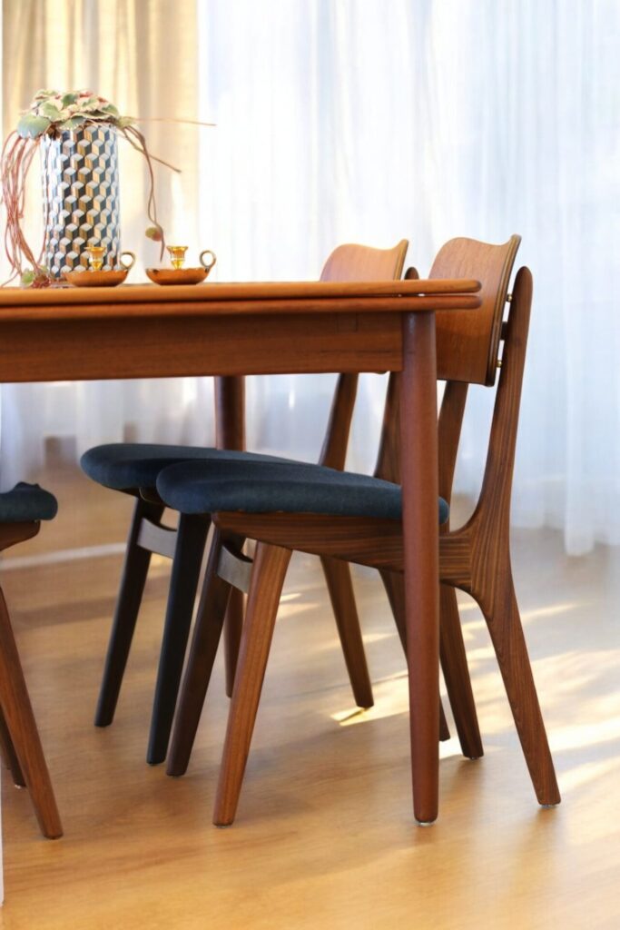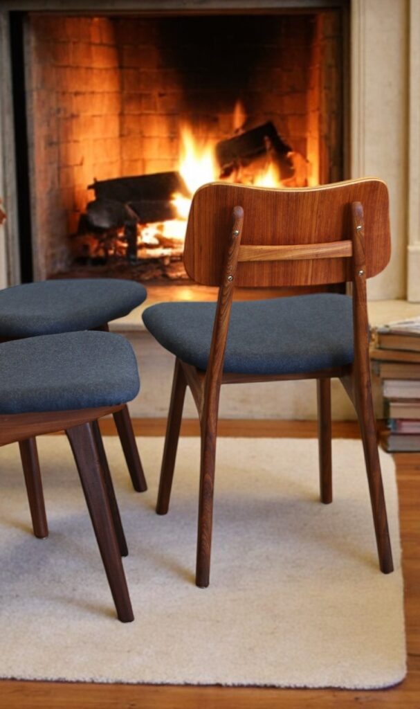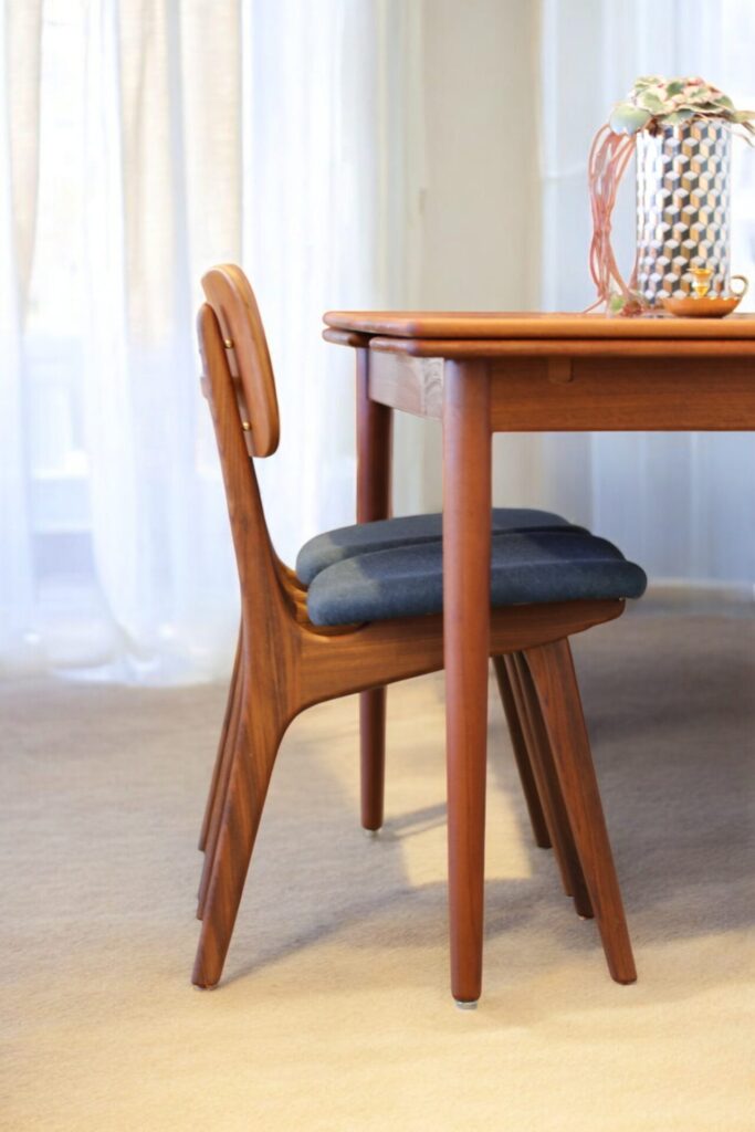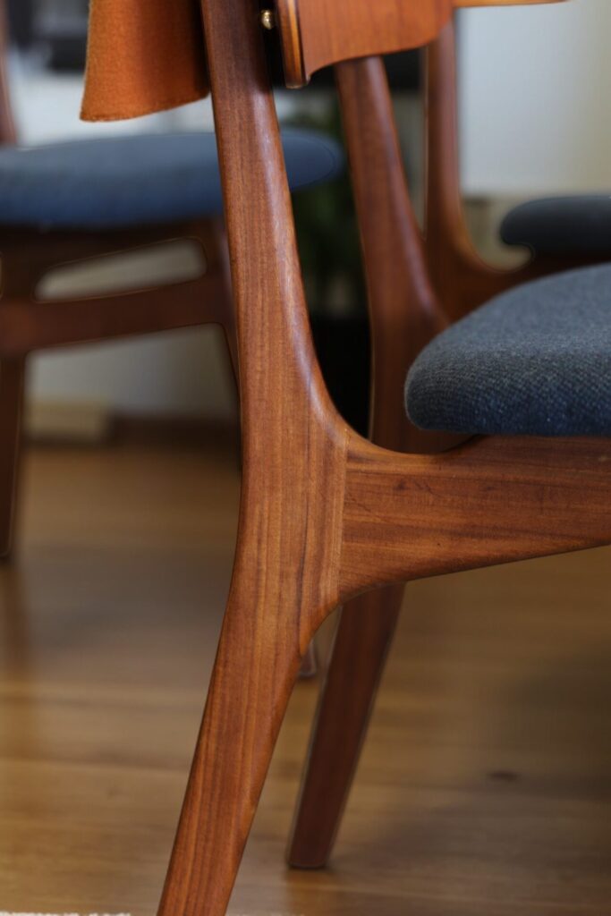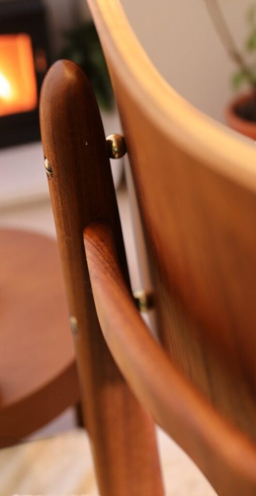 Benen är kaxigt snedställda och i en mörk ton på teaken, vilket skapar en modern och stilren känsla. Den rundade ryggplattan är i en något ljusare teak och ger en fin kontrast mot de mörkare benen. Ryggplattan är smart monterad på bakbenen och har dessutom ett praktiskt handtag på bakryggen. Detta handtag förenklar förflyttningen av stolen väsentligt, vilket gör den idealisk för både hemmabruk och offentliga miljöer. Dessutom är det inte bara funktionellt, utan även en dekorativ detalj som accentueras av de eleganta skruvarna och distanserna i mässing, som bidrar till möbelns helhetsintryck.