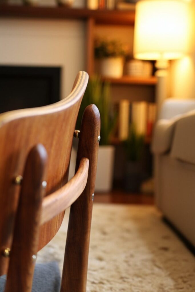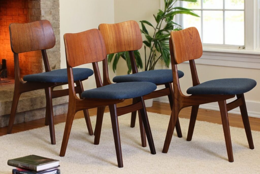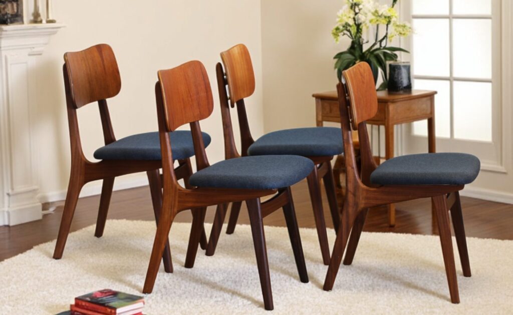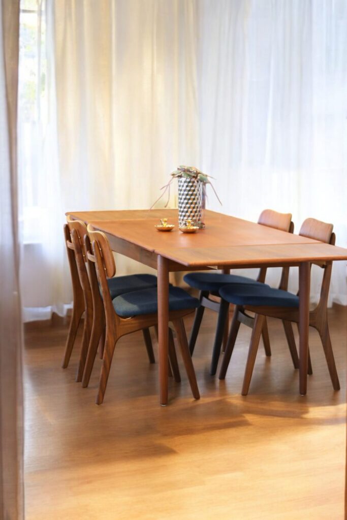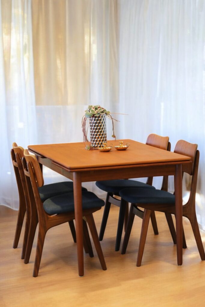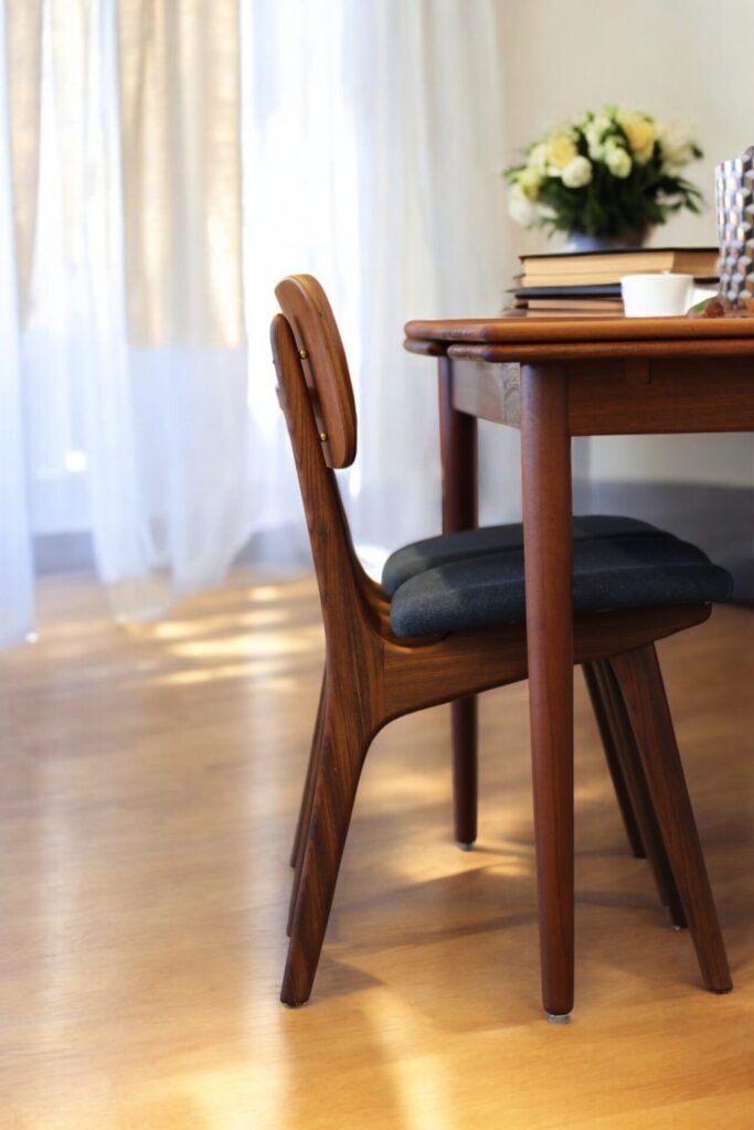 Benen är kaxigt snedställda och i en mörk ton på teaken, vilket skapar en modern och stilren känsla. Den rundade ryggplattan är i en något ljusare teak och ger en fin kontrast mot de mörkare benen. Ryggplattan är smart monterad på bakbenen och har dessutom ett praktiskt handtag på bakryggen. Detta handtag förenklar förflyttningen av stolen väsentligt, vilket gör den idealisk för både hemmabruk och offentliga miljöer. Dessutom är det inte bara funktionellt, utan även en dekorativ detalj som accentueras av de eleganta skruvarna och distanserna i mässing, som bidrar till möbelns helhetsintryck.