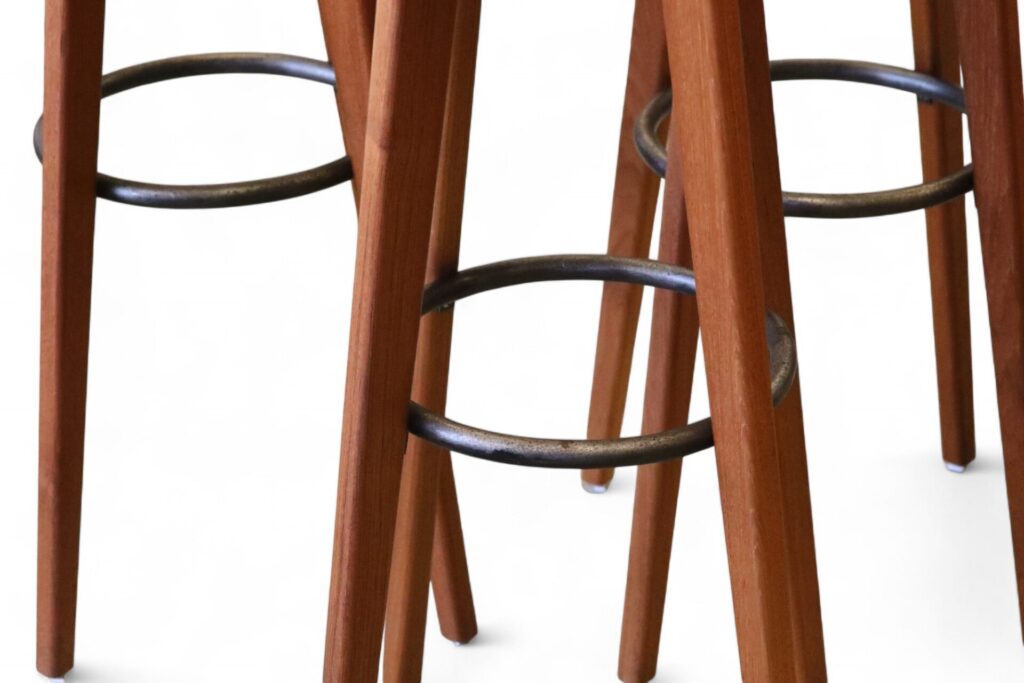Pallen har långa, eleganta ben i teak som accentuerar den rundade sitsens konturer. De runda fotstöden i metall bidrar inte bara till möbelns stil och estetik, utan tillför även en extra dimension av funktionalitet och komfort.