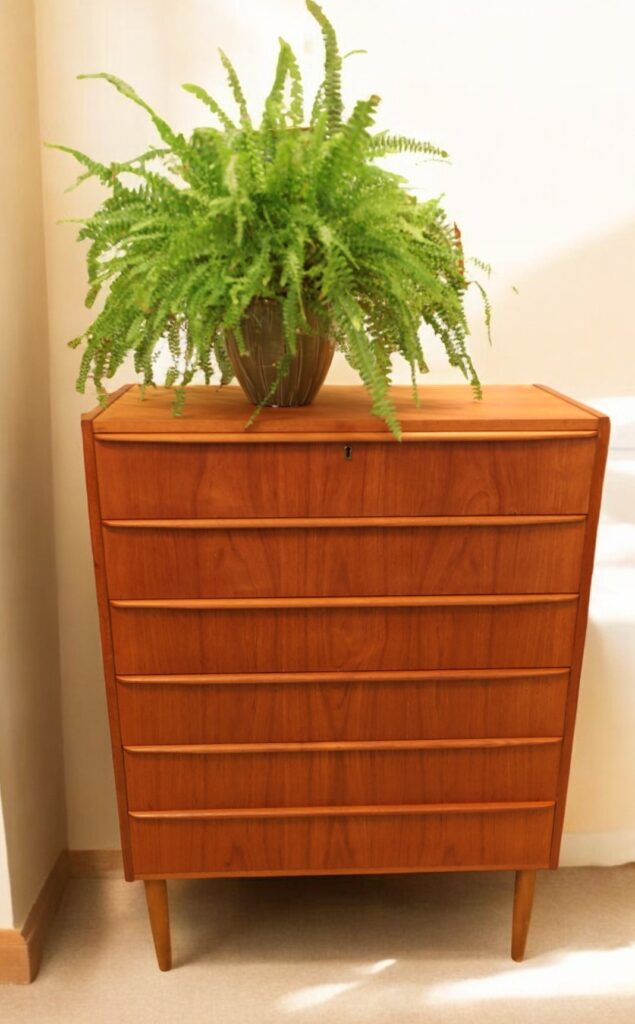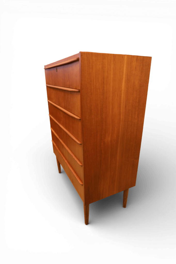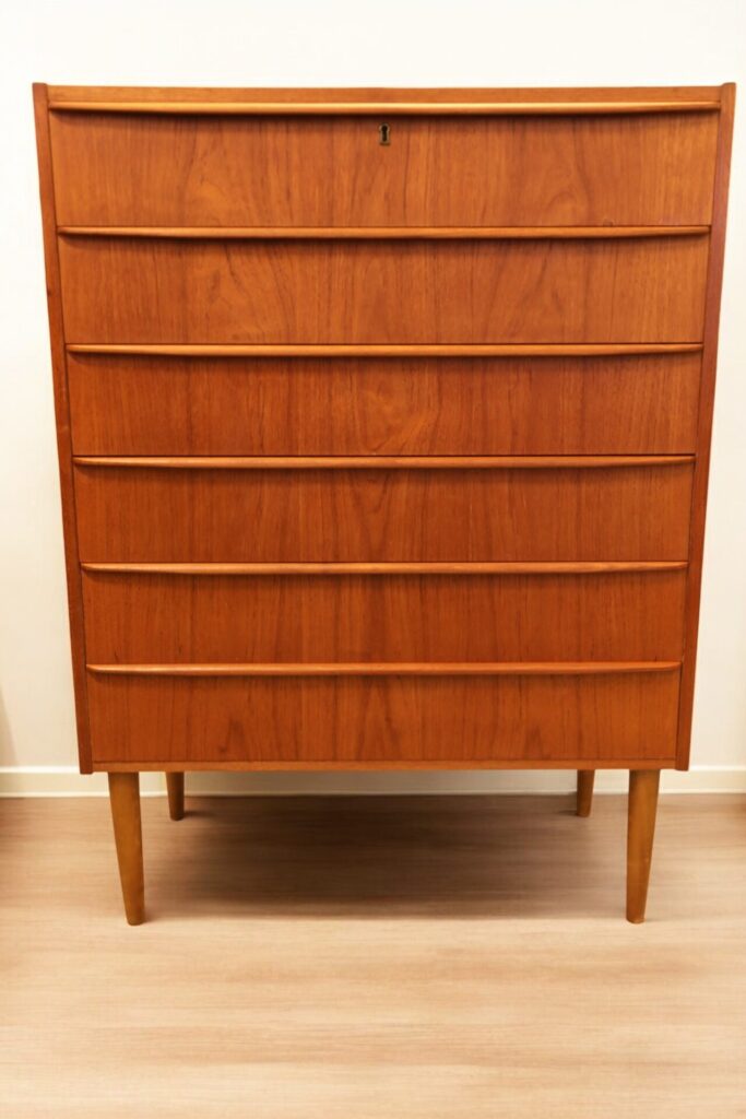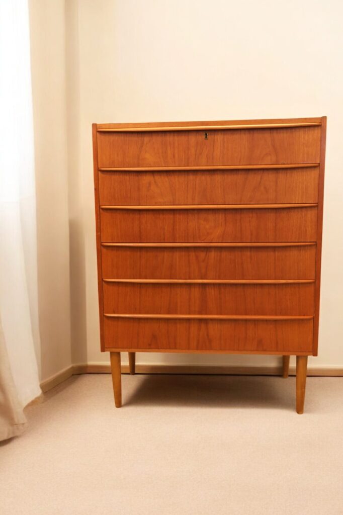 Dansk stilren byrå i teak med sex lådor med eleganta längsgående handtag.