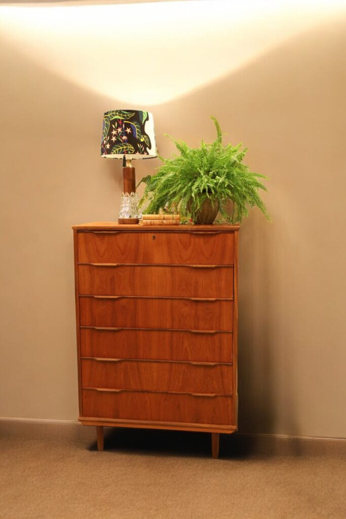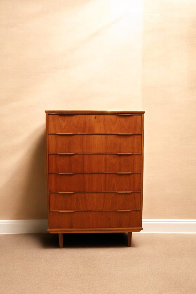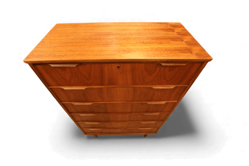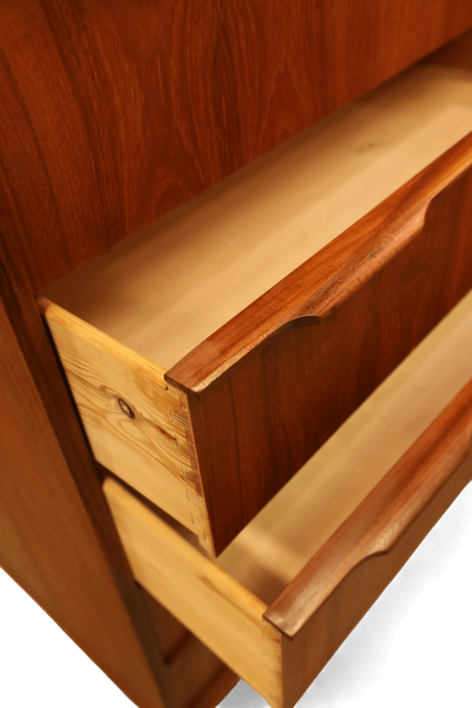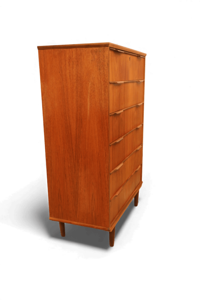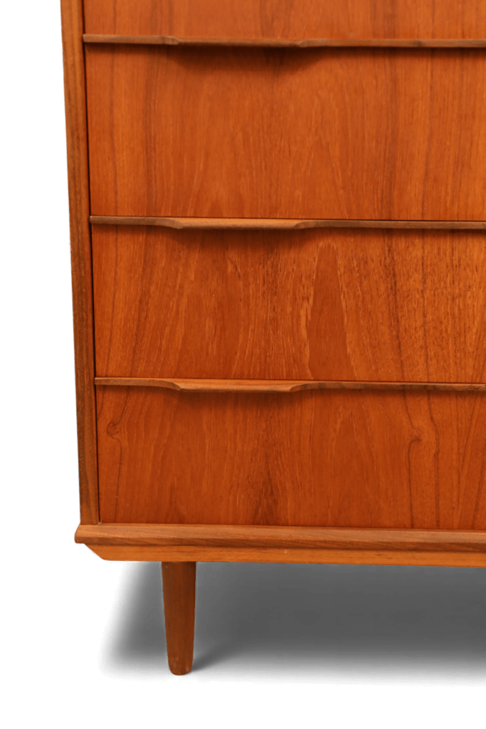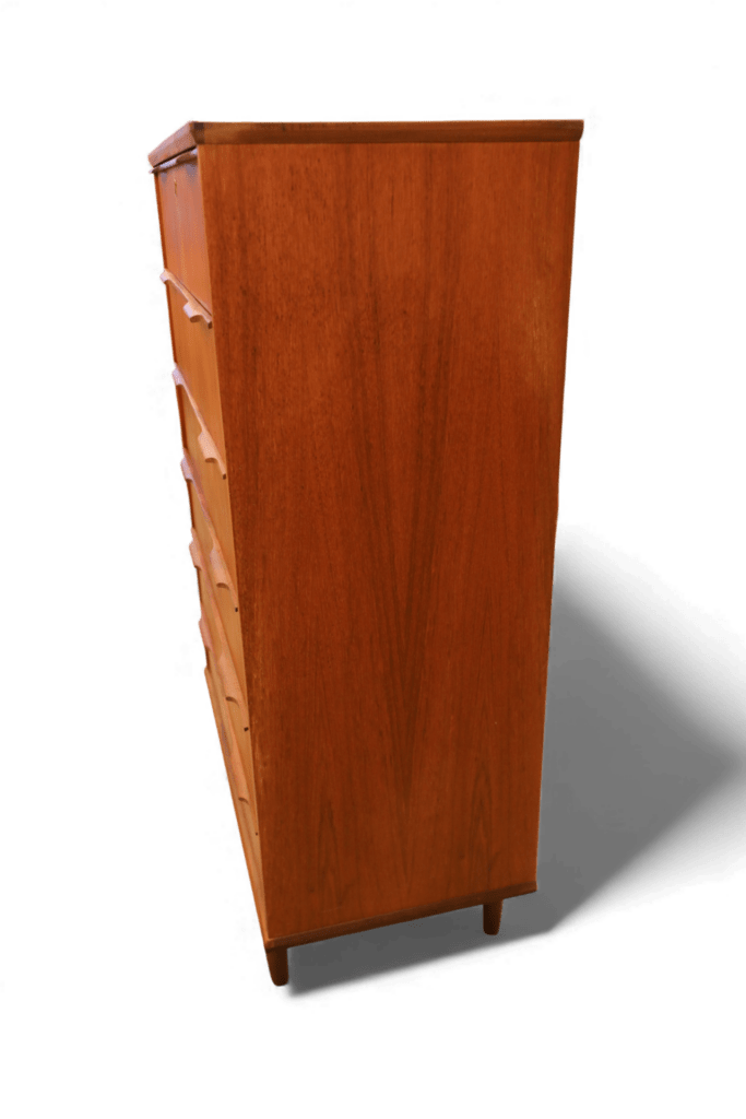 Dansk hög och rejäl byrå i teak i en stilren och tidlös modell som passar perfekt in i moderna såväl som klassiska inredningar. En underbar kombination av funktionalitet och estetik.