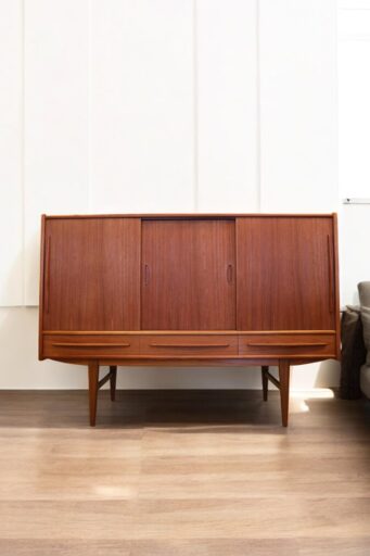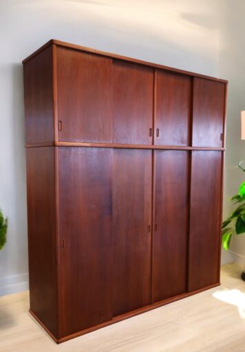 Danskt jalusiskåp i teak med flera praktiska lådor samt utrymme för pärmar, småplock och andra saker. Skåpet erbjuder mycket effektiv förvaring på liten golvyta och är samtidigt en stilren lösning för att hålla ordning och reda i din inredning!