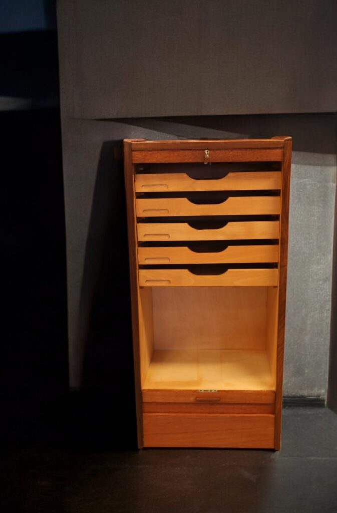 Bakom jalusiet finns fem lådor i trä som är fräscha och stadiga, vilket gör dem idealiska för förvaring. Dessa lådor erbjuder inte bara en säker plats för dina tillhörigheter, utan de ger också en snygg och organiserad känsla till rummet. Under lådorna finns det också en generös plats för pärmar samt andra viktiga dokument som du vill hålla i ordning och lätt tillgängliga.