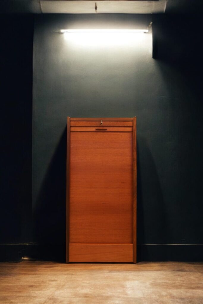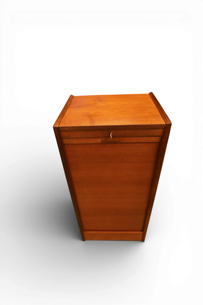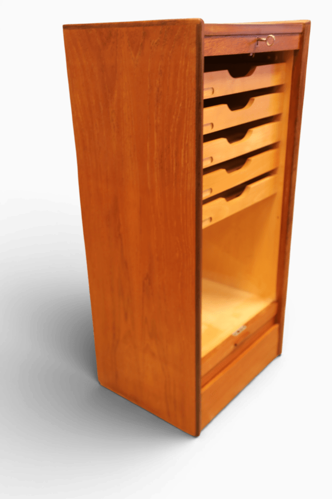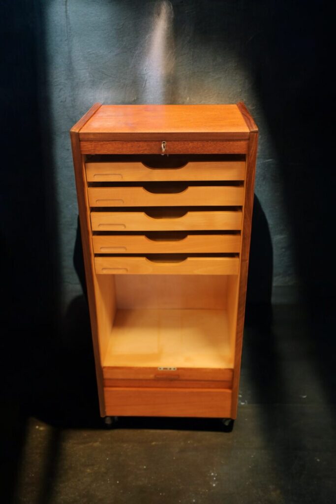 Danskt jalusiskåp i teak med flera praktiska lådor samt utrymme för pärmar, småplock och andra saker. Skåpet erbjuder mycket effektiv förvaring på liten golvyta och är samtidigt en stilren lösning för att hålla ordning och reda i din inredning!