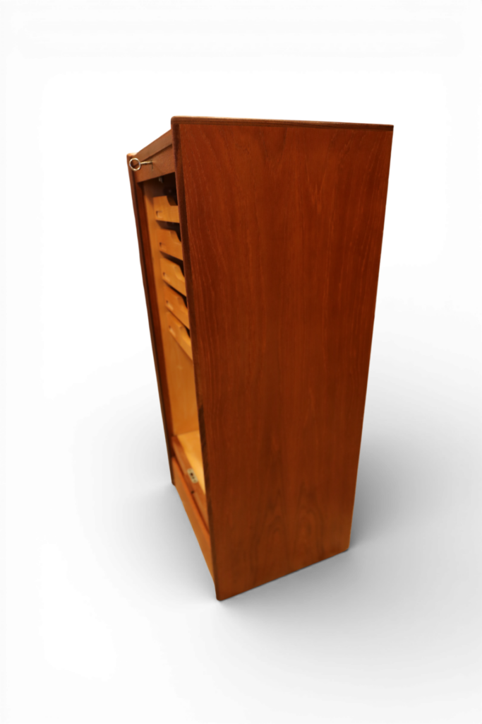 Skåpet har ett elegant jalusi på framsidan och det är tillverkat med en sådan otrolig precision att jalusiet ser ut att vara i ett helt och sammanhängande stycke och ger en känsla av både harmoni och stil.