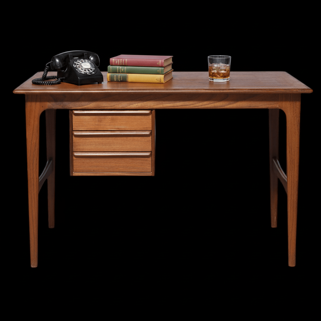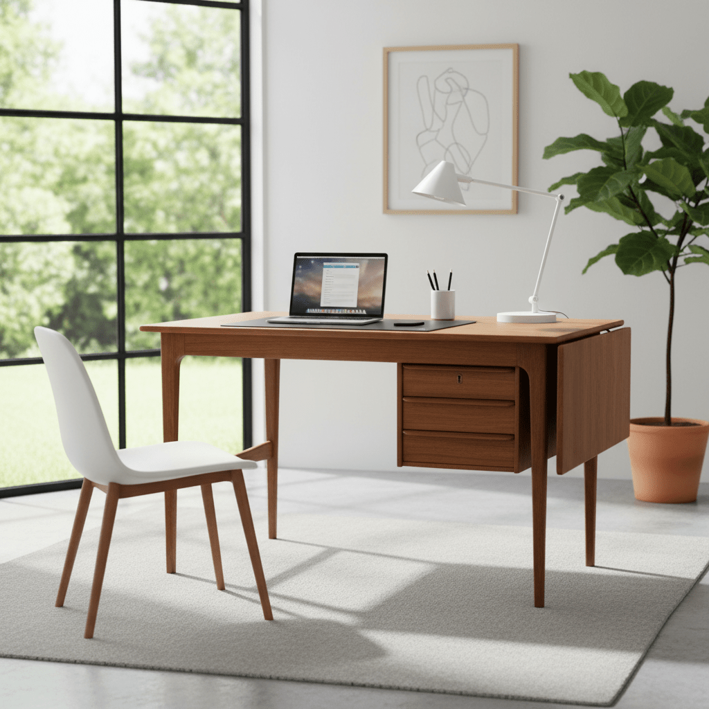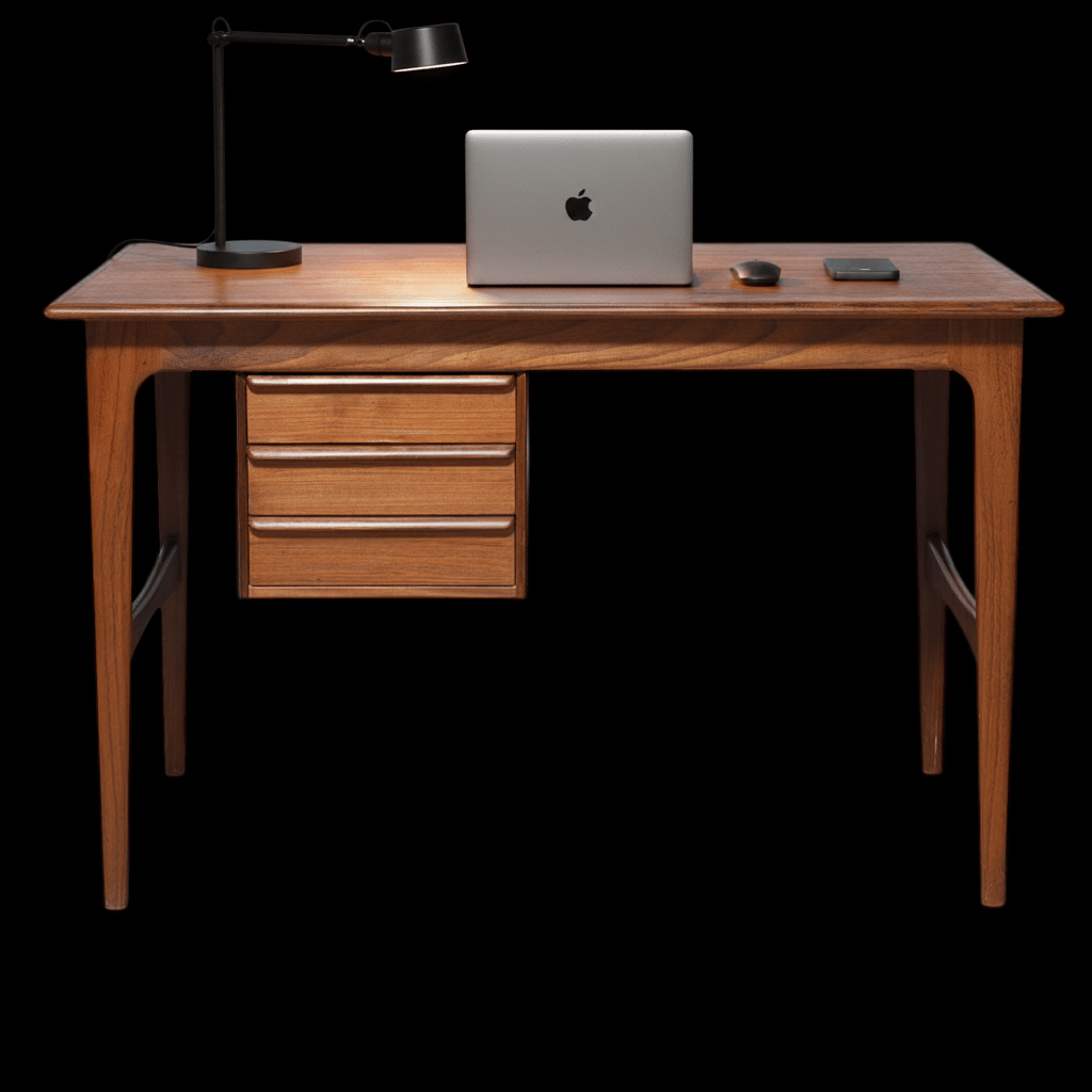 Ett elegant och välproportionerat skrivbord i teak som kombinerar stil, funktion och klassisk skandinavisk design på ett mycket fint sätt. Skrivbordet har tre lådor med vackert formade handtag, samt en fällskiva som enkelt ger extra arbetsyta vid behov.