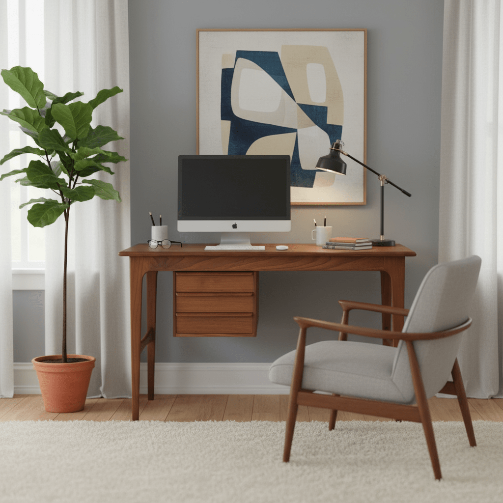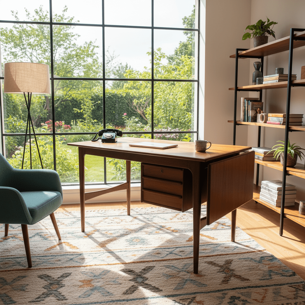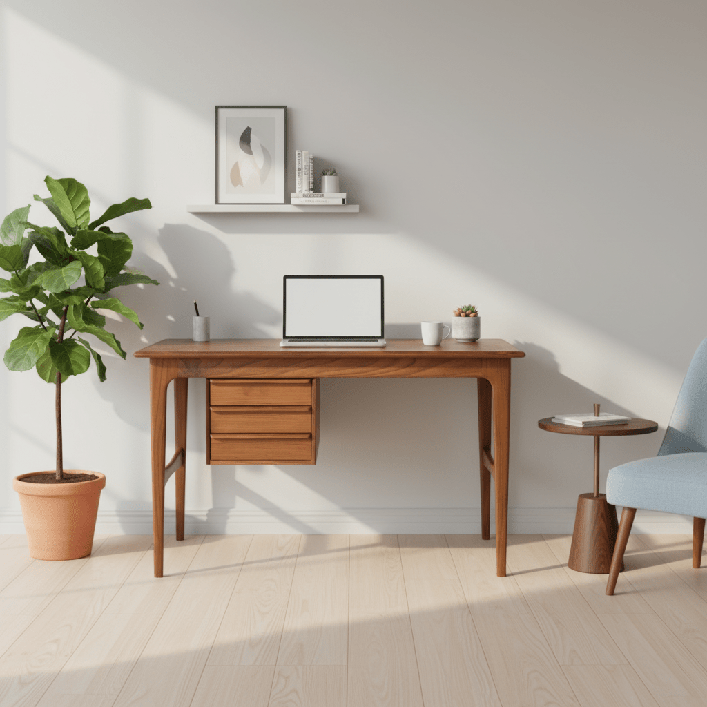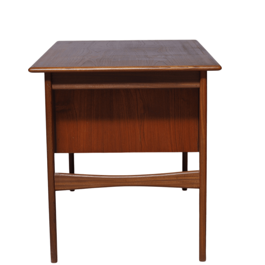 Även baksidan är utförd i teak, vilket gör att skrivbordet med fördel kan placeras fritt i rummet och inte behöver stå mot en vägg. Ett nätt, smidigt och mycket funktionellt skrivbord som passar perfekt i den mindre lägenheten, arbetsrummet eller sovrummet.