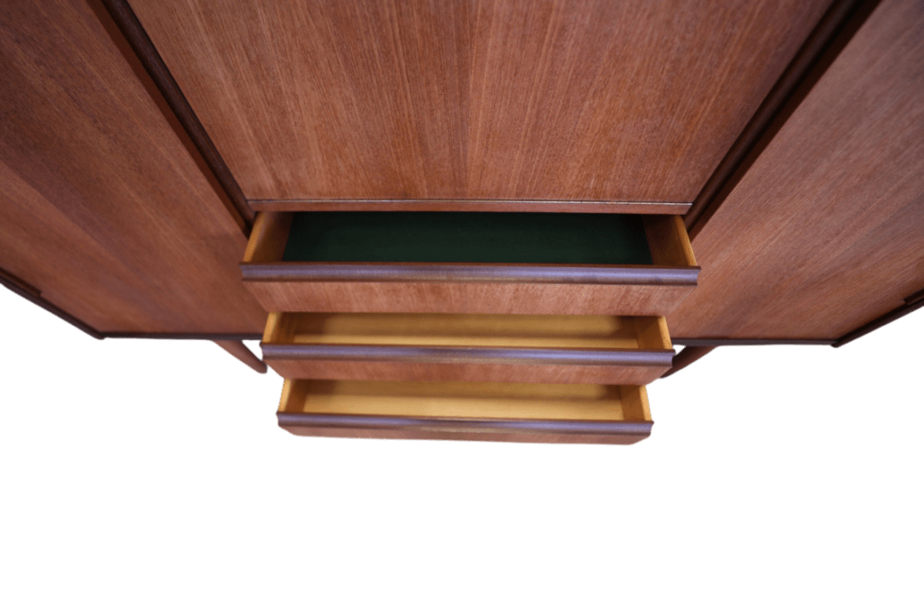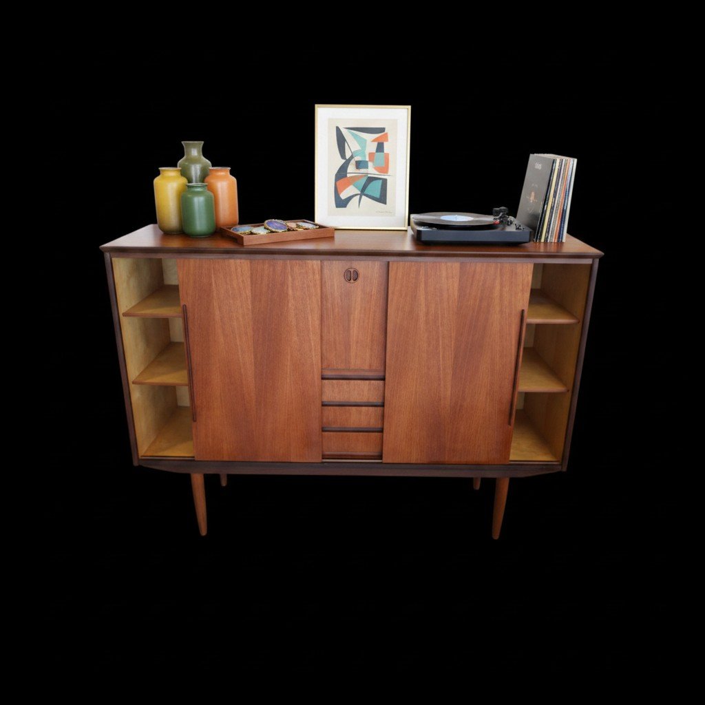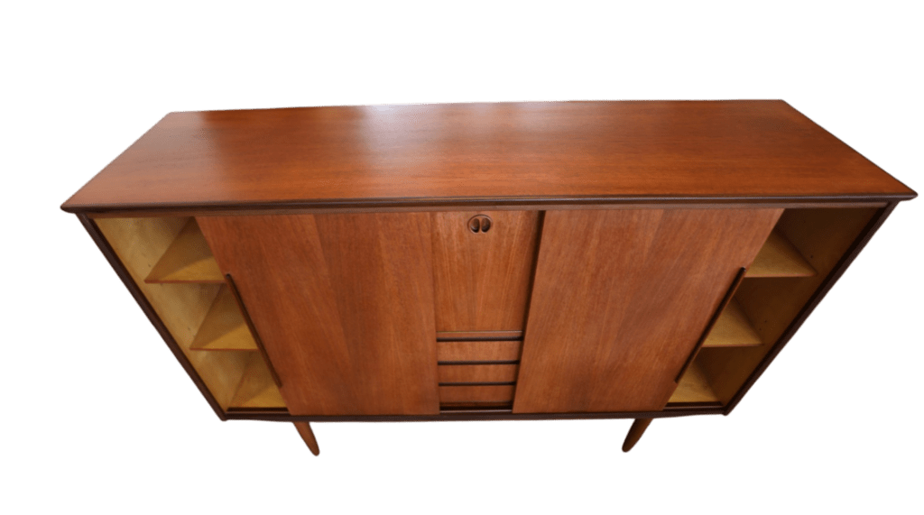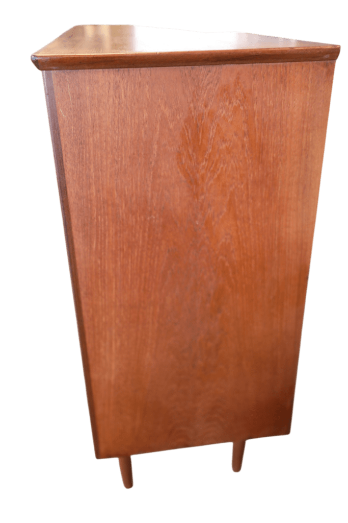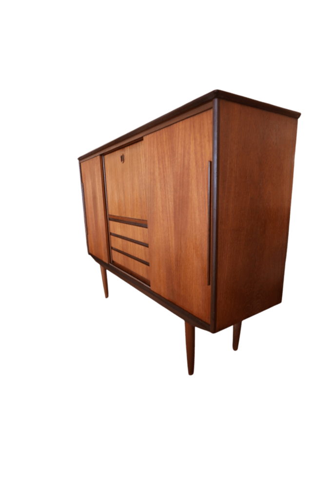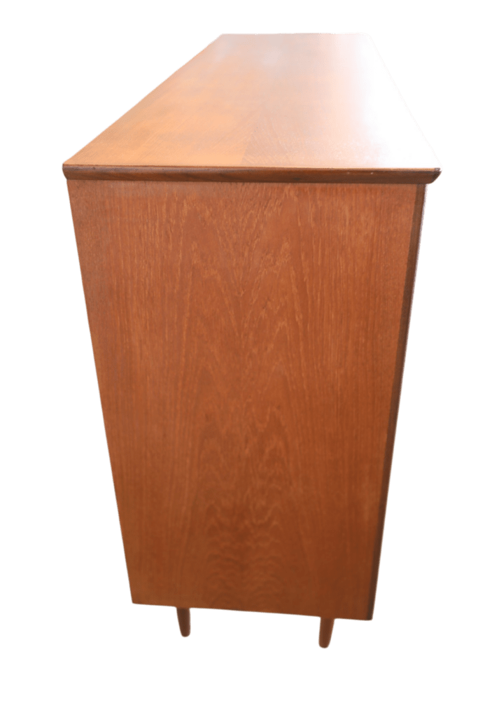 Ett makalöst vackert och mycket välgjort danskt skåp från skarven mellan 1950 och 1960-talet. Skåpet är tillverkat i teak med en gyllene, varm ton, och här märks det verkligen att formgivaren inte har sparat på vare sig materialval eller utförande.