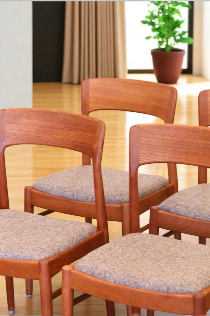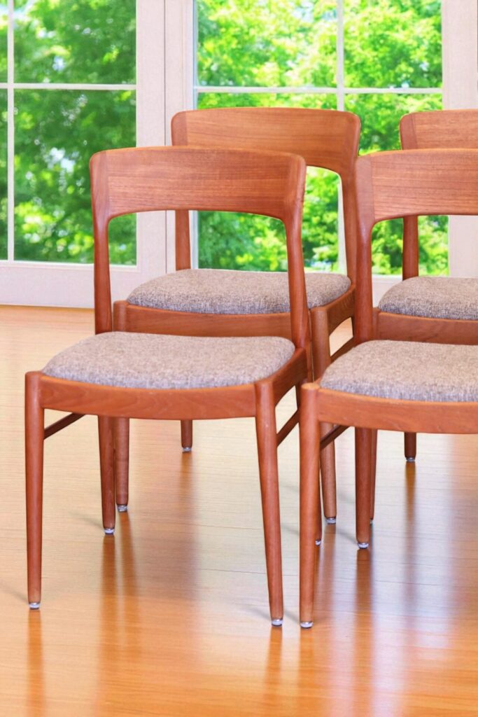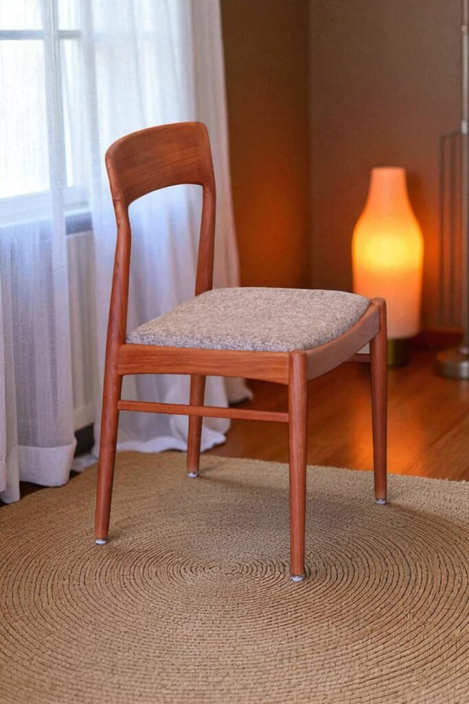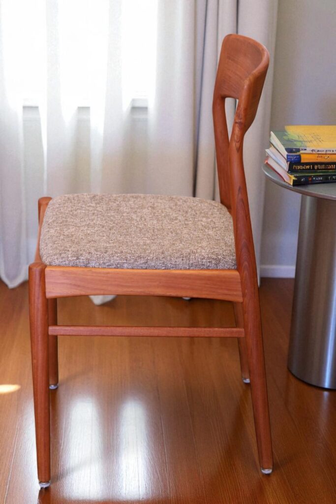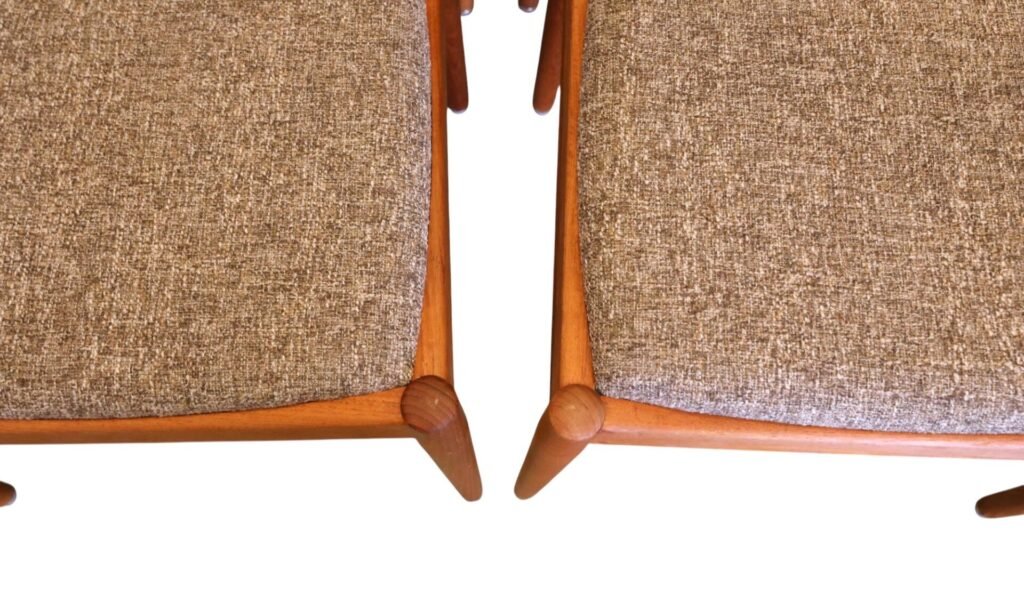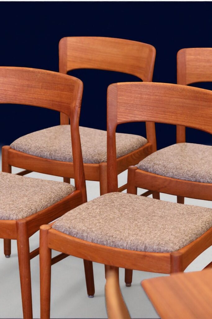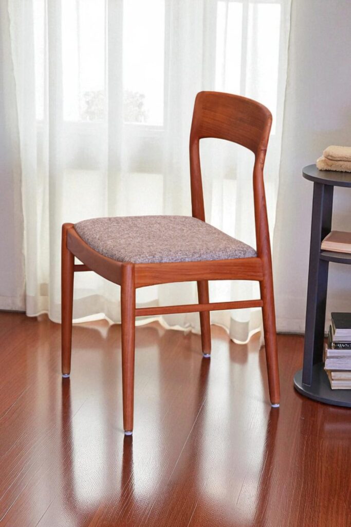 En stilren stol i gyllenbrun teak formgiven av Henning för KS Møbler i Danmark.