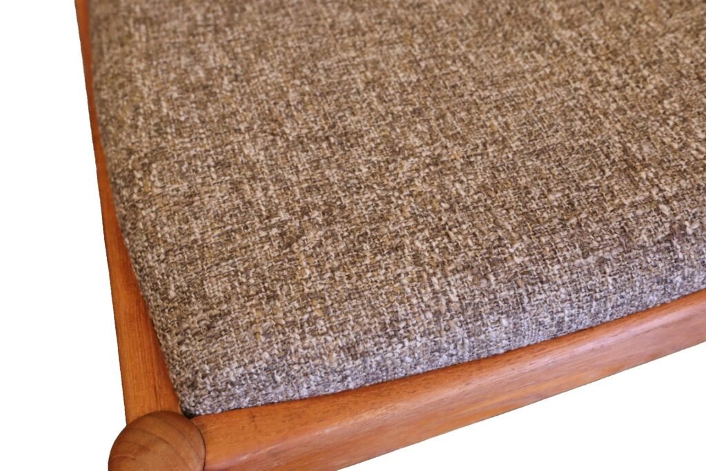 Sitsen ligger integrerad i stolens ram och är klädd i ett mjukt och hållbart boucle tyg i beigemelerad nyans. Dessutom är den försedd med ny stoppning som ger komfort och gör det bekvämt att sitta på, oavsett hur lång tid du spenderar i stolen.